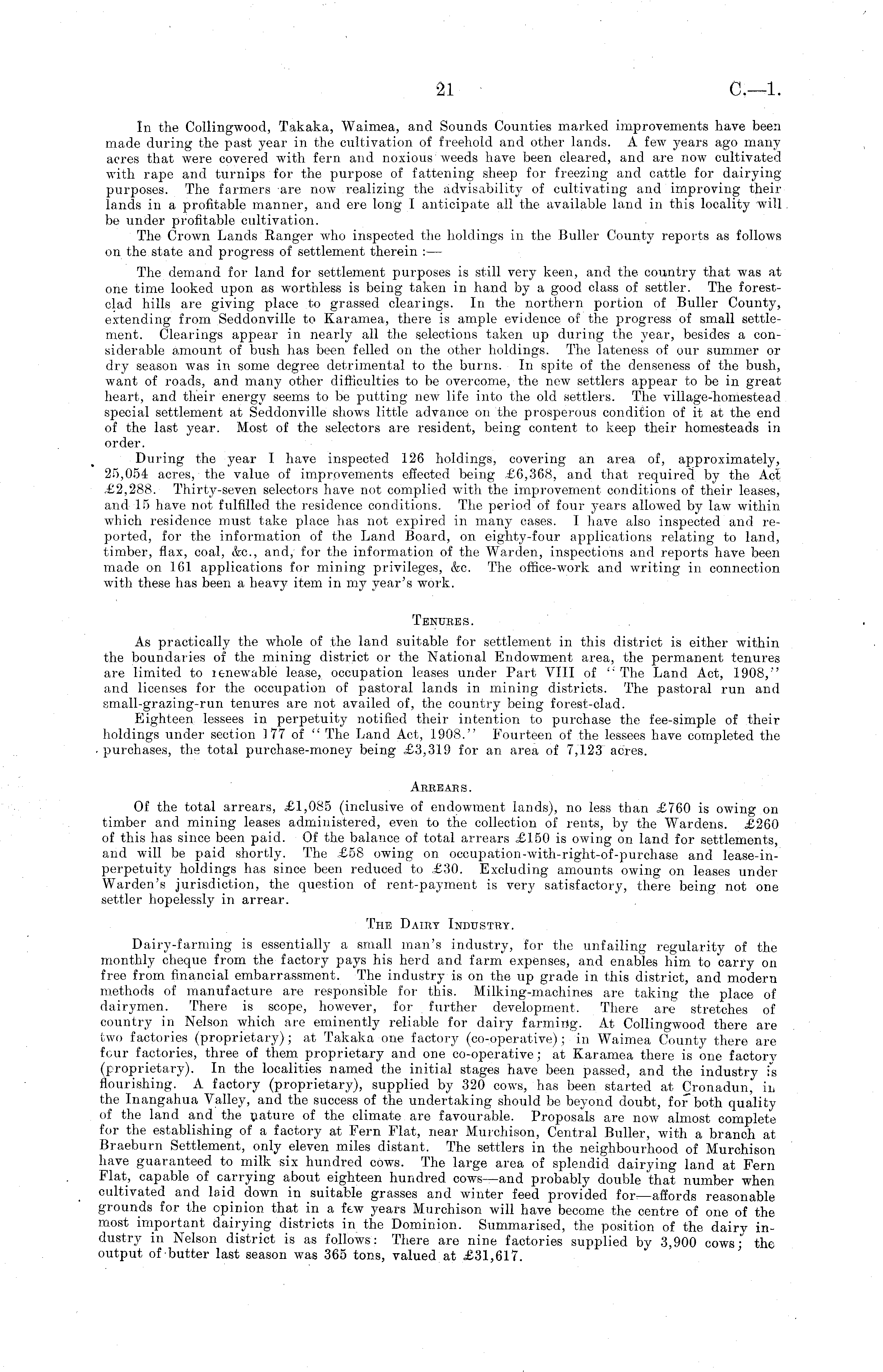 In the Collingwood, Takaka, Waimea, and Sounds Counties marked improvements have been made during the past year in the cultivation of freehold and other lands. A few years ago manyacres that were covered with fern and noxious weeds have been cleared, and are now cultivated with rape and turnips for the purpose of fattening sheep for freezing and cattle for dairyingpurposes. The farmers are now realizing the advisability of cultivating and improving their lands in a profitable manner, and ere long I anticipate all the available land in this locality will be under profitable cultivation. The Crown Lands Ranger who inspected the holdings in the Buller County reports as follows on the state and progress of settlement therein : — The demand for land for settlement purposes is still very keen, and the country that was at one time looked upon as worthless is being taken in hand by a good class of settler. The forestclad hills are giving place to grassed clearings. In the northern portion of Buller County, extending from Seddonville to Karamea, there is ample evidence of the progress of small settlement. Clearings appear in nearly all the selections taken up during the year, besides a considerable amount of bush has been felled on the other holdings. The lateness of our summer or dry season was in some degree detrimental to the burns. In spite of the denseness of the bush, want of roads, and many other difficulties to be overcome, the now settlers appear to be in great heart, and their energy seems to be putting new life into the old settlers. The village-homestead special settlement at Seddonville shows little advance on the prosperous condition of it at the end of the last year. Most of the selectors are resident, being content to keep their homesteads in order. During the year I have inspected 126 holdings, covering an area of, approximately, 25,054 acres, the value of improvements effected being £6,368, and that required by the Act £2,288. Thirty-seven selectors have not complied with the improvement conditions of their leases, and 15 have not fulfilled the residence conditions. The period of four years allowed by law within which residence must take place has not expired in many cases. I have also inspected and reported, for the information of the Land Board, on eighty-four applications relating to land, timber, flax, coal, fee., and, for the information of the Warden, inspections and reports have been made on 161 applications for mining privileges, fee. The office-work and writing in connection with these has been a heavy item in my year's work. Tenures. As practically the whole of the land suitable for settlement in this district is either within the boundaries of the mining district or the National Endowment area, the permanent tenures are limited to ic-newable lease, occupation leases under Part VIII of " The Land Act, 1908," and licenses for the occupation of pastoral lands in mining districts. The pastoral run and small-grazing-run tenures are not availed of, the country being forest-clad. Eighteen lessees in perpetuity notified their intention to purchase the fee-simple of their holdings under section 177 of " The Land Act, 1908." Fourteen of the lessees have completed the . purchases, the total purchase-money being £3,319 for an area of 7,123 acres. Arrears. Of the total arrears, £1,085 (inclusive of endowment lands), no less than £760 is owing on timber and mining leases administered, even to the collection of rents, by the Wardens. £260 of this has since been paid. Of the balance of total arrears £150 is owing on land for settlements, and will be paid shortly. The £58 owing on occupation-with-right-of-purchase and lease-in-perpetuity holdings has since been reduced to £30. Excluding amounts owing on leases under Warden's jurisdiction, the question of rent-payment is very satisfactory, there being not one settler hopelessly in arrear. The Dairy Industry. Dairy-farming is essentially a small man's industry, for the unfailing regularity of the monthly cheque from the factory pays his herd and farm expenses, and enables him to carry on free from financial embarrassment. The industry is on the up grade in this district, and modern methods of manufacture are responsible for this. Milking-machines are taking the place of dairymen. There is scope, however, for further development. There are stretches of country in Nelson which are eminently reliable for dairy farming. At Collingwood there are two factories (proprietary); at Takaka one factory (co-operative); in Waimea County there are four factories, three of them proprietary and one co-operative; at Karamea there is one factory (proprietary). In the localities named the initial stages have been passed, and the industry is flourishing. A factory (proprietary), supplied by 320 cows, has been started at Cronadun, in the Inangahua Valley, and the success of the undertaking should be beyond doubt, for both quality of the land and the nature of the climate are favourable. Proposals are now almost complete for the establishing of a factory at Fern Flat, near Murchison, Central Buller, with a branch at Braeburn Settlement, only eleven miles distant. The settlers in the neighbourhood of Murchison have guaranteed to milk six hundred cows. The large area of splendid dairying land at Fern Flat, capable of carrying about eighteen hundred cows—and probably double that number when cultivated and laid down in suitable grasses and winter feed provided for. —affords reasonable grounds for the opinion that in a few years Murchison will have become the centre of one of the most important dairying districts in the Dominion. Summarised, the position of the dairy industry in Nelson district is as follows: There are nine factories supplied by 3,900 cows;" the output of-butter last season was 365 tons, valued at £31,617.