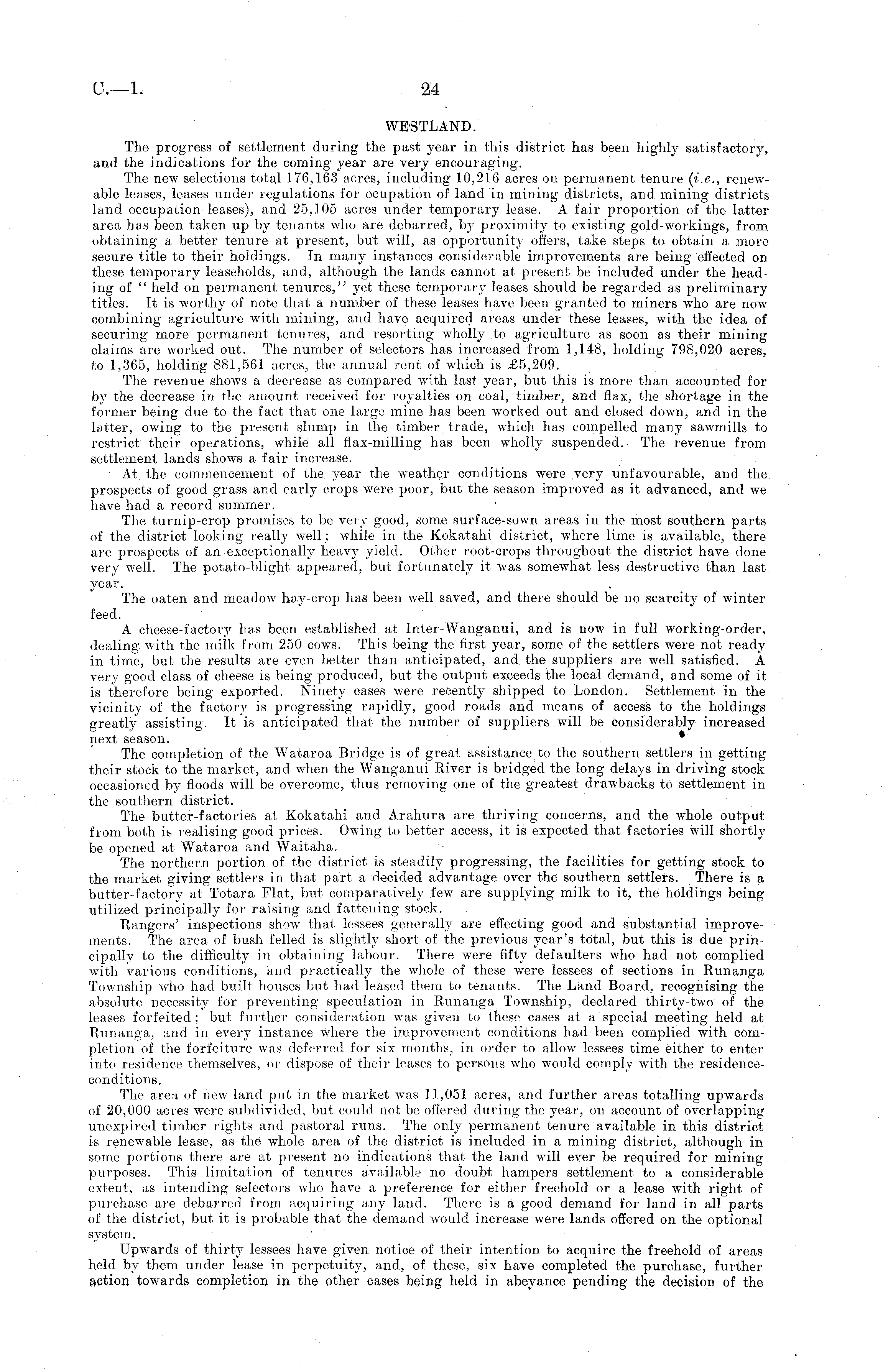 WESTLAND. The progress of settlement during the past year in this district has been highly satisfactory, and the indications for the coming year are very encouraging. The new selections total 176,163 acres, including 10,216 acres on permanent tenure (i.e., renewable leases, leases under regulations for ocupation of land in mining districts, and. mining districts land occupation leases), and 25,105 acres under temporary lease. A fair proportion of the latter area has been taken up by tenants who are debarred, by proximity to existing gold-workings, from obtaining a better tenure at present, but will, as opportunity offers, take steps to obtain a more secure title to their holdings. In many instances considerable improvements are being effected on these temporary leaseholds, and, although the lands cannot at present be included under the heading of " held on permanent tenures," yet these temporary leases should be regarded as preliminary titles. It is worthy of note that a number of these leases have been granted to miners who are now combining agriculture with mining, and have acquired areas under these leases, yvith the idea of securing more permanent tenures, and resorting wholly to agriculture as soon as their mining claims arc worked out. The number of selectors has increased from 1,148, holding 798,020 acres, to 1,365, holding 881,561 acres, the annual rent of which is £5,209. The revenue shows a decrease as compared with last year, but this is more than accounted for by the decrease in the amount received for royalties on coal, timber, and flax, the shortage in the former being due to the fact that one large mine has been worked out and closed down, and in the latter, owing to the present slump in the timber trade, which has compelled many sawmills to restrict their operations, while all flax-milling has been wholly suspended. The revenue from settlement lands shows a fair increase. At the commencement of the year the weather conditions were very unfavourable, and the prospects of good grass and early crops were poor, but the season improved as it advanced, and we have had a record summer. The turnip-crop promises to be very good, some surface-sown areas in the most southern parts of the district looking really well; while in the Kokatahi district, where lime is available, there are prospects of an exceptionally heavy yield. Other root-crops throughout the district have done very well. The potato-blight appeared, but fortunately it was somewhat less destructive than last year. The oaten and meadow haj'-crop has been well saved, and there should be no scarcity of winter feed. A cheese-factory has been established at Inter-Waiiganui, and is now in full working-order, dealing with the milk from 250 cows. This being the first year, some of the settlers were not ready in time, but the results are even better than anticipated, and the suppliers are well satisfied. A very good class of cheese is being produced, but the output exceeds the local demand, and some of it is therefore being exported. Ninety cases were recently shipped to London. Settlement in the vicinity of the factory is progressing rapidly, good roads and means of access to the holdings greatly assisting. It is anticipated that the number of suppliers will be considerably increased next season. The completion of the Wataroa Bridge is of great assistance to the southern settlers in getting their stock to the market, and when the Wanganui River is bridged the long delays in driving stock occasioned by floods will be overcome, thus removing one of the greatest drawbacks to settlement in the southern district. The butter-factories at Kokatahi and Arahura are thriving concerns, and the whole output from both is realising good prices. Owing to better access, it is expected that factories will shortly be opened at Wataroa and Waitaha. The northern portion of the district is steadily progressing, the facilities for getting stock to the market giving settlers in that part a decided advantage over the southern settlers. There is a butter-factory at Totara Flat, but comparatively few are supplying milk to it, the holdings being utilized principally for raising and fattening stock. Rangers' inspections show that lessees generally are effecting good and substantial improvements. The area of bush felled is slightly short of the previous year's total, but this is due principally to the difficulty in obtaining labour. There were fifty defaulters who had not complied with various conditions, and practically the whole of these were lessees of sections in Runanga Township who had built houses but had leased them to tenants. The Land Board, recognising the absolute necessity for preventing speculation in Runanga Township, declared thirty-two of the leases forfeited ; but further consideration was given to these cases at a special meeting held at Runanga, and in every instance where the improvement conditions had been complied with completion of the forfeiture was deferred for six months, in order to allow lessees time either to enter into residence themselves, or dispose of their leases to persons who would comply with the residenceconditions. The area of new land put in the market was 11,051 acres, and further areas totalling upwards of 20,000 acres were subdivided, but could not be offered during the year, on account of overlapping unexpired timber rights and pastoral runs. The only permanent tenure available in this district is renewable lease, as the whole area of the district is included in a mining district, although in some portions there are at present no indications that the land will ever be required for mining purposes. This limitation of tenures available no doubt hampers settlement to a considerable extent, as intending selectors who have a preference for either freehold or a lease with right of purchase are debarred from acquiring any land. There is a good demand for land in all parts of the district, but it is probable that the d