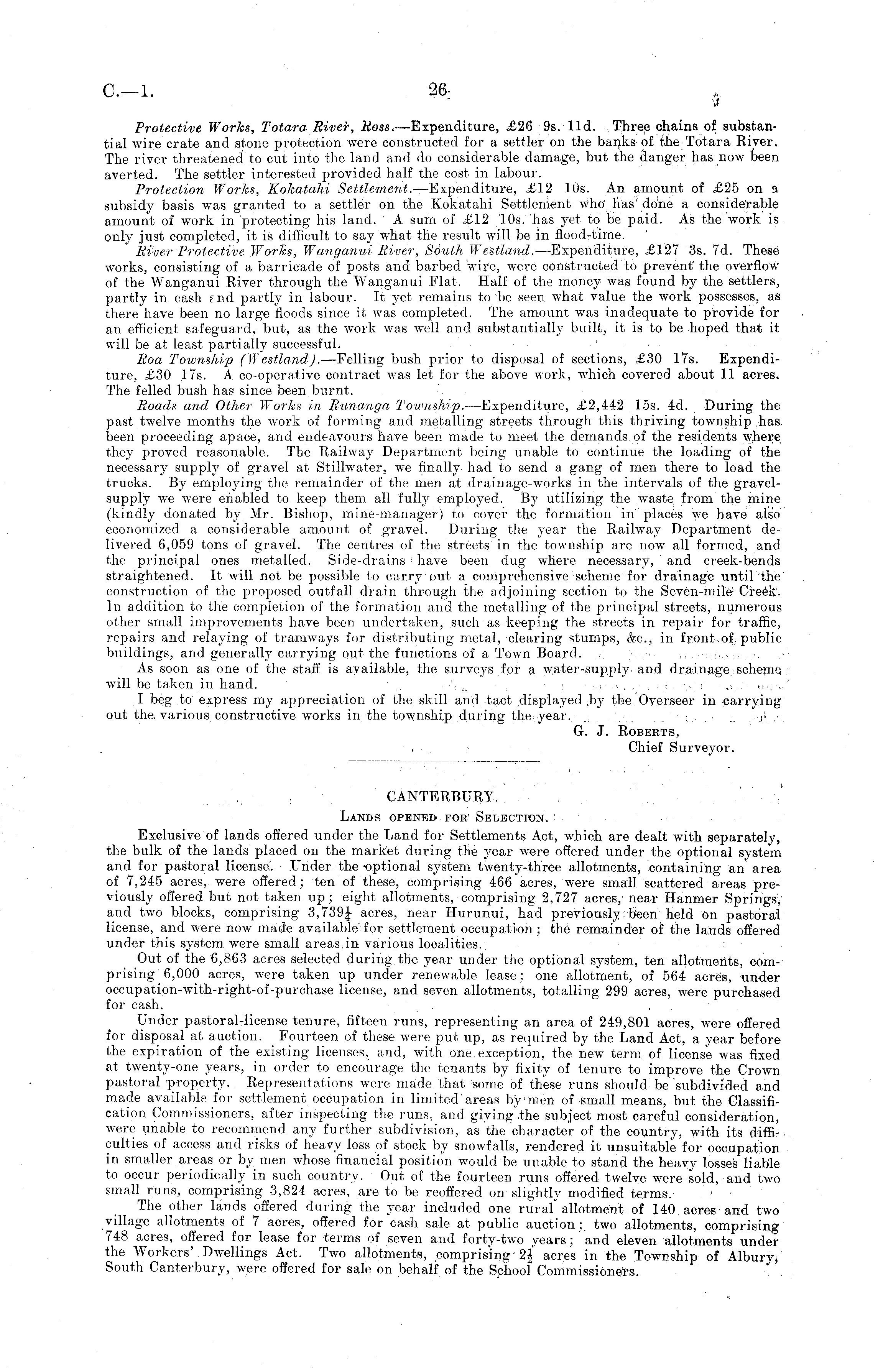 Protective Works, Totara River, Ross. —Expenditure, £26 -9s. lid. Three chains of substantial wire crate and stone protection were constructed for a settler on the banks of the Totara River. The river threatened to cut into the land and do considerable damage, but the danger has now been averted. The settler interested provided half the cost in labour. Protection Works, Kokatahi Settlement. —Expenditure, £12 10s. An amount of £25 on a subsidy basis was granted to a settler on the Kokatahi Settlement who has' done a considerable amount of work in. protecting his land. A sum of £12 10s. has yet to be paid. As the work is only just completed, it is difficult to say what the result will be in flood-time. River Protective Works, Wanganui River, South Westland. —Expenditure, £127 3s. 7d. These works, consisting of a barricade of posts and barbed wire, were constructed to prevent the overflow of the Wanganui River through the Wanganui Flat. Half of the money was found by the settlers, partly in cash fnd partly in labour. It yet remains to be seen what value the work possesses, as there have been no large floods since it was completed. The amount was inadequate to provide for an efficient safeguard, but, as the work was well and substantially built, it is to be hoped that it will be at least partially successful. Roa Township (Westland). —Felling bush prior to disposal of sections, £30 17s. Expenditure, £30 17s. A co-operative contract was let for the above work, which covered about 11 acres. The felled bush has since been burnt. Roads and Other Works in Runanga Township. —Expenditure, £2,442 15s. 4d. During the past twelve months the work of forming and metalling streets through this thriving toyvnship has been proceeding apace, and endeavours have been made to meet the demands of the residents where they proved reasonable. The Railway Department being unable to continue the loading of the necessary supply of gravel at Stillwater, we finally had to send a gang of men there to load the trucks. By employing the remainder of the men at drainage-works in the intervals of the gravelsupply we were enabled to keep them all fully employed. By utilizing the waste from the mine (kindly donated by Mr. Bishop, mine-manager) to cover the formation in places we have also economized a considerable amount of gravel. During the year the Railway Department delivered 6,059 tons of gravel. The centres of the streets in the township are now all formed, and the principal ones metalled. Side-drains have been dug where necessary, and creek-bends straightened. It will not be possible to carry out a comprehensive scheme for drainage until the construction of the proposed outfall drain through the adjoining section to the Seven-mile Creek. In addition to the completion of the formation and the metalling of the principal streets, numerous other small improvements have been undertaken, such as keeping the streets in repair for traffic, repairs and relaying of tramways for distributing metal, clearing stumps, fee, in front of public buildings, and generally carrying out the functions of a Town Board. . As soon as one of the staff is available, the surveys for a water-supply and drainage Scheme will be taken in hand. .',._„ : , . . ■ . : ... ~, . n., .. I beg to express my appreciation of the skill and tact displayed .by the Overseer in carrying out the. various constructive works in the township during the year. ... jj / G. J. Roberts, ; Chief Surveyor.