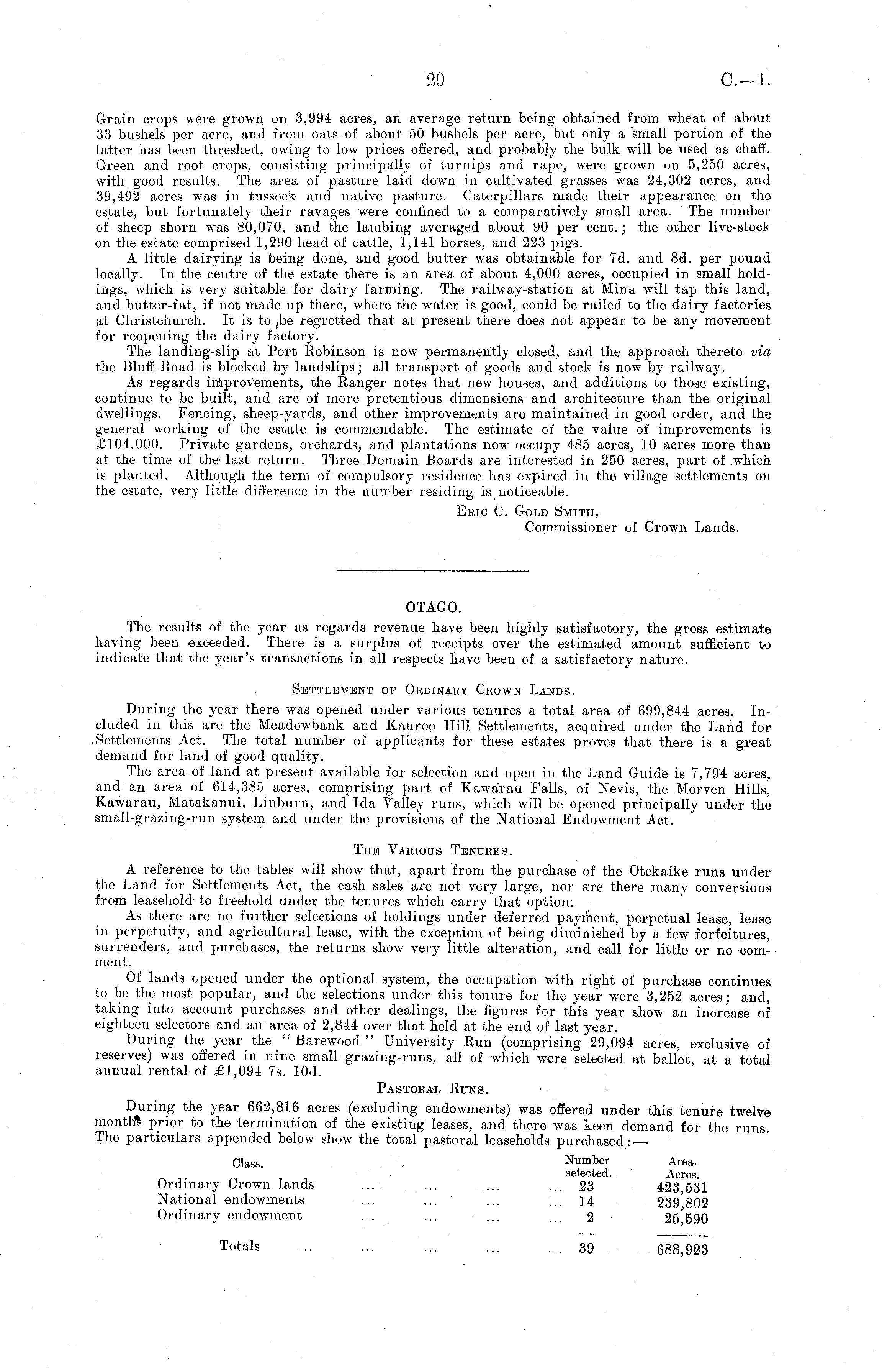 OTAGO. The results of the year as regards revenue have been highly satisfactory, the gross estimate having been exceeded. There is a surplus of receipts over the estimated amount sufficient to indicate that the year's transactions in all respects have been of a satisfactory nature. Settlement of Ordinary Crown Lands. During the year there was opened under various tenures a total area of 699,844 acres. Included in this are the Meadowbank and Kauroo Hill Settlements, acquired under the Land for Settlements Act. The total number of applicants for these estates proves that there is a great demand for land of good quality. The area of land at present available for selection and open in the Land Guide is 7,794 acres, and an area of 614,385 acres, comprising part of Kawarau Falls, of Nevis, the Morven Hills, Kawarau, Matakanui, Linburn, and Ida Valley runs, which will be opened principally under the small-grazing-run system and under the provisions of the National Endowment Act. The Various Tenures. A reference to the tables will show that, apart from the purchase of the Otekaike runs under the Land for Settlements Act, the cash sales are not very large, nor are there many conversions from leasehold to freehold under the tenures which carry that option. As there are no further selections of holdings under deferred payment, perpetual lease, lease in perpetuity, and agricultural lease, with the exception of being diminished by a few forfeitures, surrenders, and purchases, the returns show very little alteration, and call for little or no comment. Of lands opened under the optional system, the occupation with right of purchase continues to be the most popular, and the selections under this tenure for the year were 3,252 acres; and, taking into account purchases and other dealings, the figures for this year show an increase of eighteen selectors and an area of 2,844 over that held at the end of last year. During the year the " Barewood " University Run (comprising 29,094 acres, exclusive of reserves) was offered in nine small grazing-runs, all of which were selected at ballot, at a total annual rental of £1,094 7s. lOd. Pastoral Runs. During the year 662,816 acres (excluding endowments) was offered under this tenure twelve montHS prior to the termination of the existing leases, and there was keen demand for the runs. The particulars appended below show the total pastoral leaseholds purchased: — Class. Number Area. selected. Acres. Ordinary Grown lands ... ... ... ... 23 423 531 National endowments ... ... ... ... 14 239 802 Ordinary endowment ... ... ... ... 2 25 590 Totals ... ... ... ... ... 39 688,923