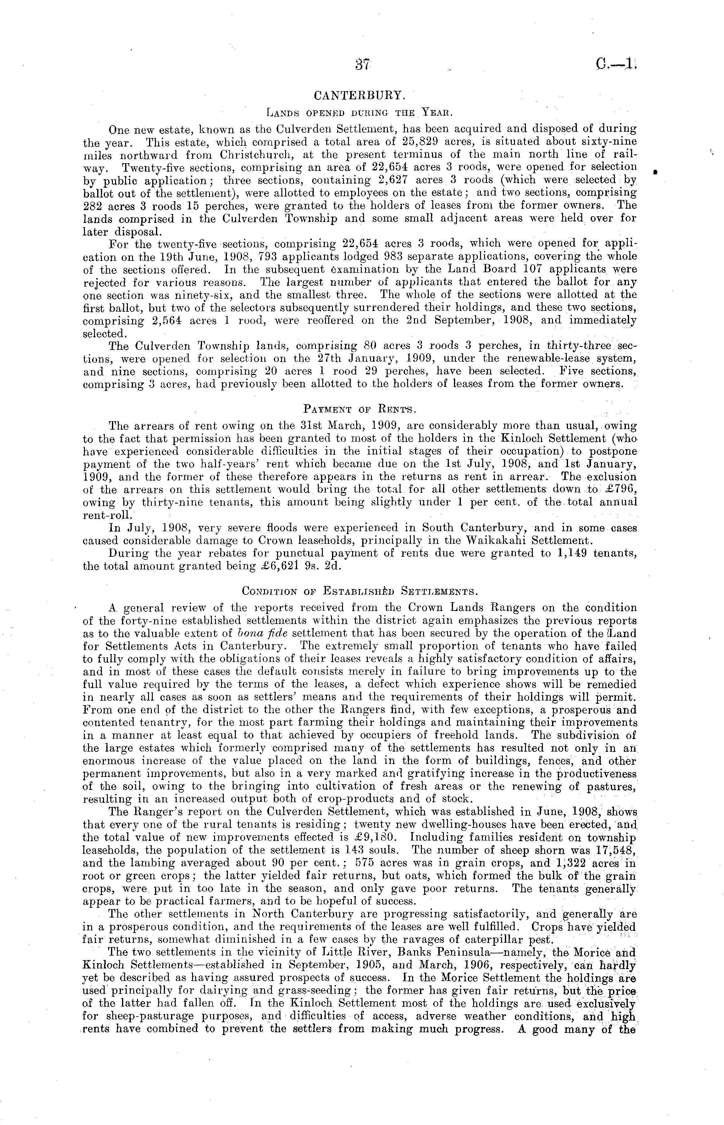 CANTERBURY. Lands opened during the Year. One new estate, known as the Culverden Settlement, has been acquired and disposed of during the year. This estate, which comprised a total area of 25,829 acres, is situated about sixty-nine miles northward from Christchurch, at the present terminus of the main north line of railway. Twenty-five sections, comprising an area of 22,654 acres 3 roods, were opened for selection by public application; three sections, containing 2,627 acres 3 roods (which yvere selected by ballot out of the settlement), were allotted to employees on the estate; and two sections, comprising 282 acres 3 roods 15 perches, were granted to the holders of leases from the former oyvners. The lands comprised in the Culverden Township and some small adjacent areas were held over for later disposal. For the twenty-five sections, comprising 22,654 acres 3 roods, which were opened for application on the 19th June, 1908, 793 applicants lodged 983 separate applications, covering the whole of the sections offered. In the subsequent examination by the Land Board 107 applicants were rejected for various reasons. The largest number of applicants that entered the ballot for any one section was ninety-six, and the smallest three. The whole of the sections were allotted at the first ballot, but two of the selectors subsequently surrendered their holdings, and these two sections, comprising 2,564 acres 1 rood, were reoffered on the 2nd September, 1908, and immediately selected. The Culverden Township lands, comprising 80 acres 3 roods 3 perches, in thirty-three sections, were opened for selection on the 27th January, 1909, under the renewable-lease system, and nine sections, comprising 20 acres 1 rood 29 perches, have been selected. Five sections, comprising 3 acres, had previously been allotted to the holders of leases from the former owners. Payment of Rents. The arrears of rent owing on the 31st March, 1909, are considerably more than usual, owing to the fact that permission has been granted to most of the holders in the Kinloch Settlement (who have experienced considerable difficulties in the initial stages of their occupation) to postpone payment of the two half-years' rent which became due on the Ist July, 1908, and Ist January, 1909, and the former of these therefore appears in the returns as rent in arrear. The exclusion of the arrears on this settlement would bring the total for all other settlements down to £796, owing by thirty-nine tenants, this amount being slightly under 1 per cent, of the total annual rent-roll. In July, 1908, very severe floods were experienced in South Canterbury, and in some cases caused considerable damage to Crown leaseholds, principally in the Waikakahi Settlement. During the year rebates for punctual payment of rents due were granted to 1,149 tenants, the total amount granted being £6,621 9s. 2d. Condition of Established Settlements. A general review of the reports received from the Croyvn Lands Rangers on the condition of the forty-nine established settlements within the district again emphasizes the previous reports as to the valuable extent of bona fide settlement that has been secured by the operation of the Land for Settlements Acts in Canterbury. The extremely small proportion of tenants who have failed to fully comply with the obligations of their leases reveals a highly satisfactory condition of affairs, and in most of these cases the default consists merely in failure to bring improvements up to the full value required by the terms of the leases, a defect which experience shows will be remedied in nearly all cases as soon as settlers' means and the requirements of their holdings will permit. From one end of the district to the other the Rangers find, with few exceptions, a prosperous and contented tenantry, for the most part farming their holdings and maintaining their improvements in a manner at least equal to that achieved by occupiers of freehold lands. The subdivision of the large estates which formerly comprised many of the settlements has resulted not only in an enormous increase of the value placed on the land in the form of buildings, fences, and other permanent improvements, but also in a very marked and gratifying increase in the productiveness of the soil, owing to the bringing into cultivation of fresh areas or the renewing of pastures, resulting in an increased output both of crop-products and of stock. The Ranger's report on the Culverden Settlement, which was established in June, 1908, shows that every one of the rural tenants is residing; twenty neyv dwelling-houses have been erected, and the total value of neyv improvements effected is £9,180. Including families resident on township leaseholds, the population of the settlement is 143 souls. The number of sheep shorn was 17,548, and the lambing averaged about 90 per cent.; 575 acres was in grain crops, and 1,322 acres in root or green crops; the latter yielded fair returns, but oats, which formed the bulk of the grain crops, were put in too late in the season, and only gave poor returns. The tenants generally appear to be practical farmers, arid to be hopeful of success. The other settlements in North Canterbury are progressing satisfactorily, and generally are in a prosperous condition, and the requirements of the leases are well fulfilled. Crops have yielded fair returns, somewhat diminished in a few cases by the ravages of caterpillar pest. The two settlements in the vicinity of Little River, Banks Peninsula—namely, the Morice and Kinloch Settlements —established in September, 1905, and March, 1906, respectively, can hardly yet be described as having assured prospects of success. In the Morice Settlement the holdings are used principally for dairying and grass-seeding; the former has given fair returns, but the price of the latter had fallen off. In the Kinloch Settlement most of the holdings are used exclusively for sheep-pasturage purposes, and difficulties of access