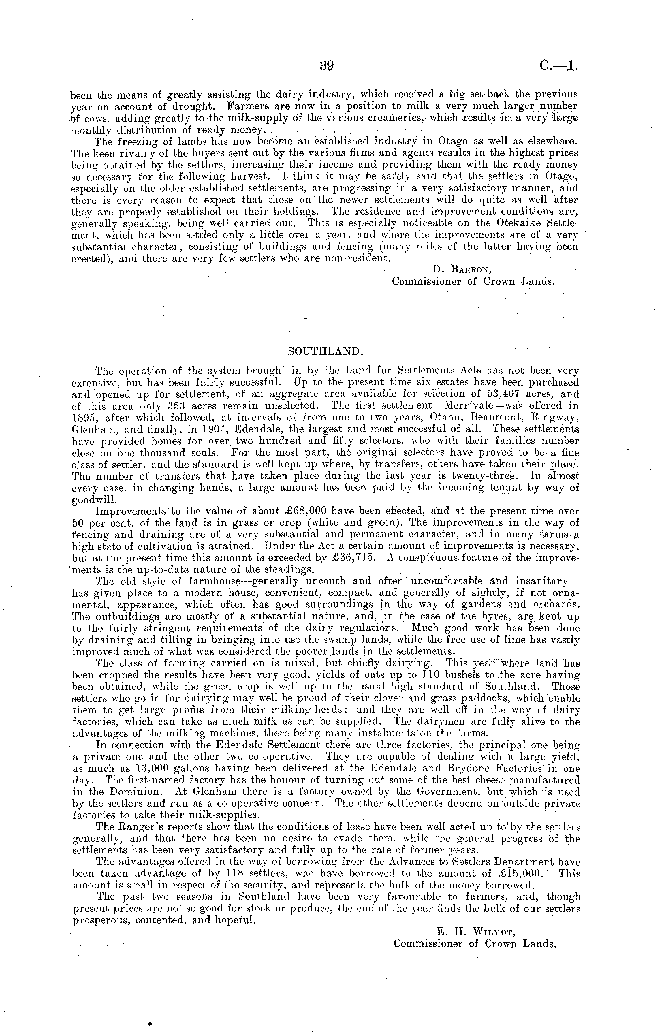 been the means of greatly assisting the dairy industry, which received a big set-back the previous year on account of drought. Farmers are now in a position to milk a very much larger number of cows, adding greatly to the milk-supply of the various creameries, which results in a very large monthly distribution of ready money. , The freezing of lambs has now become an established industry in Otago as well as elsewhere. The keen rivalry of the buyers sent out by the various firms and agents results in the highest prices being obtained by the settlers, increasing their income and providing them with the ready money so necessary for the following harvest. I think it may be safely said that the settlers in Otago, especially on the older established settlements, are progressing in a very satisfactory manner, and there is every reason to expect that those on the newer settlements will do quite as well after they are properly established on their holdings. The residence and improvement conditions are, generally speaking, being well carried out. This is especially noticeable on the Otekaike Settlement, which has been settled only a little over a year, and where the improvements are of a very substantial character, consisting of buildings and fencing (many miles of the latter having been erected), and there are very few settlers who are non-resident. D. Barron, Commissioner of Crown Lands.