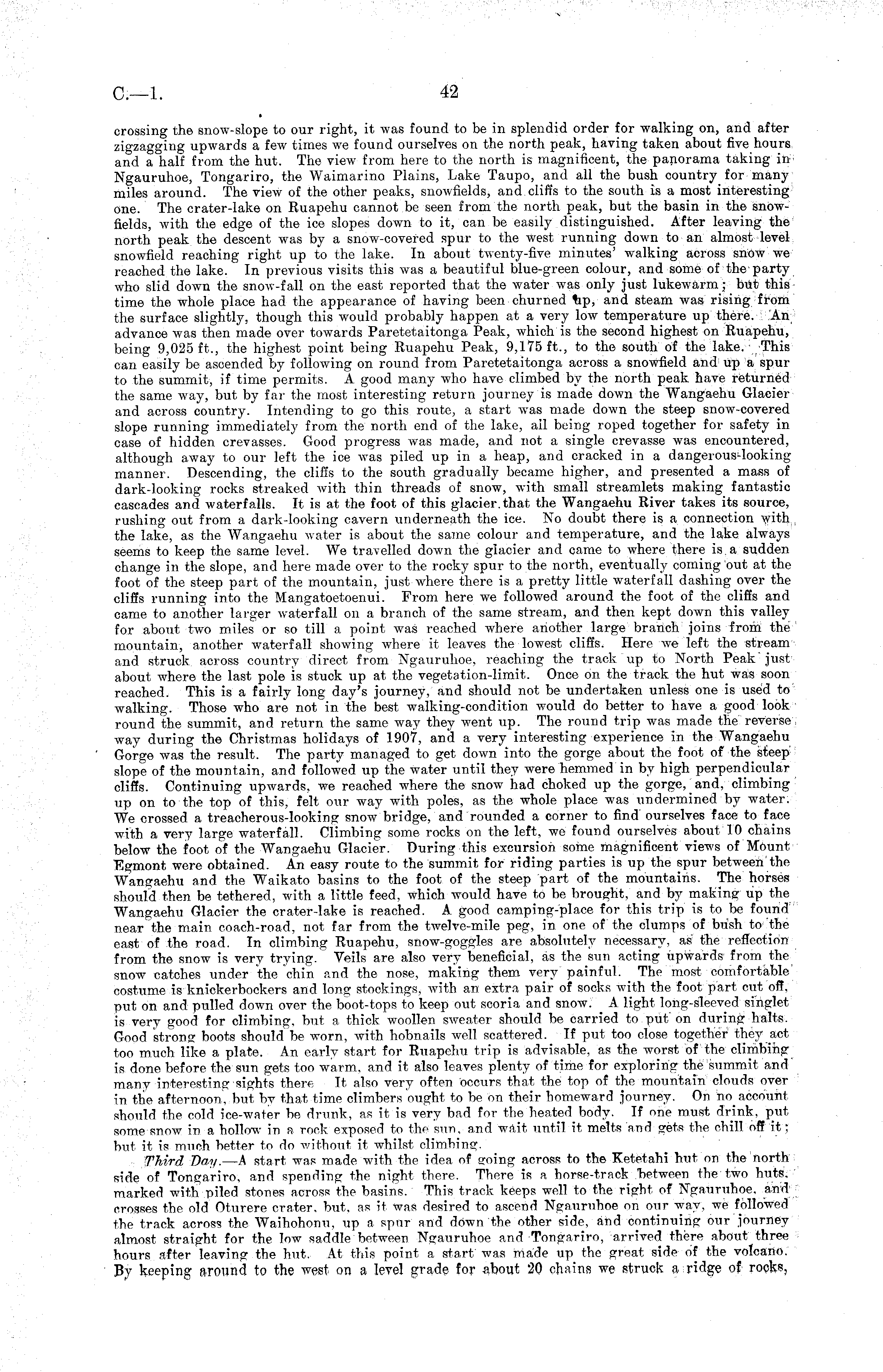 crossing the snow-slope to our right, it was found to be in splendid order for walking on, and after zigzagging upwards a few times we found ourselves on the north peak, having taken about five hours and a half from the hut. The view from here to the north is magnificent, the panorama taking inNgauruhoe, Tongariro, the Waimarino Plains, Lake Taupo, and all the bush country for many miles around. The view of the other peaks, snowfields, and cliffs to the south is a most interesting one. The crater-lake on Ruapehu cannot be seen from the north peak, but the basin in the snowfields, with the edge of the ice slopes down to it, can be easily distinguished. After leaving the north peak the descent was by a snow-covered spur to the west running down to an almost level snowfield reaching right up to the lake. In about twenty-five minutes' walking across snow we reached the lake. In previous visits this was a beautiful blue-green colour, and some of the party who slid down the snow-fall on the east reported that the water was only just lukewarm; but this time the whole place had the appearance of having been churned lip, and steam was rising from the surface slightly, though this would probably happen at a very low temperature up there. An advance was then made over towards Paretetaitonga Peak, which is the second highest on Ruapehu, being 9,025 ft., the highest point being Ruapehu Peak, 9,175 ft., to the south of the lake. This can easily be ascended by following on round from Paretetaitonga across a snowfield and up a spur to the summit, if time permits. A good many who have climbed by the north peak have returned the same way, but by far the most interesting return journey is made down the Wangaehu Glacier and across country. Intending to go this route, a start was made down the steep snow-covered slope running immediately from the north end of the lake, ail being roped together for safety in case of hidden crevasses. Good progress was made, and not a single crevasse was encountered, although away to our left the ice was piled up in a heap, and cracked in a dangerous-looking manner. Descending, the cliffs to the south gradually became higher, and presented a mass of dark-looking rocks streaked with thin threads of snow, with small streamlets making fantastic cascades and waterfalls. It is at the foot of this glacier.that the Wangaehu River takes its source, rushing out from a dark-looking cavern underneath the ice. No doubt there is a connection with the lake, as the Wangaehu water is about the same colour and temperature, and the lake always seems to keep the same level. We travelled down the glacier and came to where there is a sudden change in the slope, and here made over to the rocky spur to the north, eventually coming out at the foot of the steep part of the mountain, just where there is a pretty little waterfall dashing over the cliffs running into the Mangatoetoenui. From here we followed around the foot of the cliffs and came to another larger waterfall on a branch of the same stream, and then kept down this valley for about two miles or so till a point was reached where another large branch joins frofn the mountain, another waterfall showing where it leaves the lowest cliffs. Here we left the stream and struck across country direct from Ngauruhoe, reaching the track up to North Peak just about where the last pole is stuck up at the vegetation-limit. Once on the track the hut was soon reached. This is a fairly long day's journey, and should not be undertaken unless one is used to walking. Those who are not in the best walking-condition would do better to have a good look round the summit, and return the same way they went up. The round trip was made the reverse way during the Christmas holidays of 1907, and a very interesting experience in the Wangaehu Gorge was the result. The party managed to get down into the gorge about the foot of the steep slope of the mountain, and followed up the water until they were hemmed in by high perpendicular cliffs. Continuing upwards, we reached where the snow had choked up the gorge, and, climbing up on to the top of this, felt our way with poles, as the whole place was undermined by water. We crossed a treacherous-looking snow bridge, and rounded a corner to find ourselves face to face with a very large waterfall. Climbing some rocks on the left, we found ourselves about 10 chains below the foot of the Wangaehu Glacier. During this excursion some magnificent views of Mount Egmont were obtained. An easy route to the summit for riding parties is up the spur between the Wangaehu and the Waikato basins to the foot of the steep part of the mountains. The horses should then be tethered, with a little feed, which would have to be brought, and by making up the Wangaehu Glacier the crater-lake is reached. A good camping-place for this trip is to be found near the main coach-road, not far from the twelve-mile peg, in one of the clumps of bush to the east of the road. In climbing Ruapehu, snow-goggles are absolutely necessary, as the reflection from the snow is very trying. Veils are also very beneficial, as the sun acting upwards from the snow catches under the chin and the nose, making them very painful. The most comfortable' costume is knickerbockers and long stockings, with an extra pair of socks with the foot part cut off, put on and pulled down over the boot-tops to keep out scoria and snow. A light long-sleeved singlet is very good for climbing, but a thick woollen sweater should be carried to put on during halts. Good strong boots should be worn, with hobnails well scattered. If put too close together they act too much like a plate. An early start for Ruapehu trip is advisable, as the worst of the climbing is done before the sun gets too warm, and it also leaves plenty of time for exploring the summit and many interesting sights there It also very often occurs that the top of the mountain clouds over in the afternoon, but by that time climbers ought t