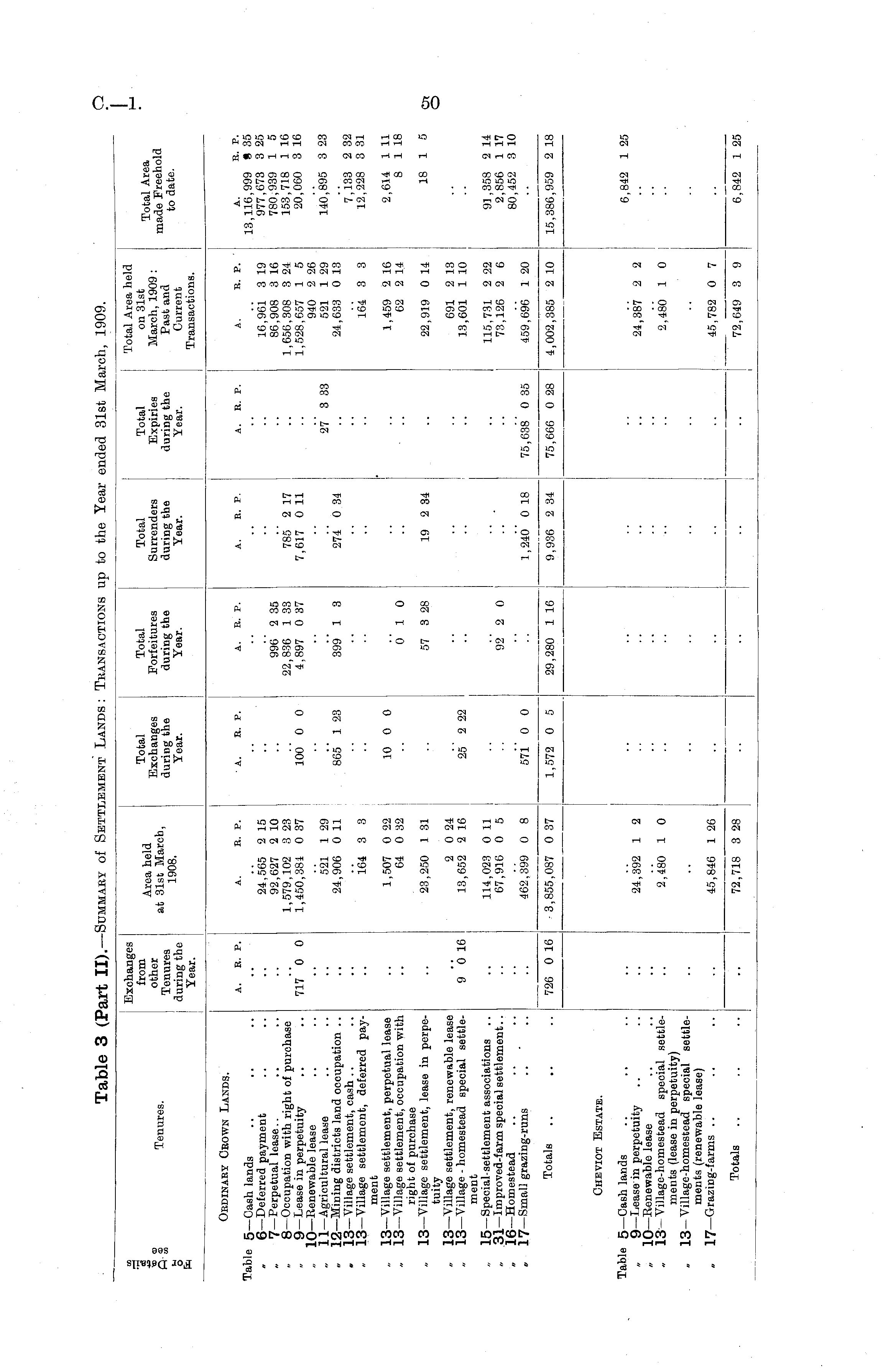 Table 3 (Part II). —Summary of Settlement Lands: Transactions up to the Year ended 31st March, 1909.