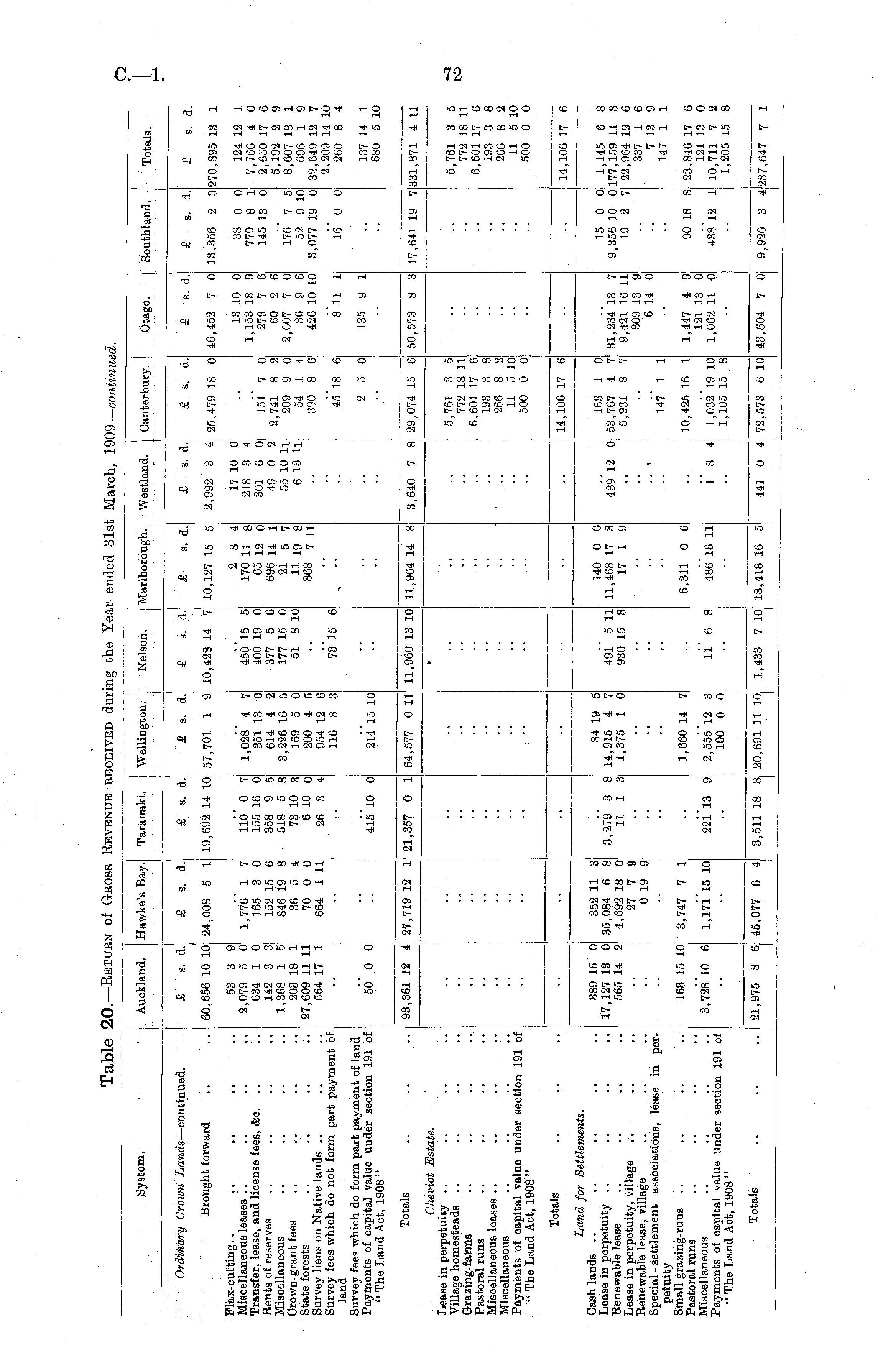 System. Auckland. Hawke's Bay. Taranaki. Wellington. Nelson. Marlborough. Westland. Canterbury. Otago. Southland. Totals. Ordinary Crown Lands —continued. £ s. d. £ s. d. £ s. d. £ s. d. £ s. d. . £ s. d. £ s. d. £ s. d. £ s. a.| £ s. d.J £ s. d. Brought forward 60,656 10 10 24,008 5 1 19,692 14 10 57,701 1 9 10,428 14 7 10,127 15 5 2,992 3 4 25,479 18 0 46,452 7 0 13,356 2 3 270,895 13 1 Flax-cutting.. Miscellaneous leases Transfer, lease, and license fees, &e. Rents of reserves Miscellaneous Crown-grant fees State forests Survey liens on Native lands Survey fees which do not form part payment of land Survey fees which do form part payment of land Payments of capital value under section 191 of "The Land Act, 1908" 53 3 9 2,079 5 0 634 1 0 142 3 3 1,368 1 5 203 18 1 27,609 11 11 564 17 1 1,776 1 7 165 3 0 152 15 6 846 19 8 36 5 4 70 0 0 664 1 11 110 0 7 155 16 0 358 9 5 518 5 8 73 10 3 6 10 0 26 3 4 1,028 4 7 351 13 0 614 4 2 3,226 16 5 169 5 0 200 4 5 954 12 6 116 3 3 450 15 5 400 19 0 • 377 5 6 177 15 0 51 8 10 2 8 4 170 11 8 65 12 0 696 14 1 21 5 7 11 19 8 868 7 ii 17 10 0 218 3 4 301 6 0 49 0 2 55 10 ll 6 13 ll 151 7 0, 2,741 8 2 209 9 0 54 1 4 390 8 6 13 10 0 1,153 13 9 279 7 6 60 2 6 2,007 7 0 36 9 6 426 10 10 38 0 0 779 8 1 145 13 0i 176 7 5 52 9 10 3,077 19 0 124 12 1 ! 7,766 4 0 2,650 17 6 :■ 5,192 2 9 j 8,607 18 1 696 1 9 32,649 12 7 2,209 14 10 260 8 4 73*15 6 ,_ 45 18 6 8 11 1 16 0 0 .. 50' 0 0 .. 415 10 0 214 15 10 2 5 0 135 9 1 137 14 1 680 5 10 • • Totals ... 64,577 0 11 11,960 13 10 11,964 14 S 93,361 12 4 27,719 12 1 21,357 0 1 3,640 7 8 29,074 15 6 50,573 8 3l 17,641 19 7; 1331,871 4 11 Cheviot Estate. Lease in perpetuity Village homesteads Grazing- farms Pastoral runs Miscellaneous leases .. Miscellaneous Payments of capital value under section 191 of "The Land Act, 1908" ■ I I ' 5,761 3 5 772 18 11 6,601 17 6 193 3 8 266 8 2 11 5 10 500 0 0 5,761 3 5 772 18 11 6,601 17 6 193 3 8 266 8 2 11 5 10 500 0 0 - - .. Totals i 14,106 17 6 14,106 17 6 Land for Settlements. Cash lands Lease in perpetuity Eenewable lease Lease in perpetuity, village Eenewable lease, village Special - settlement associations, lease in perpetuity Small grazing-runs Pastoral runs Miscellaneous Payments of capital value under section 191 of "The Land Act, 1908" 389 15 0 17,127 13 0 565 14 2 352 11 3 35,084 6 8 4,692 18 0 27 7 9 0 19 9 3,279 3 8 11 1 3 84 19 5 14,915 4 7 1,375 1 0 491 5 11 930 15 3 140 0 0 11,463 17 3 17 1 9 439 12 0 163 1 0 53,767 4 7 5,931 8 7 147 1 1 31,234 13 7 9,421 16 11 309 13 9 6 14 0 ■• ] ■ 15 0 0 9,356 10 0 19 2 7 I •• 1,145 6 8 177,159 11 3 22,964 19 6 337 1 6 7 13 9 147 1 1 163 15 10 3,747 7 1 1,660 14 7 6,311 0 6 .. 10,425 16 1 1,447 4 9 121 13 0 1,062 11 0 90 18 8 23,846 17 6 121 13 0 10,711 7 2 1,205 15 8 3,72810 6 1,171 15 10 221' 13 9 2,555 12 3 100 0 0 ll' 6 8 486 16 11 18 4 1,032 19 10 1,105 15 8 438*12 1 .. • ■ 1 ! Totals 237,647 7 1 21,975 8 6 45,077 6 4 3,511 18 8j 20,691 11 10 1,433 7 10| 18,418 16 5 44! 0 4 72,573 6 10f 43,604 7 01 9,920 3 4|