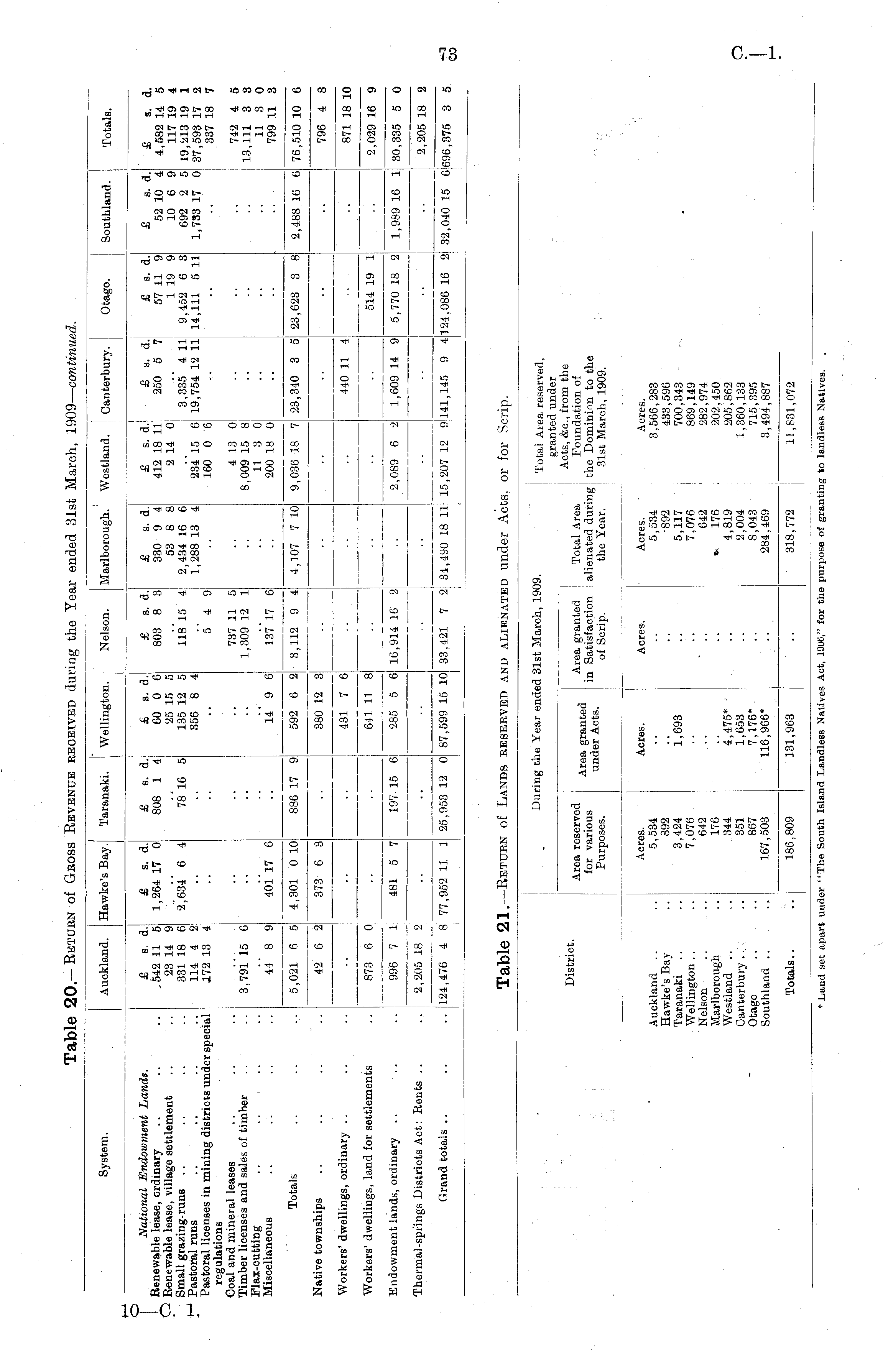 System. Auckland. Hawke's Bay. Taranaki. j Wellington. Nelson. Marlborough. Westland. ] Canterbury. Otago. Southland. Totals. National Endowment Lands. Renewable lease, crdinary .. Renewable lease, village settlement .. Small grazing-runs Pastoral runs Pastoral licenses in mining districts under special regulations Coal and mineral leases Timber licenses and sales of timber Flax-cutting Miscellaneous £ s. d. ,542 11 5 23 14 9 331 18 6 114 4 2 172 13 4 £ s. d. 1,264 17 0 2,634* 6 4 £ s. d.' 808 1 4! 78 16 5 £ s. d. 60 0 6 25 15 5 135 12 5 356 8 4 £ s. d. 803 8 3 118 15 4 5 4 9| £ s. d. 330 9 4 53 8 8 2,434 16 6 ! 1,288 13 4 £ s. d. 412 18 11 2 14 0 234 15 6 160 0 6 £ s. d. 250 5 7 3,335 4 11 19,754 12 11 £ s. d. 57 11 9 1 19 9 9,452 6 3 14,111 5 11 £ s. d. 52 10 4 10 6 9 692 2 5 1,733 17 0 £ s. d. 4,582 14 5 117 19 4 19,213 19 1 37,593 17 2 337 18 7 3,791 15 6 737 11 5 1,309 12 1 4 13 0 8,009 15 8 11 3 0 200 18 0 742 4 5 13,111 3 3 11 3 0 799 11 3 .. 44 8 9' 401 17 6 14* 9 6 137* 17 a •• • - Totals ! 5,021 6 5 4,301 0 10 886 17 9 592 6 2 3,112 9 4 i 4,107 7 10 9,036 18 7 23,340 3 5 23,623 3 8 2,488 16 6 76,510 10 6 796 4 8 l I i 1 Native townships 42 6 2| 373 6 3 380 12 3 •• Workers' dwellings, ordinary 431 7 6 .. 440 11 4! 871 18 10 •■ Workers' dwellings, land for settlements 873 6 0 .. ; 641 11 8 514 19 1 2,029 16 9 •■ Endowment lands, ordinary 996 7 1 481 5 7 197 15 6: 285 5 6 16,914 10 2 2,089 6 2 1,609 14 9J 5,770 18 2 1,989 16 1 30,335 5 0 Thermal-springs Districts Act: Rents .. 2,205 18 2 ■ •■ 2,205 18 2 •• Grand totals 124,476 4 8 77,952 11 1 ! 1 25,953 12 0! 87,599 15 10 33,421 7 2 34,490 18 11 15,207 12 9 j 141,145 9 4124,086 16 2 32,040 15 6| :696,375 3 5