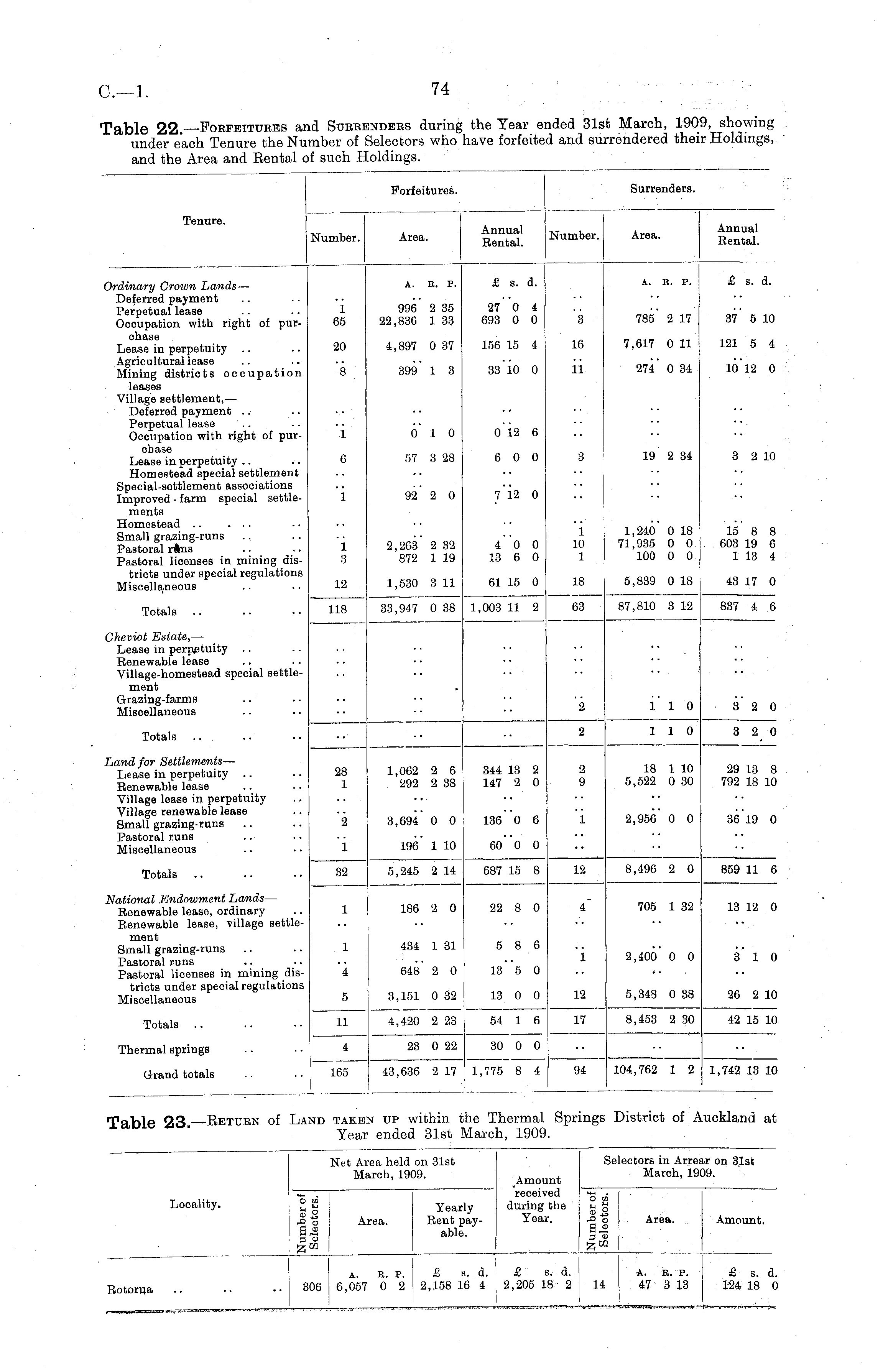 Tenure. Number. Forfeitures. Surrenders. Area. Annual Rental. Number. Area. Annual Rental. Ordinary Crown Lands — Deferred payment Perpetual lease Occupation with right of purchase Lease in perpetuity Agricultural lease Mining districts occupation leases Village settlement, — Deferred payment Perpetual lease Occupation with right of purchase Lease in perpetuity Homestead special settlement Special-settlement associations Improved - farm special settlements Homestead .. . • ■ Small grazing-runs Pastoral r#ns Pastoral licenses in mining districts under special regulations Miscellaneous A. E. P. £ s. d. A. B. P. £ s. d. 1 65 996 2 35 22,836 1 33 27 0 4 693 0 0 *3 785 2 17 37 5 10 20 4,897 0 37 156 15 4 16 7,617 0 11 121 5 4 8 399* 1 3 33 10 0 ii 274* 0 34 10*12 0 i 0 10 0 12 6 6 57 3 28 6 0 0 3 19 2 34 3 2 10 i 92* 2 0 7 12 0 i 3 2,263 2 32 872 1 19 4 0 0 13 6 0 1 10 1 1,240 0 18 71,935 0 0 100 0 0 15 8 8 603 19 6 1 13 4 12 1,530 3 11 61 15 0 18 5,839 0 18 43 17 0 Totals 118 33,947 0 38 1,003 11 2 63 87,810 3 12 837 4 6 Cheviot Estate, — Lease in perpetuity Renewable lease Village-homestead special settlement Grazing-farms Miscellaneous 2 i 1 0 3* 2 0 Totals 110 3 2 0 Land for Settlements — Lease in perpetuity Renewable lease Village lease in perpetuity Village renewable lease Small grazing-runs Pastoral runs Miscellaneous 28 1 1,062 2 6 292 2 38 344 13 2 147 2 0 136 0 6 2 9 1 18 1 10 5,522 0 30 2,956* 0 0 29 13 8 792 18 10 36 19 0 *2 3,694 0 0 i 196* 1 10 60 0 0 Totals .. 32 5,245 2 14 687 15 8 12 8,496 2 0 859 11 6 National Endowment Lands — Renewable lease, ordinary Renewable lease, village settlement Small grazing-runs Pastoral runs Pastoral licenses in mining districts under special regulations Miscellaneous 1 1 186 2 0 434 1 31 22 8 0 5 8 6 i i 705 1 32 2,400* 0 0 13 12 0 310 "i 648* 2 0 13 5 0 5 3,151 0 32 13 0 0 12 5,348 0 38 26 2 10 Totals .. 11 4,420 2 23 54 1 6 17 8,453 2 30 42 15 10 Thermal springs 23 0 22 30 0 0 Grand totals 165 43,636 2 17 1,775 8 4 94 104,762 1 2 1,742 13 10