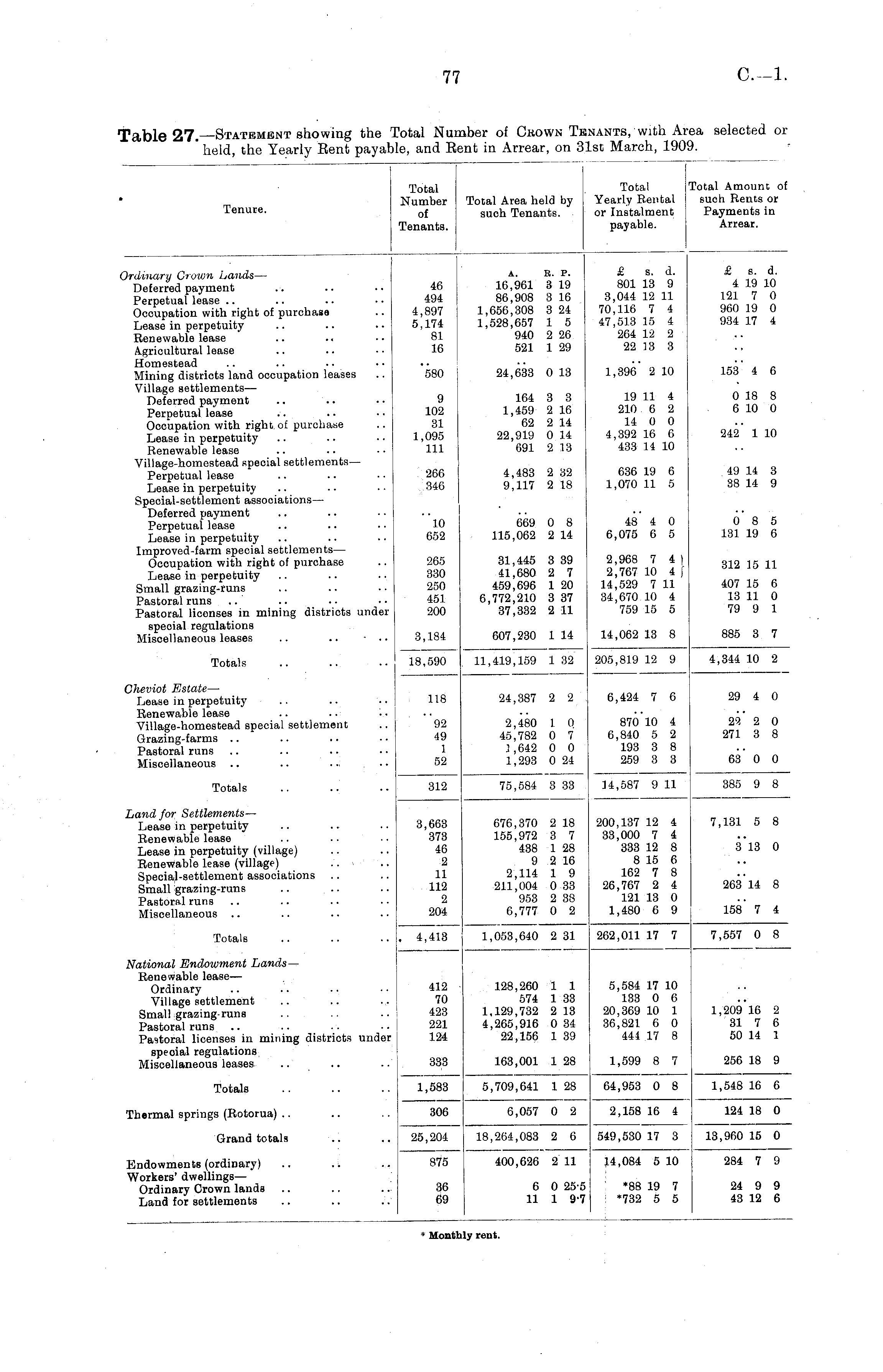 Tenure. Total Number of Total Area held by such Tenants. Total Yearly Rental or Instalment payable. Total Amount o such Rents or Payments in Arrear. Tenants. Ordinary Crown Lands — Deferred payment Perpetual lease Occupation with right of purchase Lease in perpetuity Renewable lease Agricultural lease Homestead Mining districts land occupation leases Village settlements — Deferred payment Perpetual lease Occupation with right of purchase Lease in perpetuity Renewable lease Village-homestead special settlements — Perpetual lease Lease in perpetuity Special-settlement associations — Deferred payment Perpetual lease Lease in perpetuity Improved-farm special settlements — Occupation with right of purchase Lease in perpetuity Small grazing-runs Pastoral runs Pastoral licenses in mining districts under speoial regulations Miscellaneous leases .. .. • .. 46 494 4,897 5,174 81 16 *580 9 102 31 1,095 111 16,961 3 19 86,908 3 16 1,656,308 3 24 1,528,657 1 5 940 2 26 521 1 29 24,633 0 13 164 3 3 1,459 2 16 62 2 14 22,919 0 14 691 2 13 £ s. d. 801 13 9 3,044 12 11 70,116 7 4 47,513 15 4 264 12 2 22 13 3 1,396 2 10 19 11 4 210 . 6 2 14 0 0 4,392 16 6 433 14 10 £ s. d. 4 19 10 121 7 0 960 19 0 934 17 4 153 4 6 0 18 8 6 10 0 242 1 10 49 14 3 38 14 9 266 346 4,483 2 32 9,117 2 18 636 19 6 1,070 11 5 "lO 652 669 0 8 115,062 2 14 48 4 0 6,075 6 5 0* 8 5 131 19 6 265 330 250 451 200 31,445 3 39 41,680 2 7 459,696 1 20 6,772,210 3 37 37,332 2 11 2,968 7 4 ) 2,767 10 4 f 14,529 7 11 34,670 10 4 759 15 5 312 15 11 407 15 6 13 11 0 79 9 1 3,184 607,230 1 14 14,062 13 8 885 3 7 Totals 18,590 11,419,159 1 32 205,819 12 9 4,344 10 2 Cheviot Estate — Lease in perpetuity Renewable lease .. .. • • Village-homestead special settlement Grazing-farms Pastoral runs Miscellaneous 118 92 49 1 52 24,387 2 2 2,480 1 0 45,782 0 7 1,642 0 0 1,293 0 24 6,424 7 6 870 10 4 6,840 5 2 193 3 8 259 3 3 29 4 0 22* 2 0 271 3 8 63* 0 0 Totals 312 75,584 3 33 14,587 9 11 385 9 8 Land for Settlements— Lease in perpetuity Renewable lease Lease in perpetuity (village) Renewable lease (village) Special-settlement associations Small grazing-runs Pastoral runs Miscellaneous 3,663 373 46 2 11 112 2 204 676,370 2 18 155,972 3 7 438 1 28 9 2 16 2,114 1 9 211,004 0 33 953 2 38 6,777 0 2 200,137 12 4 33,000 7 4 333 12 8 8 15 6 162 7 8 26,767 2 4 121 13 0 1,480 6 9 7,131 5 8 313 0 263 14 8 158* 7 4 Totals . 4,413 1,053,640 2 31 262,011 17 7 7,557 0 8 National Endowment Lands— Renewable lease— Ordinary Village settlement Small grazing-runs Pastoral runs Pastoral licenses in mining districts under special regulations Miscellaneous leases 412 70 423 221 124 128,260 1 1 574 1 33 1,129,732 2 13 4,265,916 0 34 22,156 1 39 5,584 17 10 133 0 6 20,369 10 1 36,821 6 0 441 17 8 1,209 16 2 31 7 6 50 14 1 333 163,001 1 28 1,599 8 7 256 18 9 Totals 1,583 5,709,641 1 28 64,953 0 8 1,548 16 6 Thermal springs (Rotorua) 306 6,057 0 2 2,158 16 4 124 18 0 Grand totals 25,204 18,264,083 2 6 549,530 17 3 13,960 15 0 Endowments (ordinary) Workers' dwellings— Ordinary Orown lands Land for settlements 875 36 69 400,626 2 11 6 0 25-5 11 1 9-7 14,084 5 10 *88 19 7 *732 5 5 284 7 9 24 9 9 43 12 6 * Month] ly rent.
