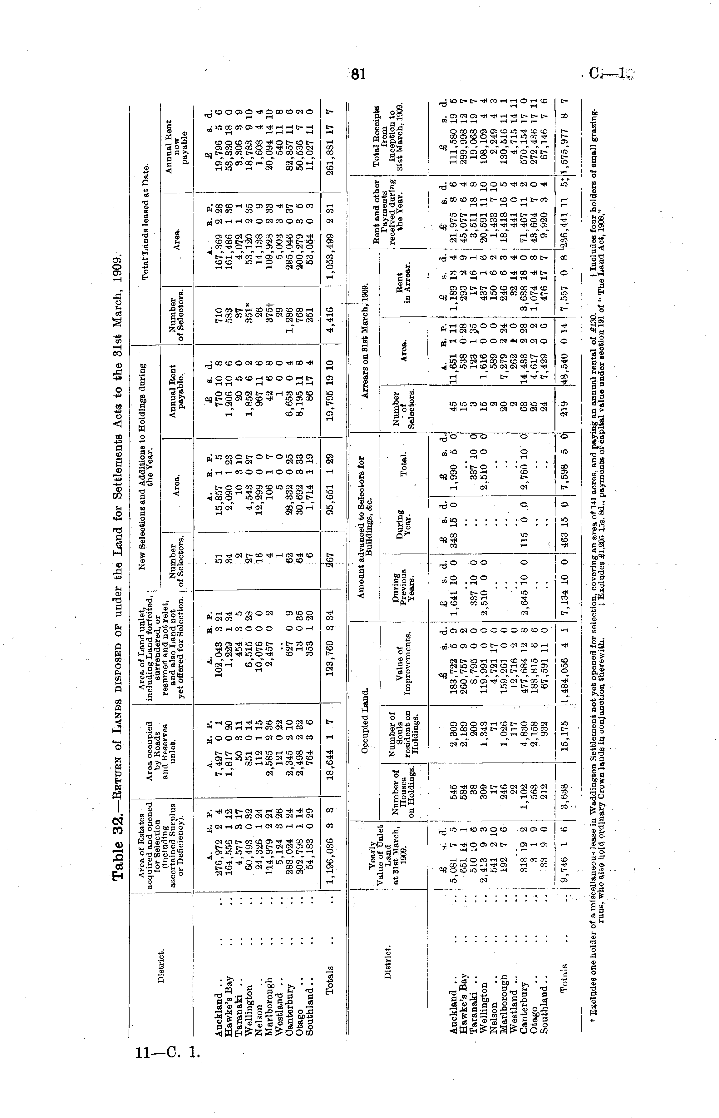 District. Area of Estates acquired and opened for Selection (including ascertained Surplus or Deficiency). Area occupied by Roads and Reserves unlet. Area of Land unlet, including Land forfeited, surrendered, or resumed and not relet, and also Land not yet offered for Selection. New Selections and Additions to Holdings during the Year. Total Lands leased at Date. Number of Selectors. Area. Annual Rent payable. Number of Selectors. Area. Annual Rent now payable Auckland .. Hawke's Bay Taranaki .. Wellington Nelson Marlborough Westland .. Canterbury Otago Southland.. A. B. P. 276,972 2 4 164,556 1 12 4,577 3 17 60,493 0 32 24,326 1 24 114,979 2 21 5,124 3 26 288,024 1 24 202,798 1 14 54,183 0 29 A. B. P. 7.497 0 1 1,817 0 20 50 3 11 851 0 14 112 1 15 2,585 2 36 121 0 22 2,345 2 10 2.498 2 32 764 3 6 A. B. P. 102,043 3 21 1,229 1 34 454 3 5 6,515 0 28 10,076 0 0 2,457 0 2 51 34 2 27 16 4 1 62 64 6 A. B. P. 15,857 1 5 2,090 1 23 10 3 10 4,543 0 27 12,299 0 0 106 1 7 5 0 0 28,332 0 25 30,692 3 33 1,714 1 19 95,651 1 29 £ s. d. 770 10 8 1,206 10 6 20 5 0 1,852 6 2 967 11 6 42 6 8 10 0 6,653 0 4 8,195 11 8 86 17 4 710 583 37 351* 26 375f 29 1,286 768 251 167,369 2 28 161,486 1 36 4,072 1 1 53,120 2 35 14,138 0 9 109,928 2 33 5,003 3 4 285,046 0 37 200,279 3 5 53,054 0 3 1,053,499 2 31 £ s. d. 19,796 5 6 53,330 18 0 3,306 3 9 18,783 9 10 1,608 4 4 20,094 14 10 540 11 8 82,857 11 6 50,536 7 2 11,027 11 0 261,881 17 7 627 0 9 13 0 35 353 1 20 Totals 1,196,036 3 3 18,644 1 7 123,769 3 34 267 19,795 19 10 4,416 I i Occupied Land. Amount a< Ivanced to Selectors for 3uildings, &c. Arrears on 31st March, 1909. Yearly District. Land at 31st March, 1909. Rent and other Payments received during the Year. Total Receipts from Inception to 31st March, 1909. Number of Houses on Holdings. Number of Souls resident on Holdings. Value of Improvements. During Previous Years. During Year. Total. Number ■ of Selectors. Area. Rent in Arrear. Auckland .. Hawke's Bay Taranaki .. Wellington Nelson Marlborough Westland ... Canterbury Otago Southland.. £ s. d. 5,081 7 5 651 14 1 510 10 6 2,413 9 3 541 2 10 192 7 6 545 584 38 309 17 246 22 1,102 563 212 2,309 2,189 200 1,343 71 1,026 117 4,830 2,158 932 £ s. d. 183,722 5 9 260,757 9 2 8,795 0 0 119,991 0 0 4,721 17 0 159,261 0 0 12,716 2 0 477,684 12 8 188,815 6 6 67,591 11 0 £ s. d. 1,641 10 0 £ s. d. 348 15 0 £ s. d. 1,990 5 0 45 15 3 15 2 20 2 68 25 24 A. B. P. 11,651 1 11 538 0 28 123 1 35 1.616 0 0 589 0 0 7,279 2 24 262 I 0 14,433 2 28 4.617 2 2 7,429 0 6 £ s. d. 1,189 13 4 293 2 9 17 16 1 437 1 6 150 6 2 246 6 3 32 14 4 3,638 18 0 1,074 4 8 476 17 7 £ s. d. 21,975 8 6 45,077 6 4 3,511 18 8 20,591 11 10 1,433 7 10 18,418 16 5 441 0 4 71,467 11 2 43,604 7 0 9,920 3 4 £ s. d. 111,580 19 5 289,998 12 7 19,068 19 7 108,109 4 4 2,249 4 3 130,516 11 1 4,715 14 11 570,154 17 C 272,436 17 11 67,146 7 6 337 10 0 2,510 0 0 337 10 0 2,510 0 0 318 19 2 3 19 33 9 0 2,645 10 0 115 "6 0 2,760*10 0 •• Totals 9,746 1 6 3,638 15,175 1,484,056 4 1 7,134 10 0 463 15 0 7,598 5 0 219 48,540 0 14 7,557 0 8 236,441 11 5J 1,575,977 8 * Excludes one holder of a miscellaneous lease in Waddington Settlement not yet opened for selection, covering an area of 141 acres, and paying an annual rental of £130. I Includes four holders of small grazingruns, who also hold ordinary Crown lands in conjunction therewith, J Excludes il,2Q5 15s. 8d., payments of capital value under section 191 of " The Land Act, 1908,"