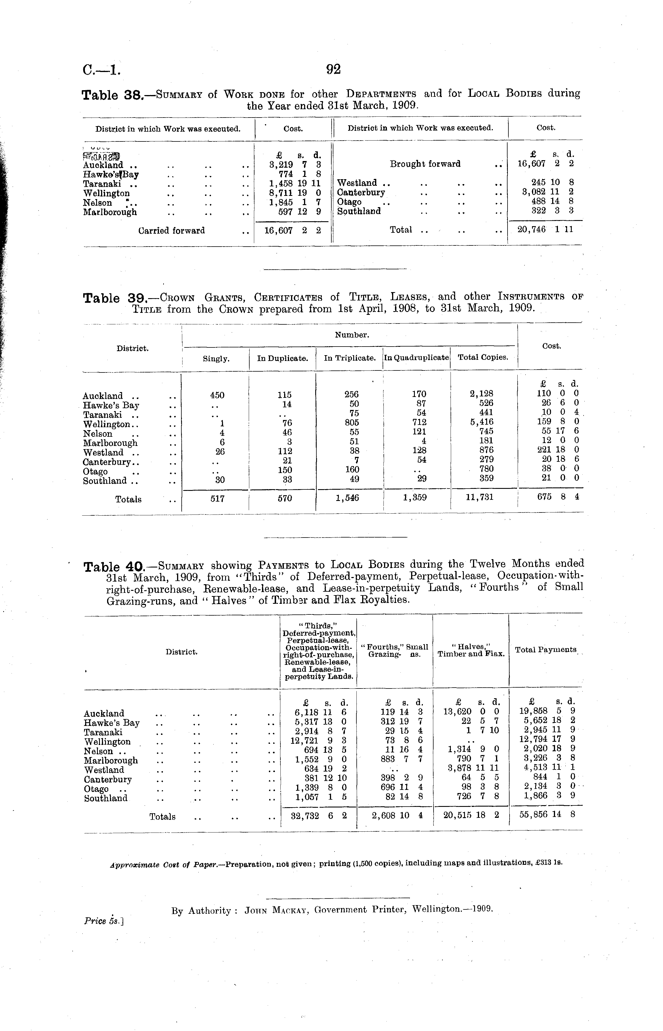 Table 40.— Summary showing Payments to Local Bodies during the Twelve Months ended 31st March, 1909, from "Thirds" of Deferred-payment, Perpetual-lease, Occupation-with-right-of-purchase, Renewable-lease, and Lease-in-perpetuity Lands, "Fourths" of Small Grazing-runs, and "Halves" of Timber and Flax Royalties.