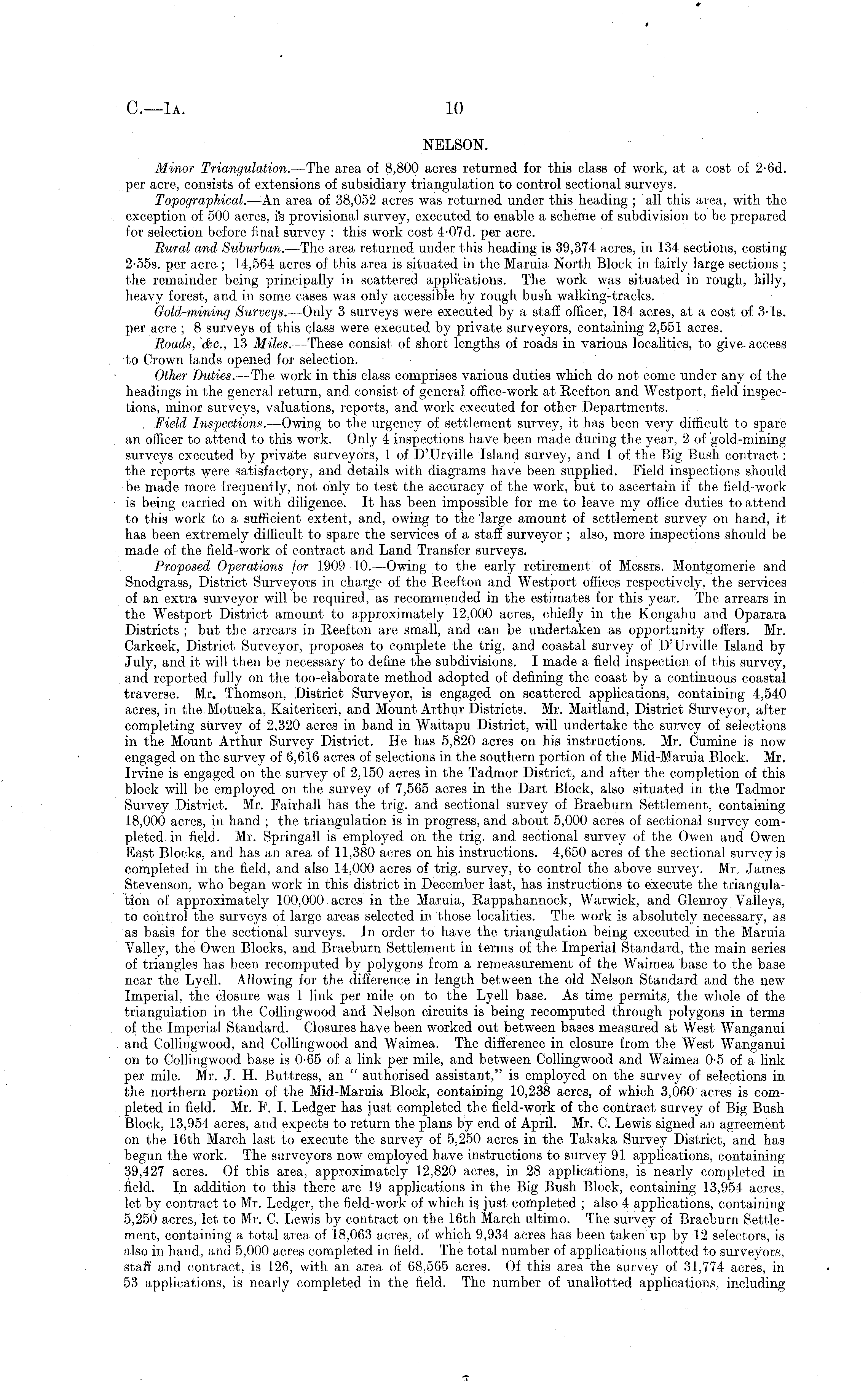 NELSON. Minor Triangulation. —The area of 8,800 acres returned for this class of work, at a cost of 2-6 d. per acre, consists of extensions of subsidiary triangulation to control sectional surveys. Topographical. —An area of 38,052 acres was returned under this heading ; all this area, with the exception of 500 acres, is provisional survey, executed to enable a scheme of subdivision to be prepared for selection before final survey : this work cost 4-07 d. per acre. Rural and Suburban. —The area returned under this heading is 39,374 acres, in 134 sections, costing 2-555. per acre ; 14,564 acres of this area is situated in the Maruia North Block in fairly large sections ; the remainder being principally in scattered applications. The work was situated in rough, hilly, heavy forest, and in some cases was only accessible by rough bush walking-tracks. Gold-mining Surveys. —Only 3 surveys were executed by a staff officer, 184 acres, at a cost of 3-ls. per acre ; 8 surveys of this class were executed by private surveyors, containing 2,551 acres. Roads, &c, 13 Miles. —These consist of short lengths of roads in various localities, to give- access to Crown lands opened for selection. Other Duties. —The work in this class comprises various duties which do not come under any of the headings in the general return, and consist of general office-work at Reefton and Westport, field inspections, minor surveys, valuations, reports, and work executed for other Departments. Field Inspections. —Owing to the urgency of settlement survey, it has been very difficult to spare an officer to attend to this work. Only 4 inspections have been made during the year, 2of gold-mining surveys executed by private surveyors, 1 of D'Urville Island survey, and 1 of the Big Bush contract : the reports were satisfactory, and details with diagrams have been supplied. Field inspections should be made more frequently, not only to test the accuracy of the work, but to ascertain if the field-work is being carried on with diligence. It has been impossible for me to leave my office duties to attend to this work to a sufficient extent, and, owing to the large amount of settlement survey on hand, it has been extremely difficult to spare the services of a staff surveyor ; also, more inspections should be made of the field-work of contract and Land Transfer surveys. Proposed Operations for 1909-10.—Owing to the early retirement of Messrs. Montgomerie and Snodgrass, District Surveyors in charge of the Reefton and Westport offices respectively, the services of an extra surveyor will be required, as recommended in the estimates for this year. The arrears in the W'estport District amount to approximately 12,000 acres, chiefly in the Kongahu and Oparara Districts ; but the arrears in Reefton are small, and can be undertaken as opportunity offers. Mr. Carkeek, District Surveyor, proposes to complete the trig, and coastal survey of D'Urville Island by July, and it will then be necessary to define the subdivisions. I made a field inspection of this survey, and reported fully on the too-elaborate method adopted of defining the coast by a continuous coastal traverse. Mr. Thomson, District Surveyor, is engaged on scattered applications, containing 4,540 acres, in the Motueka, Kaiteriteri, and Mount Arthur Districts. Mr. Maitland, District Surveyor, after completing survey of 2,320 acres in hand in Waitapu District, will undertake the survey of selections in the Mount Arthur Survey District. He has 5,820 acres on his instructions. Mr. Cumine is now engaged on the survey of 6,616 acres of selections in the southern portion of the Mid-Maruia Block. Mr. Irvine is engaged on the survey of 2,150 acres in the Tadmor District, and after the completion of this block will be employed on the survey of 7,565 acres in the Dart Block, also situated in the Tadmor Survey District. Mr. Fairhall has the trig, and sectional survey of Braeburn Settlement, containing 18,000 acres, in hand ; the triangulation is in progress, and about 5,000 acres of sectional survey completed in field. Mr. Springall is employed on the trig, and sectional survey of the Owen and Owen East Blocks, and has an area of 11,380 acres on his instructions. 4,650 acres of the sectional survey is completed in the field, and also 14,000 acres of trig, survey, to control the above survey. Mr. James Stevenson, who began work in this district in December last, has instructions to execute the triangulation of approximately 100,000 acres in the Maruia, Rappahannock, Warwick, and Glenroy Valleys, to control the surveys of large areas selected in those localities. The work is absolutely necessary, as as basis for the sectional surveys. In order to have the triangulation being executed in the Maruia Valley, the Owen Blocks, and Braeburn Settlement in terms of the Imperial Standard, the main series of triangles has been recomputed by polygons from a remeasurement of the Waimea base to the base near the Lyell. Allowing for the difference in length between the old Nelson Standard and the new Imperial, the closure was 1 link per mile on to the Lyell base. As time permits, the whole of the triangulation in the Colling wood and Nelson circuits is being recomputed through polygons in terms of the Imperial Standard. Closures have been worked out between bases measured at West Wanganui and Collingwood, and Collingwood and Waimea. The difference in closure from the West Wanganui on to Collingwood base is 0-65 of a link per mile, and between Collingwood and Waimea 0-5 of a link per mile. Mr. J. H. Buttress, an " authorised assistant," is employed on the survey of selections in the northern portion of the Mid-Maruia Block, containing 10,238 acres, of which 3,060 acres is completed in field. Mr. F. I. Ledger has just completed the field-work of the contract survey of Big Bush Block, 13,954 acres, and expects to return the plans by end of April. Mr. C. Lewis signed an agreement on. the 16th March last to 