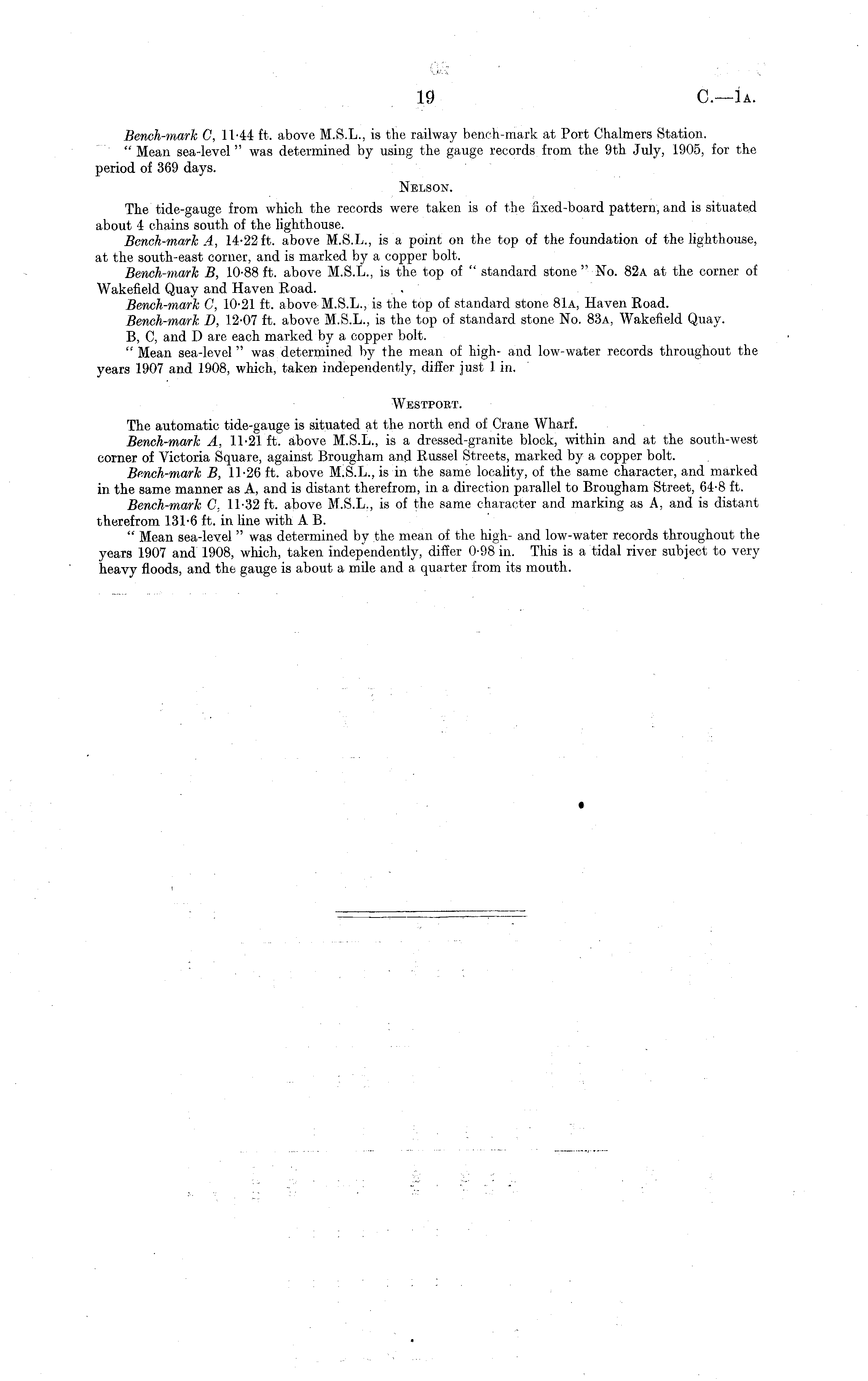 Bench-mark C, 11-44 ft, above M.S.L., is the railway bench-mark at Port Chalmers Station. " Mean sea-level " was determined by using the gauge records from the 9th July, 1905, for the period of 369 days. Nelson. The tide-gauge from which the records were taken is of the fixed-board pattern, and is situated about 4 chains south of the lighthouse. Bench-mark A, 14-22 ft. above M.S.L., is a point on the top of the foundation of the lighthouse, at the south-east corner, and is marked by a copper bolt. Bench-mark B, 10-88 ft, above M.S.L., is the top of " standard stone " No. 82a at the corner of Wakefield Quay and Haven Road. Bench-mark C, 10-21 ft, above M.S.L., is the top of standard stone 81a, Haven Road. Bench-mark D, 12-07 ft. above M.S.L., is the top of standard stone No. 83a, Wakefield Quay. B, C, and D are each marked by a copper bolt. " Mean sea-level " was determined hj the mean of high- and low-water records throughout the years 1907 and 1908, which, taken independently, differ just 1 in. Westport. The automatic tide-gauge is situated at the north end of Crane Wharf. Bench-mark A, 11-21 ft. above M.S.L., is a dressed-granite block, within and at the south-west corner of Victoria Square, against Brougham and Russel Streets, marked by a copper bolt. Bench-mark B, 11-26 ft. above M.S.L., is in the same locality, of the same character, and marked in the same manner as A, and is distant therefrom, in a direction parallel to Brougham Street, 64-8 ft. Bench-mark C, 11-32 ft. above M.S.L., is of the same character and marking as A, and is distant therefrom 131-6 ft. in line with A B. " Mean sea-level " was determined by the mean of the high- and low-water records throughout the years 1907 and 1908, which, taken independently, differ 0-98 in. This is a tidal river subject to very heavy floods, and the gauge is about a mile and a quarter from its mouth.