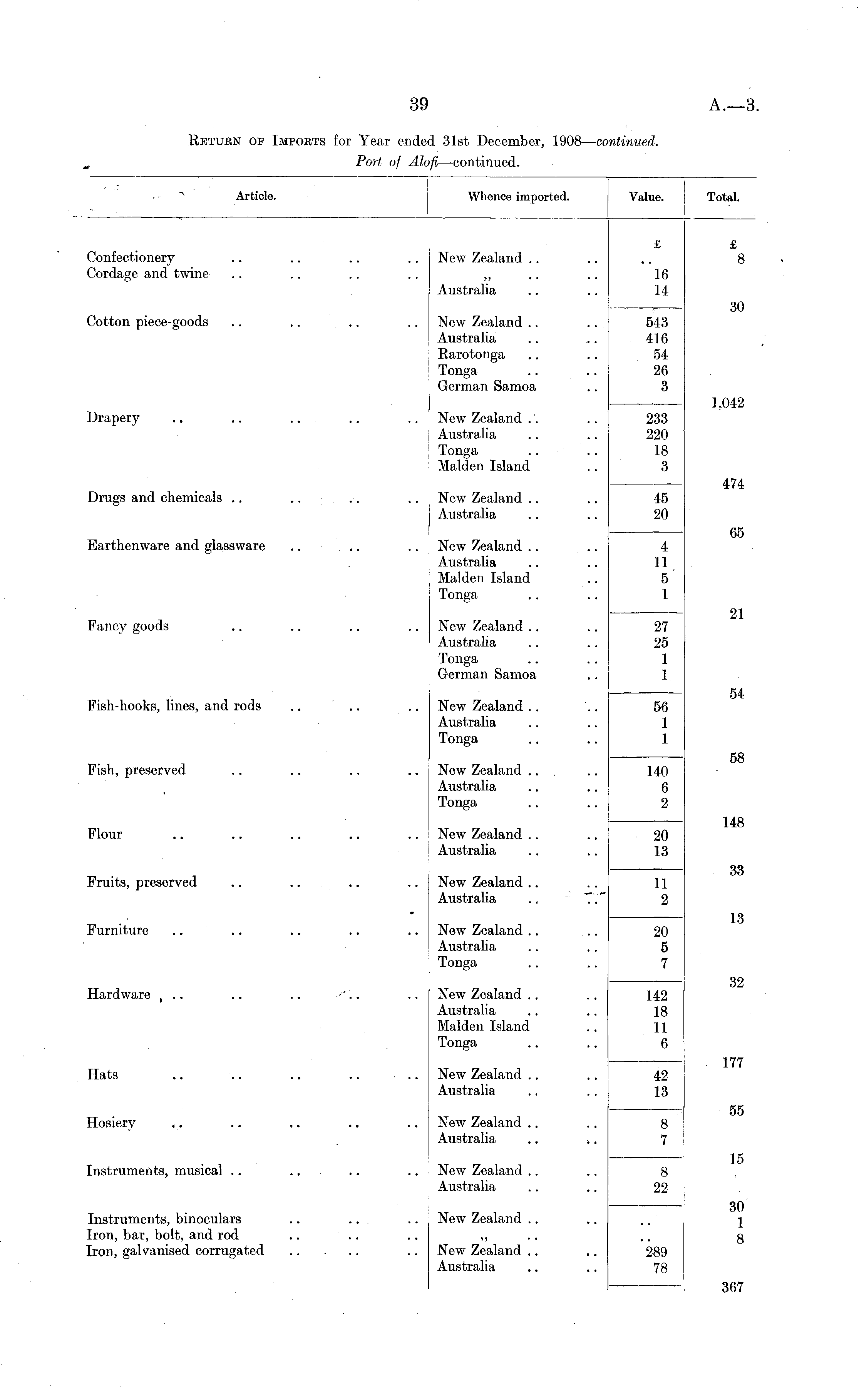 Return of Imports for Year ended 31st December, 1908— continued. Port of Alofi —continued.