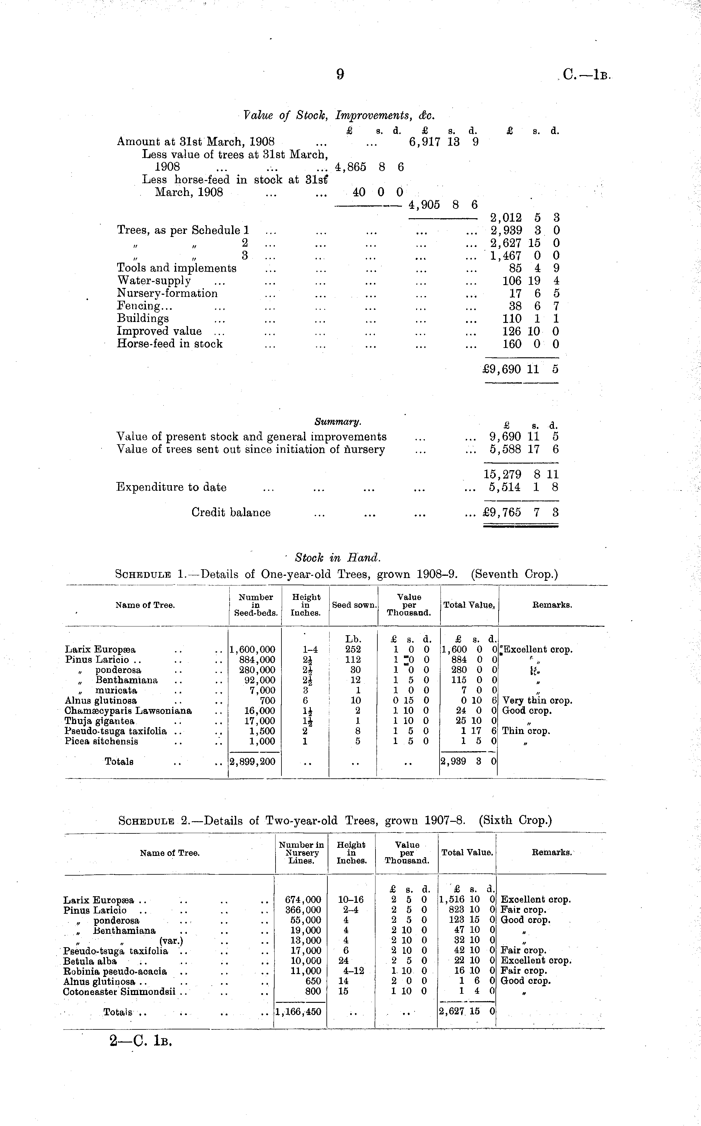 Value of Stock, Improvements, &c. £ s. d. £ s. d. £ s. d. Amount at 31st March, 1908 ... ... 6,917 13 9 Less value of trees at 31st March, 1908 ... ... ... 4,865 8 6 Less horse-feed in stock at 31sf March, 1908 ... ... 40 0 0 — 4,905 8 6 2,012 5 3 Trees, as per Schedule 1 ... ... ... ... ... 2,939 3 0 2 ... ... ... ... ... 2,627 15 0 3 ... ... ... ... ... 1,467 0 0 Tools and implements ... ... ... ... ... 85 4 9 Water-supply ... ... ... ... ... ... 106 19 4 Nursery-formation ... ... ... ... ... 17 6 5 Fencing... ... ... ... ... ... ... 38 6 7 Buildings ... ... ... ... ... ... 110 1 1 Improved value ... ... ... ... ... ... 126 10 0 Horse-feed in stock ... ... ... ... ... 160 0 0 £9,690 11 5 Summary. £ 8 . d. Value of present stock and general improvements ... ... 9,690 11 5 Value of trees sent out since initiation of nursery ... ... 5,588 17 6 15,279 8 11 Expenditure to date ... ... ... ... ... 5,514 1 8 Credit balance ... ... ... ...£9,765 7 3