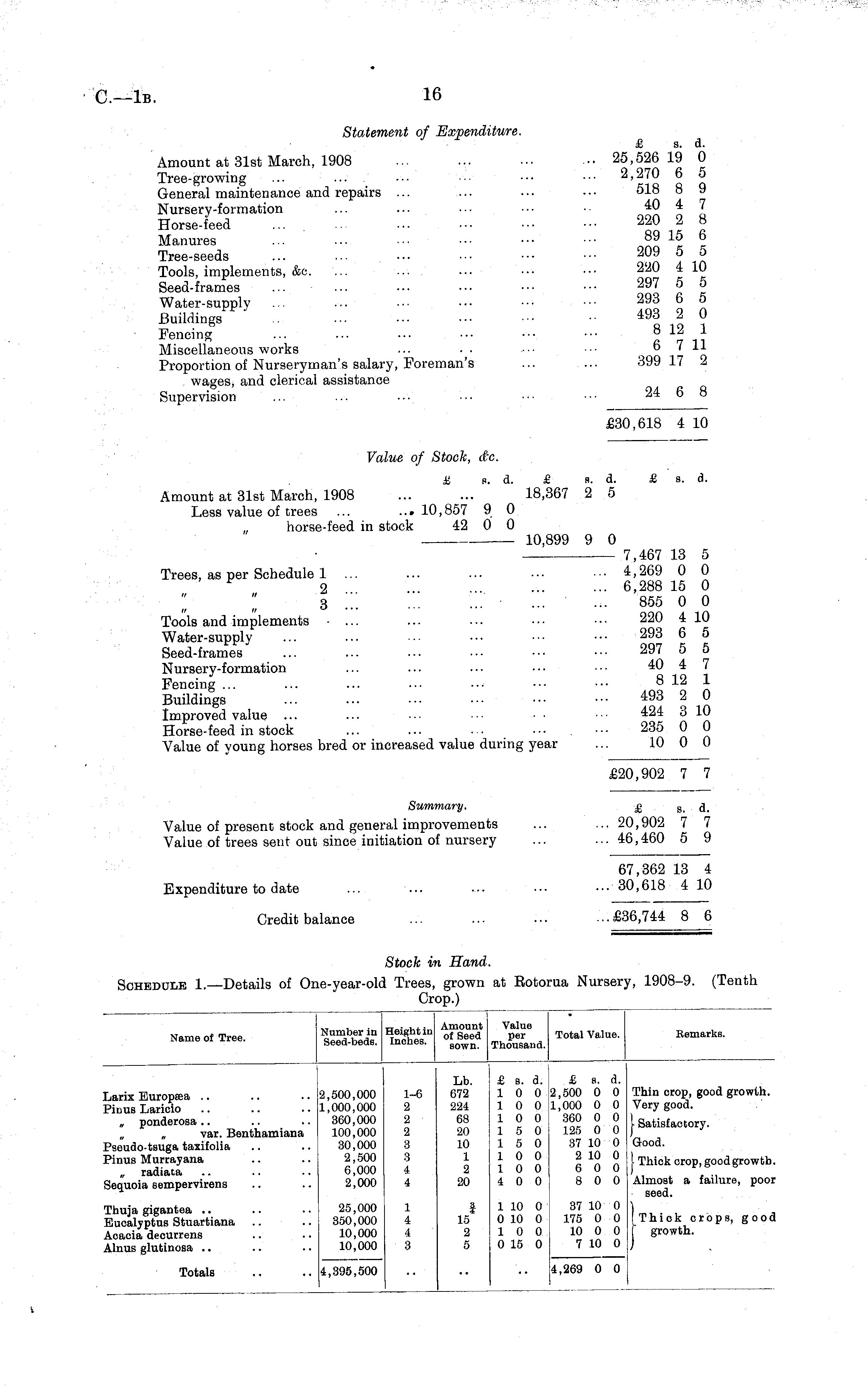 Statement of Expenditure. £ s. d. Amount at 31st March, 1908 25,526 19 0 Tree-growing ... .... ■•• ■■■'• ••• ••• 2,270 6 5 General maintenance and repairs ... ... ■•• ••• 518 8 9 Nursery-formation ... ... ••■ ••• •■ 40 4 7 Horse-feed ... 220 2 ° Manures ... ... ••■ ■•• •■• ••■ 89 15 ° Tree-seeds 209 J J Tools, implements, &c. ... ... ... ••• ••■ 22 " 410 Seed-frames ... ... ••• ••■ ••• ■•• 29 ' Water-supply ... ... ••■ ■•■ ••• •■• 293 6 5 Buildings ... ... ••■ •■• ■■• ■• 493 2 ° Fencing ... ... ... ••• •■• ■•• 8 12 j Miscellaneous works ... •'• -•• ••■ , i Proportion of Nurseryman's salary, Foreman's ... ... 399 17 2 wages, and clerical assistance Supervision ... ... •■■ ••• ■-■ •■• 24 b 8 £30,618 4 10 Value of Stock, &c. £ s. d. £ r. d. £ s. d. Amount at 31st March, 1908 ... ... 18,367 2 5 Less value of trees ... ...10,857 9 0 ~ horse-feed in stock 42 0 0 10,899 9 0 7,467 13 5 Trees, as per Schedule 1 ... ... ... ••• ■•• 4,269 0 0 2 ..... ... 6,288 15 0 " I 3 Y. ... ••• 855 0 0 Tools and implements ... ... ••••■ • ■ • • 22 0 410 Water-supply ... ... ... ••• •■• ••• 293 6 5 Seed-frames ... ... ... ••• ■•• ••• 29 ? 5 5 Nursery-formation ... ... ... ••• ■'•■ 40 4 7 Fencing ... ... ... ••• ••• -•• ■•• 8 12 1 Buildings ... ... ••• ••■ ••• ■•• 493 2 0 Improved value ... ... ... ■•■ • • ■•• 310 Horse-feed in stock ... ... ■ • ■ ■ ■ • • • 2 35 0 0 Value of young horses bred or increased value during year ... 10 0 0 £20,902 7 7 Summary. jg s. d. Value of present stock and general improvements ... ... 20,902 7 7 Value of trees sent out since initiation of nursery ... ... 46,460 5 9 67,362 13 4 Expenditure to date ... ... ••• ••• ...30,618 4 10 Credit balance ... ... ... ...£36,744 8 6