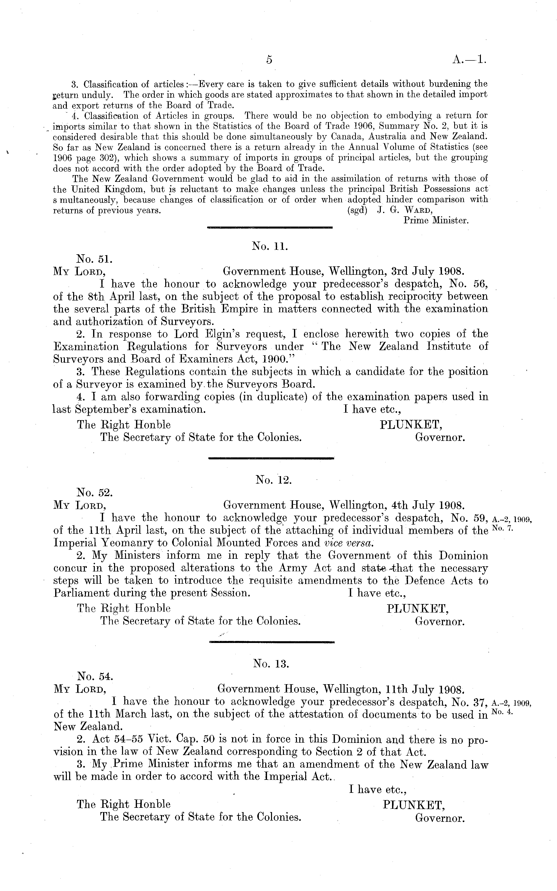 3. Classification of articles: —Every care is taken to give sufficient details without burdening the jeturn unduly. The order in which goods are stated approximates to that shown in the detailed import and export returns of the Board of Trade. 4. Classification of Articles in groups. There would be no objection to embodying a return for imports similar to that shown in the Statistics of the Board of Trade 1906, Summary No. 2, but it is considered desirable that this should be done simultaneously by Canada, Australia and New Zealand. So far as New Zealand is concerned there is a return already in the Annual Volume of Statistics (see 1906 page 302), which shows a summary of imports in groups of principal articles, but the grouping does not accord with the order adopted by the Board of Trade. The New Zealand Government would be glad to aid in the assimilation of returns with those of the United Kingdom, but is reluctant to make changes unless the principal British Possessions act s multaneously, because changes of classification or of order when adopted hinder comparison with returns of previous years. (sgd) J. G. Waed, Prime Minister.