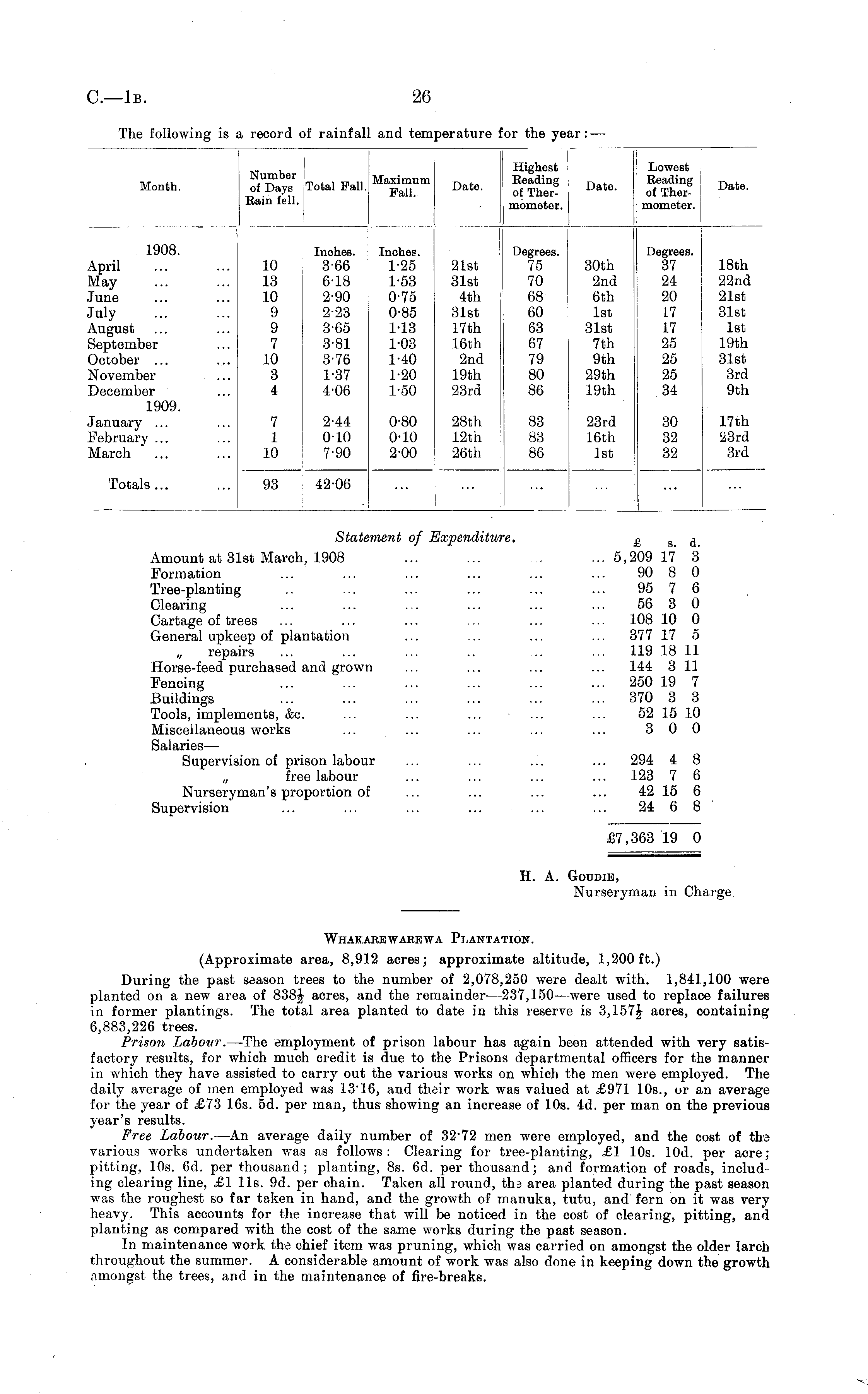 Statement of Expenditure. £ g d Amount at 31st March, 1908 ... ... ... ... 5,209 17 3 Formation ... ... ... ... ... ... 90 8 0 Tree-planting .. ... ... ... ... ... 95 7 6 Clearing ... ... ... ... ... ... 56 3 0 Cartage of trees ... ... ... ... ... ... 108 10 0 General upkeep of plantation ... ... ... ... 377 17 5 „ repairs ... ... ... .. .. ... 119 18 11 Horse-feed purchased and grown ... ... ... ... 144 311 Fencing ... ... ... ... ... ... 250 19 7 Buildings ... 370 3 3 Tools, implements, &c. ... ... ... ... ... 52 15 10 Miscellaneous works ... ... ... ... ... 300 Salaries — Supervision of prison labour ... ... ... ... 294 4 8 free labour ... ... ... ... 123 7 6 Nurseryman's proportion of ... ... ... ... 42 15 6 Supervision ... ... ... ... ... ... 24 6 8 £7,363 19 0 H. A. Goudie, Nurseryman in Charge.