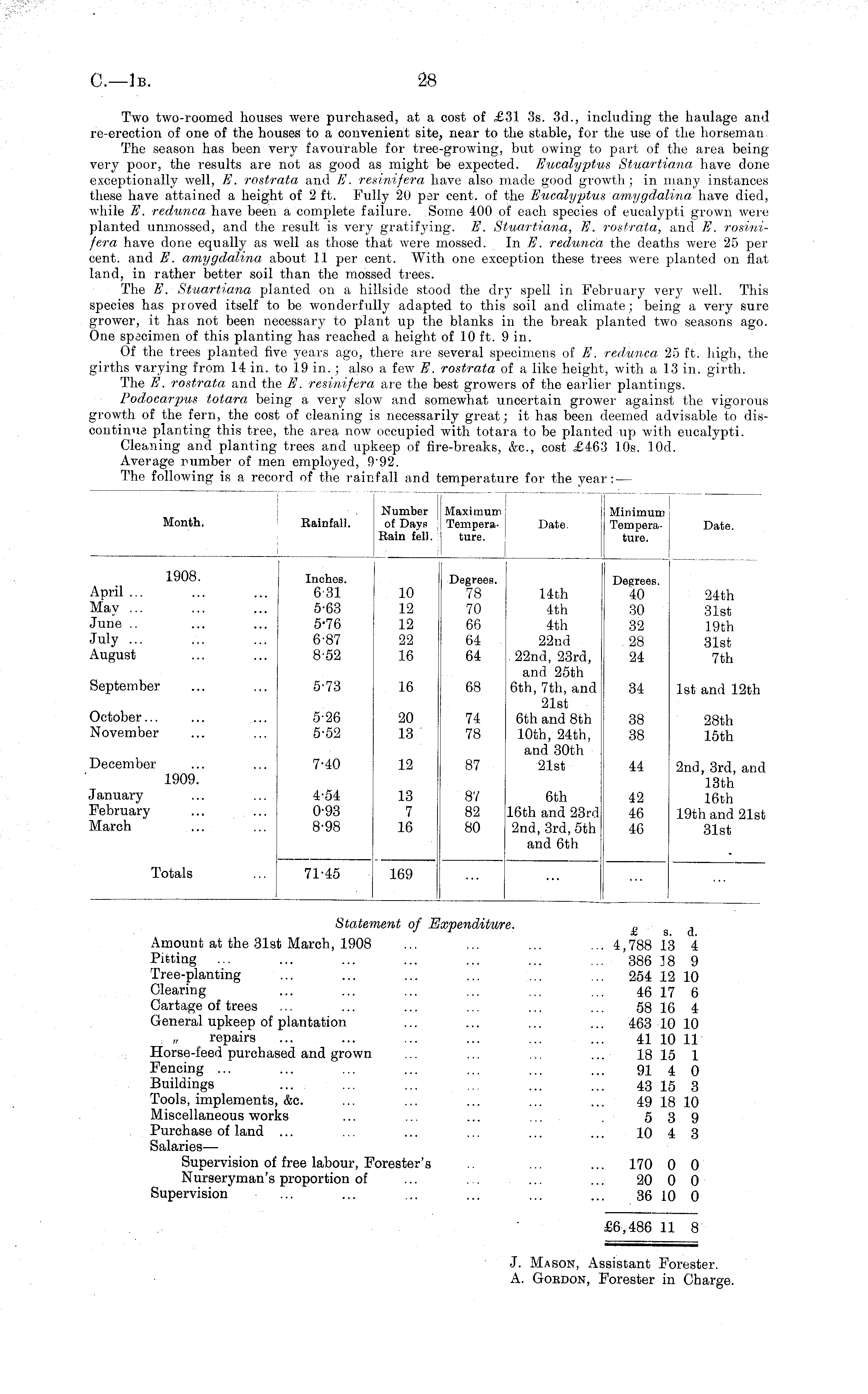 Statement of Expenditure. „ Amount at the 31st March, 1908 ... ... ... ... 4,788 13 4 Pitting ■•■ ... ... ... ... ... ... 386 18 9 Tree-planting ... ... ... ... ... ... 254 12 10 Clearing ... ... ... ... ... ... 46 17 6 Cartage of trees ... ... ... ... ... ... 58 16 4 General upkeep of plantation ... ... ... ... 463 10 10 repairs ... ... ... ... ... ... 41 10 11 Horse-feed purchased and grown ... ... ... ... 18 15 1 Fencing ..: ... ... ... ... ... ... 91 4 0 Buildings ... ... ... ... ... ... 43 15 3 Tools, implements, &c. ... ... ... ... ... 49 18 10 Miscellaneous works ... ... ... ... . 539 Purchase of land ... ... ... ... ... ... 10 4 3 Salaries— Supervision of free labour, Forester's .. ... ... 170 0 0 Nurseryman's proportion of ... . . ... ... 20 0 0 Supervision ... ... ... ... ... ... 36 10 0 ' £6,486 11 8 J. Mason, Assistant Forester. A. Gordon, Forester in Charge.