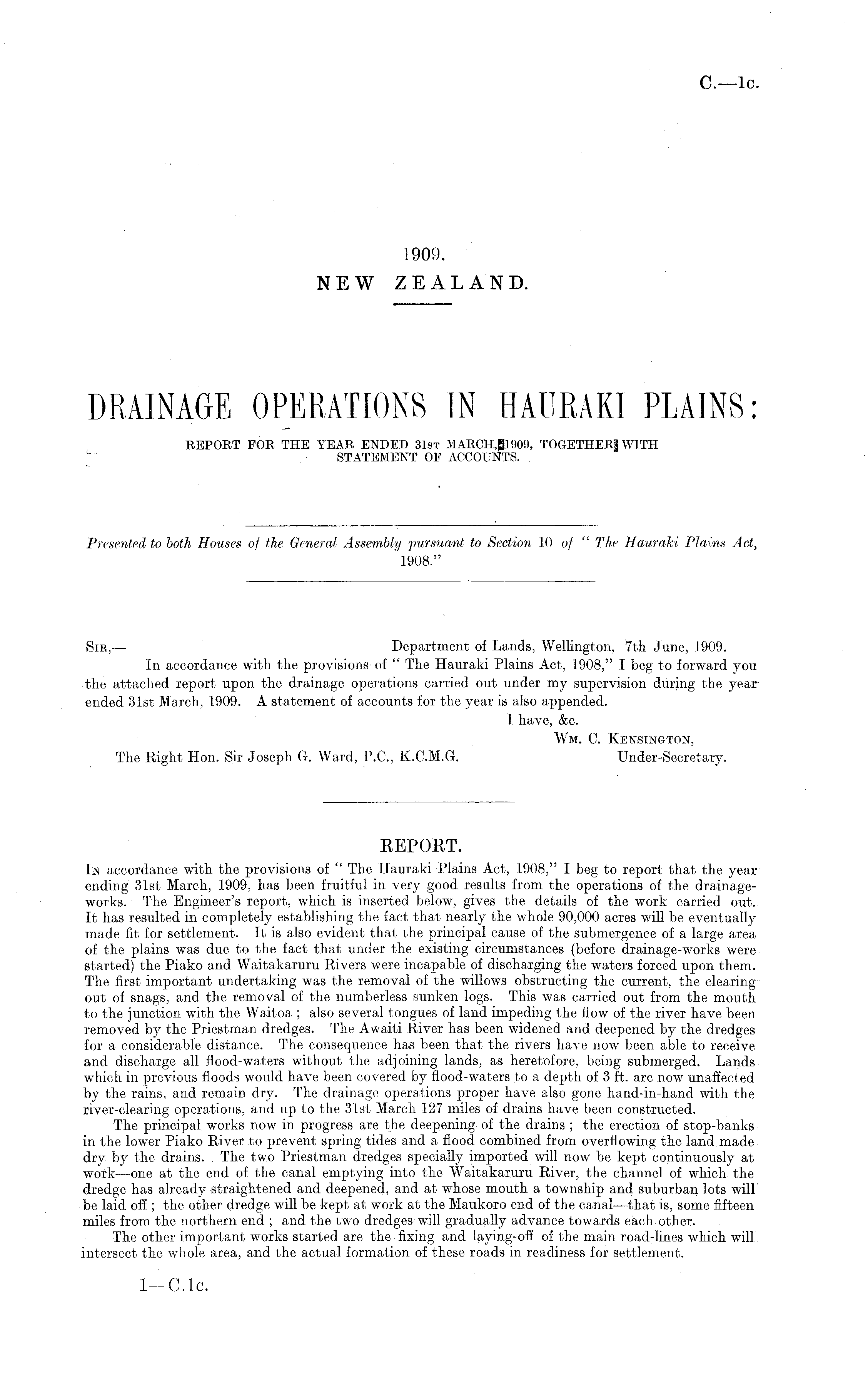DRAINAGE OPERATIONS IN HAURAKI PLAINS: REPORT FOR THE YEAR ENDED 31st MARCH, 1909, TOGETHER WITH STATEMENT OF ACCOUNTS.