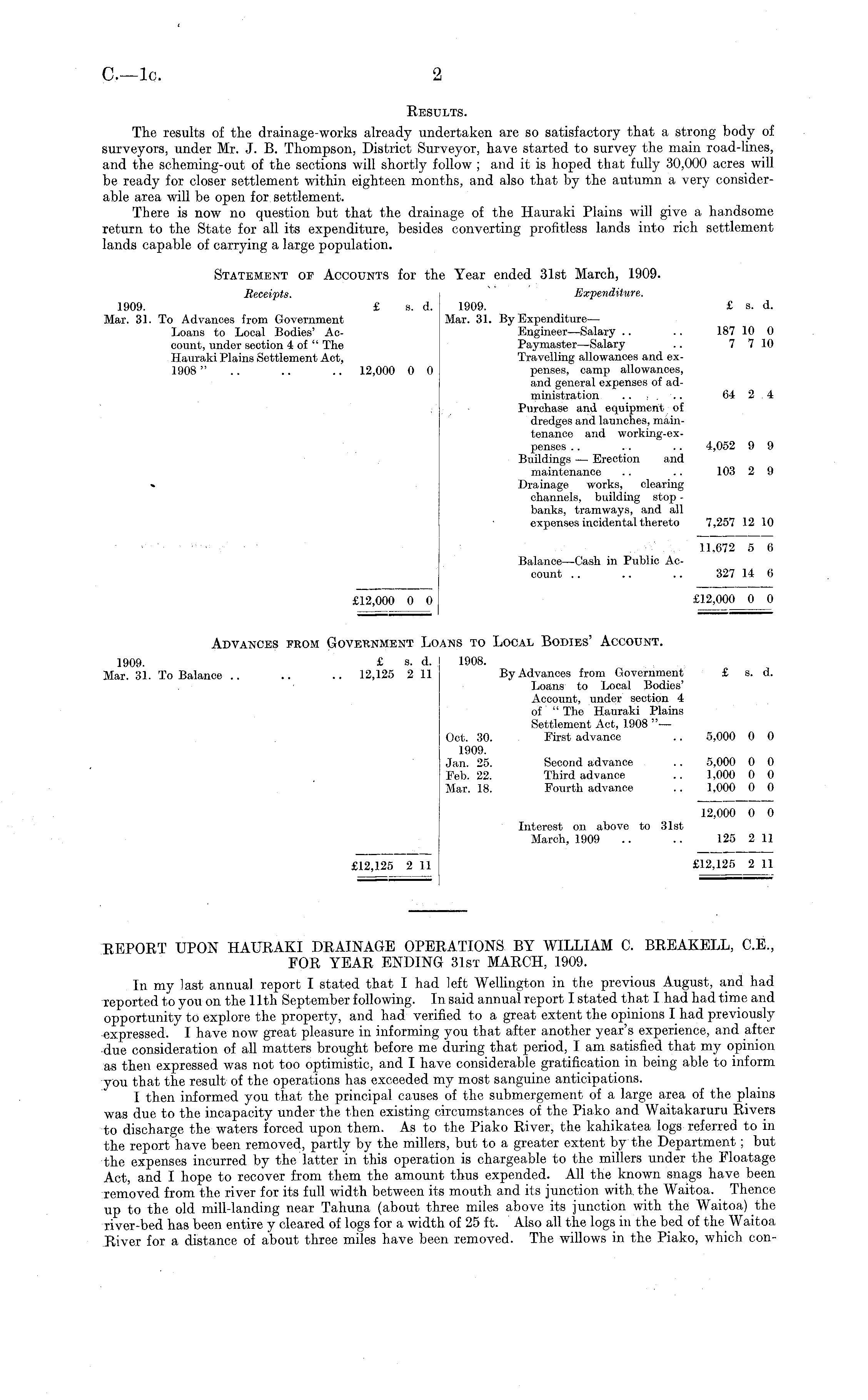 REPORT UPON HAURAKI DRAINAGE OPERATIONS BY WILLIAM C. BREAKELL, CE, FOR YEAR ENDING 31st MARCH, 1909. In my last annual report I stated that I had left Wellington in the previous August, and had reported to you on the 11th September following. In said annual report I stated that I had had time and opportunity to explore the property, and had verified to a great extent the opinions I had previously expressed. I have now great pleasure in informing you that after another year's experience, and after due consideration of all matters brought before me during that period, I am satisfied that my opinion as then expressed was not too optimistic, and I have considerable gratification in being able to inform you that the result of the operations has exceeded my most sanguine anticipations. I then informed you that the principal causes of the submergement of a large area of the plains was due to the incapacity under the then existing circumstances of the Piako and Waitakaruru Rivers to discharge the waters forced upon them. As to the Piako River, the kahikatea logs referred to in the report have been removed, partly by the millers, but to a greater extent by the Department; but the expenses incurred by the latter in this operation is chargeable to the millers under the Floatage Act, and I hope to recover from them the amount thus expended. All the known snags have been removed from the river for its full width between its mouth and its junction with, the Waitoa. Thence up to the old mill-landing near Tahuna (about three miles above its junction with the Waitoa) the river-bed has been entire y cleared of logs for a width of 25 ft. Also all the logs in the bed of the Waitoa River for a distance of about three miles have been removed. The willows in the Piako, which con-