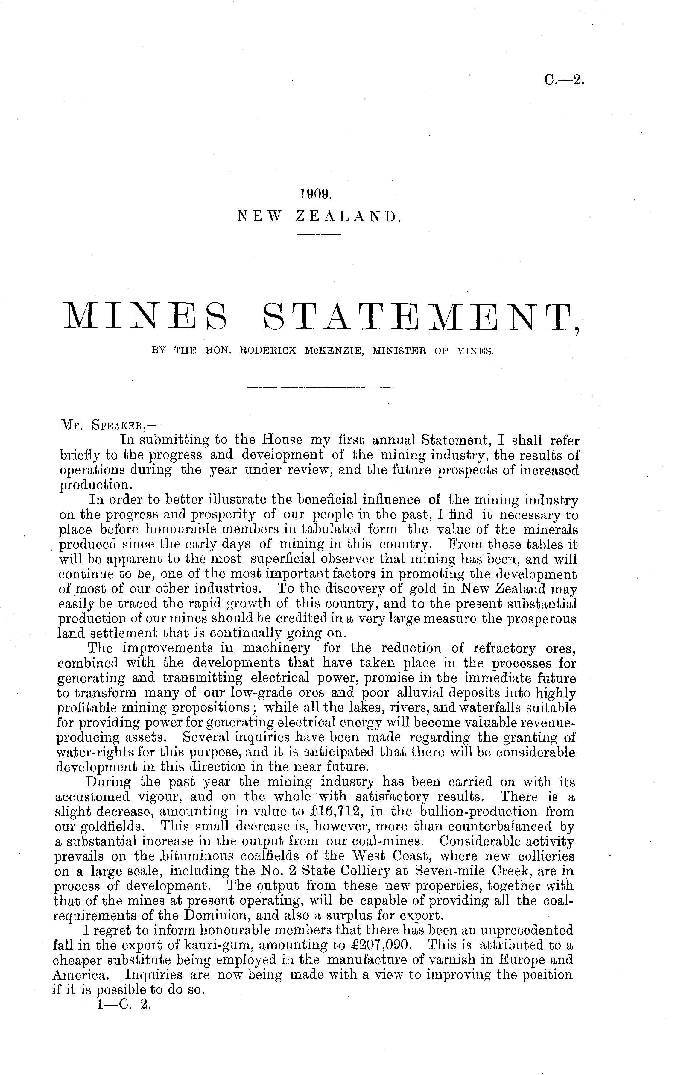 Mr. Speakeb,— In submitting to the House my first annual Statement, I shall refer briefly to the progress and development of the mining industry, the results of operations during the year under review, and the future prospects of increased production. In order to better illustrate the beneficial influence of the mining industry on the progress and prosperity of our people in the past, I find it necessary to place before honourable members in tabulated form the value of the minerals produced since the early days of mining in this country. From these tables it will be apparent to the most superficial observer that mining has been, and will continue to be, one of the most important factors in promoting the development of most of our other industries. To the discovery of gold in New Zealand may easily be traced the rapid growth of this country, and to the present substantial production of our mines should be credited in a very large measure the prosperous land settlement that is continually going on. The improvements in machinery for the reduction of refractory ores, combined with the developments that have taken place in the processes for generating and transmitting electrical power, promise in the immediate future to transform many of our low-grade ores and poor alluvial deposits into highly profitable mining propositions ; while all the lakes, rivers, and waterfalls suitable for providing power for generating electrical energy will become valuable revenueproducing assets. Several inquiries have been made regarding the granting of water-rights for this purpose, and it is anticipated that there will be considerable development in this direction in the near future. During the past year the mining industry has been carried on with its accustomed vigour, and on the whole with satisfactory results. There is a slight decrease, amounting in value to £16,712, in the bullion-production from our goldfields. This small decrease is, however, more than counterbalanced by a substantial increase in the output from our coal-mines. Considerable activity prevails on the .bituminous coalfields of the West Coast, where new collieries on a large scale, including the No. 2 State Colliery at Seven-mile Creek, are in process of development. The output from these new properties, together with that of the mines at present operating, will be capable of providing all the coalrequirements of the Dominion, and also a surplus for export. I regret to inform honourable members that there has been an unprecedented fall in the export of kauri-gum, amounting to £207,090. This is attributed to a cheaper substitute being employed in the manufacture of varnish in Europe and America. Inquiries are now being made with a view to improving the position if it is possible to do so.
