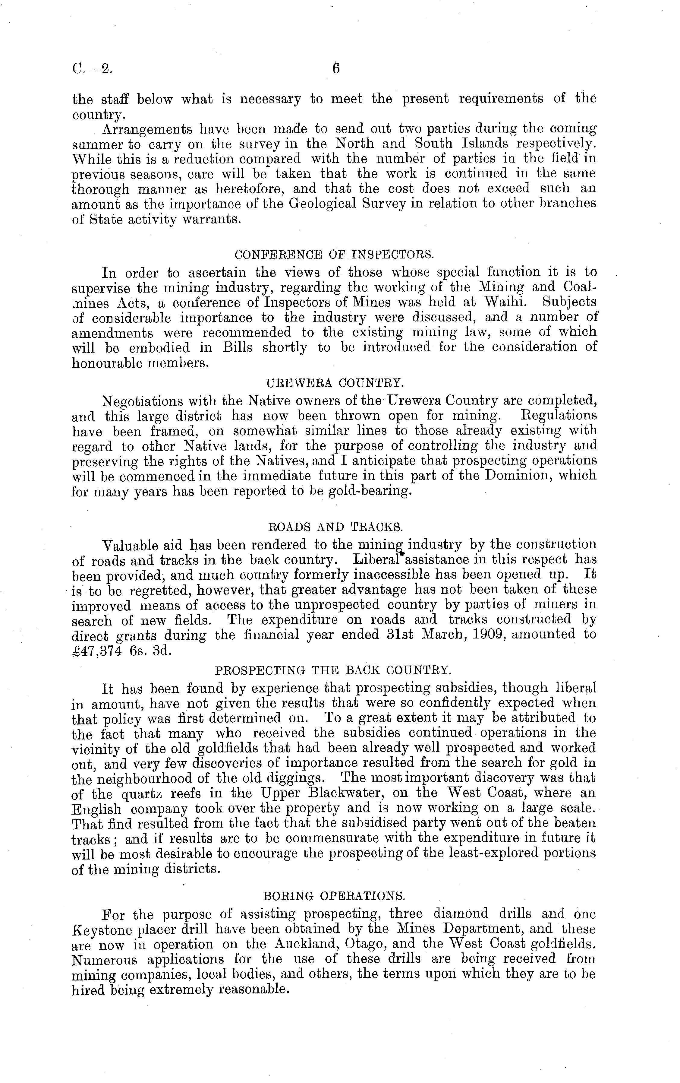 the staff below what is necessary to meet the present requirements of the country. Arrangements have been made to send out two parties during the coming summer to carry on the survey in the North and South Islands respectively. While this is a reduction compared with the number of parties in the field in previous seasons, care will be taken that the work is continued in the same thorough manner as heretofore, and that the cost does not exceed such an amount as the importance of the Geological Survey in relation to other branches of State activity warrants. CONFERENCE OF INSPECTORS. In order to ascertain the views of those whose special function it is to supervise the mining industry, regarding the working of the Mining and Coalmines Acts, a conference of Inspectors of Mines was held at Waihi. Subjects of considerable importance to the industry were discussed, and a number of amendments were recommended to the existing mining law, some of which will be embodied in Bills shortly to be introduced for the consideration of honourable members. UREWERA COUNTRY. Negotiations with the Native owners of theUrewera Country are completed, and this large district has now been thrown open for mining. Regulations have been framed, on somewhat similar lines to those already existing with regard to other Native lands, for the purpose of controlling the industry and preserving the rights of the Natives, and I anticipate that prospecting operations will be commenced in the immediate future in this part of the Dominion, which for many years has been reported to be gold-bearing. ROADS AND TRACKS. Valuable aid has been rendered to the mining industry by the construction of roads and tracks in the back country. Liberal assistance in this respect has been provided, and much country formerly inaccessible has been opened up. It is to be regretted, however, that greater advantage has not been taken of these improved means of access to the unprospected country by parties of miners in search of new fields. The expenditure on roads and tracks constructed by direct grants during the financial year ended 31st March, 1909, amounted to £47,374 6s. 3d. PROSPECTING THE BACK COUNTRY. It has been found by experience that prospecting subsidies, though liberal in amount, have not given the results that were so confidently expected when that policy was first determined on. To a great extent it may be attributed to the fact that many who received the subsidies continued operations in the vicinity of the old goldfields that had been already well prospected and worked out, and very few discoveries of importance resulted from the search for gold in the neighbourhood of the old diggings. The most important discovery was that of the quartz reefs in the Upper Blackwater, on the West Coast, where an English company took over the property and is now working on a large scale. That find resulted from the fact that the subsidised party went out of the beaten tracks; and if results are to be commensurate with the expenditure in future it will be most desirable to encourage the prospecting of the least-explored portions of the mining districts. BORING OPERATIONS. For the purpose of assisting prospecting, three diamond drills and one Keystone placer drill have been obtained by the Mines Department, and these are now in operation on the Auckland, Otago, and the West Coast goldfields. Numerous applications for the use of these drills are being received from mining companies, local bodies, and others, the terms upon which they are to be hired being extremely reasonable.