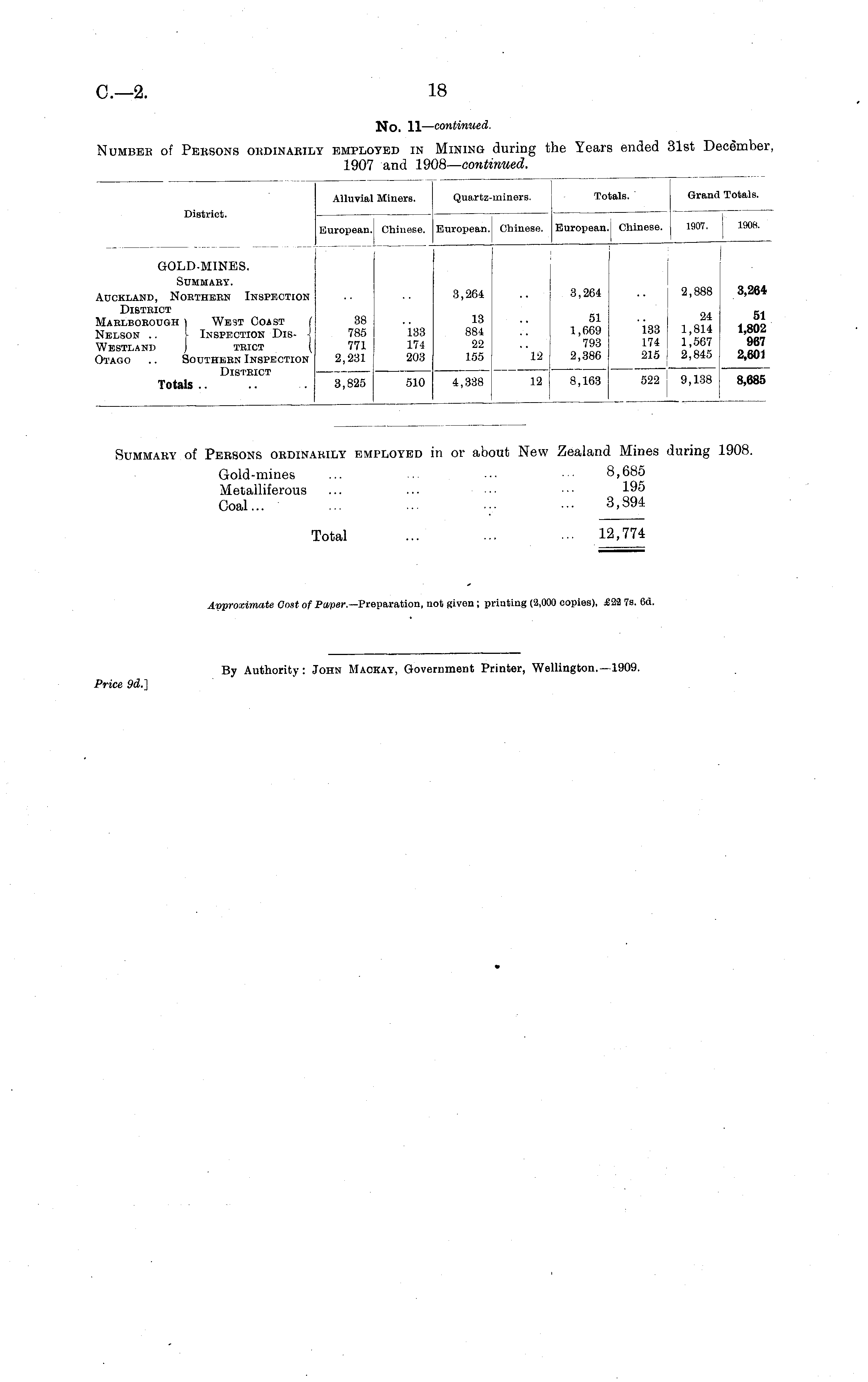 Summary of Persons ordinarily employed in or about New Zealand Mines during 1908. Gold-mines ... ... ••■ ••• 8,685 Metalliferous ... ... ■ ••• ••• 195 C0a1... ... .. ... ... 3,894 Total ... ... ... 12,774 Approximate Cost of Paper.—Preparation, not given; printing (2,000 copies), £2% 7s. 6d.