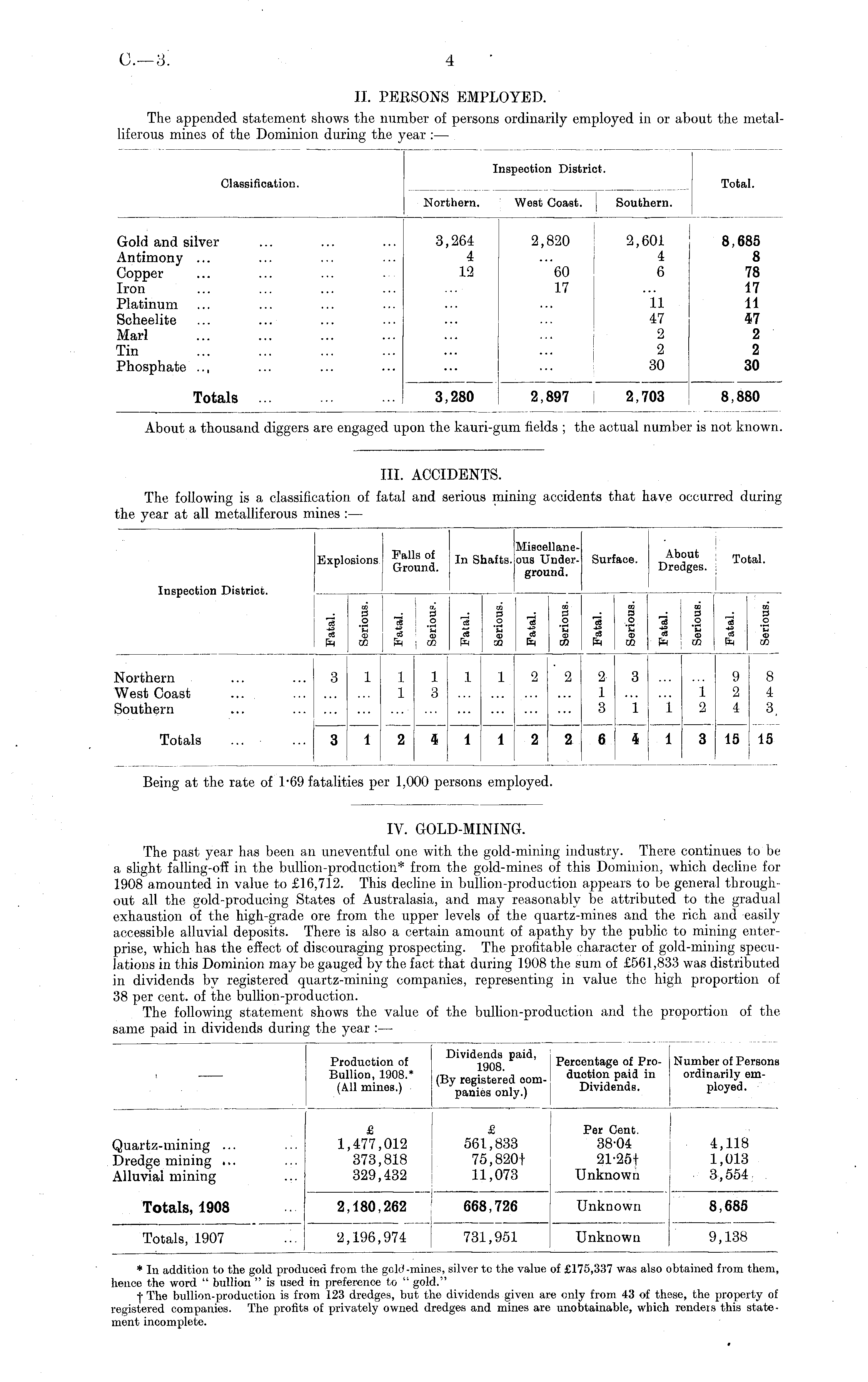 II. PERSONS EMPLOYED. The appended statement shows the number of persons ordinarily employed in or about the metalliferous mines of the Dominion during the year: —