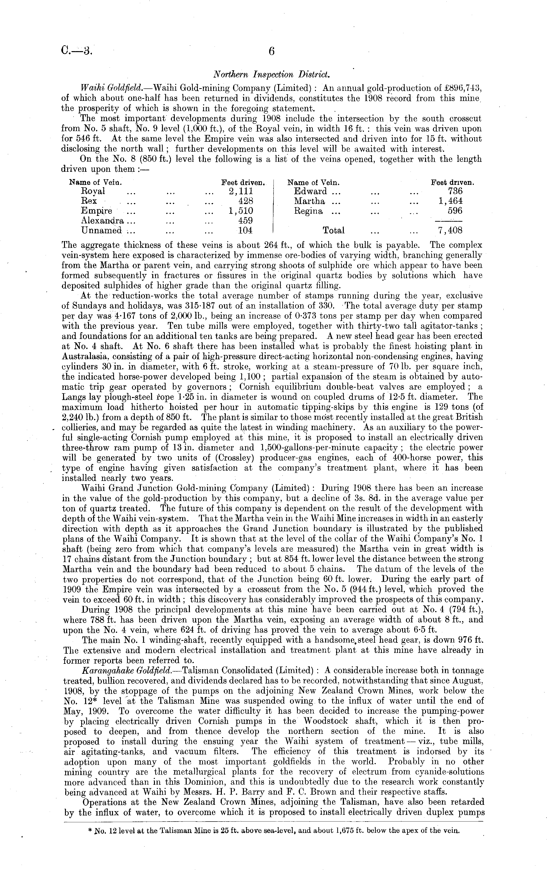 Northern Inspection District. Waihi Goldfield. —Waihi Gold-mining Company (Limited) : An annual gold-production of £896,743, of which about one-half has been returned in dividends, constitutes the 1908 record from this mine, the prosperity of which is shown in the foregoing statement. The most important developments during 1908 include the intersection by the south crosscut from No. 5 shaft, No. 9 level (1,000 ft.), of the Royal vein, in width 16 ft. : this vein was driven upon for 546 ft. At the same level the Empire vein was also intersected and driven into for 15 ft. without disclosing the north wall; further developments on this level will be awaited with interest. On the No. 8 (850 ft.) level the following is a list of the veins opened, together with the length driven upon them :— Name of Vein. Feet driven. Name of Vein. Feet driven. Royal ... ... ... 2,111 Edward ... ... ... 736 Rex ... ... ... 428 Martha ... ... ... 1,464 Empire ... ... ... 1,510 Regina ... ... ... 596 Alexandra... ... ... 459 Unnamed ... ... ... 104 Total ... ... 7,408 The aggregate thickness of these veins is about 264 ft., of which the bulk is payable. The complex vein-system here exposed is characterized by immense ore-bodies of varying width, branching generally from the Martha or parent vein, and carrying strong shoots of sulphide ore which appear to have been formed subsequently in fractures or fissures in the original quartz bodies by solutions which have deposited sulphides of higher grade than the original quartz filling. At the reduction-works the total average number of stamps running during the year, exclusive of Sundays and holidays, was 315-187 out of an installation of 330. The total average duty per stamp per day was 4-167 tons of 2,000 lb., being an increase of 0-373 tons per stamp per day when compared with the previous year. Ten tube mills were employed, together with thirty-two tall agitator-tanks ; and foundations for an additional ten tanks are being prepared. A new steel head gear has been erected at No. 4 shaft. At No. 6 shaft there has been installed what is probably the finest hoisting plant in Australasia, consisting of a pair of high-pressure direct-acting horizontal non-condensing engines, having cylinders 30 in. in diameter, with 6 ft. stroke, working at a steam-pressure of 70 lb. per square inch, the indicated horse-power developed being 1,100 ; partial expansion of the steam is obtained by automatic trip gear operated by governors ; Cornish equilibrium double-beat valves are employed ; a Langs lay plough-steel rope 1-25 in. in diameter is wound on coupled drums of 12-5 ft. diameter. The maximum load hitherto hoisted per hour in automatic tipping-skips by this engine is 129 tons (of 2,240 lb.) from a depth of 850 ft. The plant is similar to those most recently installed at the great British collieries, and may be regarded as quite the latest in winding machinery. As an auxiliary to the powerful single-acting Cornish pump employed at this mine, it is proposed to install an electrically driven three-throw ram pump of 13 in. diameter and 1,500-gallons-per-minute capacity ; the electric power will be generated by two units of (Crossley) producer-gas engines, each of 400-horse power, this type of engine having given satisfaction at the company's treatment plant, where it has been installed nearly two years. Waihi Grand Junction Gold-mining Company (Limited) : During 1908 there has been an increase in the value of the gold-production by this company, but a decline of 3s. Bd. in the average value per ton of quartz treated. The future of this company is dependent on the result of the development with depth of the Waihi vein-system. That the Martha vein in the Waihi Mine increases in width in an easterly direction with depth as it approaches the Grand Junction boundary is illustrated by the published plans of the Waihi Company. It is shown that at the level of the collar of the Waihi Company's No. 1 shaft (being zero from which that company's levels are measured) the Martha vein in great width is 17 chains distant from the Junction boundary ; but at 854 ft. lower level the distance between the strong Martha vein and the boundary had been reduced to about 5 chains. The datum of the levels of the two properties do not correspond, that of the Junction being 60 ft. lower. During the early part of 1909 the Empire vein was intersected by a crosscut from the No. 5 (944 ft.) level, which proved the vein to exceed 60 ft. in width ; this discovery has considerably improved the prospects of this company. During 1908 the principal developments at this mine have been carried out at No. 4 (794 ft.), where 788 ft. has been driven upon the Martha vein, exposing an average width of about 8 ft., and upon the No. 4 vein, where 624 ft. of driving has proved the vein to average about 6-5 ft. The main No. 1 winding-shaft, recently equipped with a handsome,steel head gear, is down 976 ft. The extensive and modern electrical installation and treatment plant at this mine have already in former reports been referred to. Karancjahake Goldfield. —Talisman Consolidated (Limited) : A considerable increase both in tonnage treated, bullion recovered, and dividends declared has to be recorded, notwithstanding that since August, 1908, by the stoppage of the pumps on the adjoining New Zealand Crown Mines, work below the No. 12* level at the Talisman Mine was suspended owing to the influx of water until the end of May, 1909. To overcome the water difficulty it has been decided to increase the pumping-power by placing electrically driven Cornish pumps in the Woodstock shaft, which it is then proposed to deepen, and from thence develop the northern section of the mine. It is also proposed to install during the ensuing year the Waihi system of treatment — viz., tube mills, air agitating-tanks, and vacuum filters. The efficiency of this treatment is indorsed by its adoption upon many of the most important goldfields in th