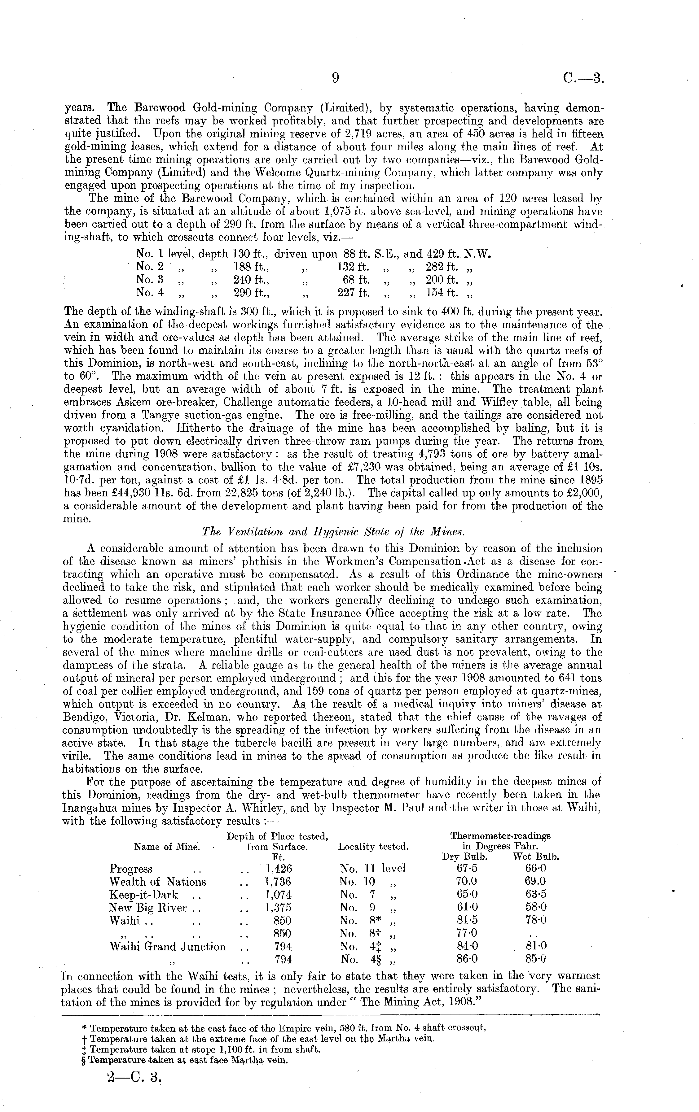 years. The Barewood Gold-mining Company (Limited), by systematic operations, having demonstrated that the reefs may be worked profitably, and that further prospecting and developments are quite justified. Upon the original mining reserve of 2,719 acres, an area of 450 acres is held in fifteen gold-mining leases, which extend for a distance of about four miles along the main lines of reef. At the present time mining operations are only carried out by two companies—viz., the Barewood Goldmining Company (Limited) and the Welcome Quartz-mining Company, which latter company was only engaged upon prospecting operations at the time of my inspection. The mine of the Barewood Company, which is contained within an area of 120 acres leased by the company, is situated at an altitude of about 1,075 ft. above sea-level, and mining operations have been carried out to a depth of 290 ft. from the surface by means of a vertical three-compartment wind-ing-shaft, to which crosscuts connect four levels, viz.— No. 1 level, depth 130 ft., driven upon 88 ft. S.E., and 429 ft. N.W. No. 2 „ „ 188 ft., „ 132 ft. „ „ 282 ft. „ No. 3 „ „ 240 ft., „ 68 ft. „ „ 200 ft. „ No. 4 „ „ 290 ft., „ 227 ft. „ „ 154 ft. „ The depth of the winding-shaft is 300 ft., which it is proposed to sink to 400 ft. during the present year. An examination of the deepest workings furnished satisfactory evidence as to the maintenance of the vein in width and ore-values as depth has been attained. The average strike of the main line of reef, which has been found to maintain its course to a greater length than is usual with the quartz reefs of this Dominion, is north-west and south-east, inclining to the north-north-east at an angle of from 53° to 60°. The maximum width of the vein at present exposed is 12 ft. : this appears in the No. 4 or deepest level, but an average width of about 7 ft. is exposed in the mine. The treatment plant embraces Askem ore-breaker, Challenge automatic feeders, a 10-head mill and Wilfley table, all being driven from a Tangye suction-gas engine. The ore is free-milling, and the tailings are considered not worth cyanidation. Hitherto the drainage of the mine has been accomplished by baling, but it is proposed to put down electrically driven three-throw ram pumps during the year. The returns from the mine during 1908 were satisfactory : as the result of treating 4,793 tons of ore by battery amalgamation and concentration, bullion to the value of £7,230 was obtained, being an average of £1 10s. 10-7 d. per ton, against a cost of £1 ls. 4-Bd. per ton. The total production from the mine since 1895 has been £44,930 lis. 6d. from 22,825 tons (of 2,240 lb.). The capital called up only amounts to £2,000, a considerable amount of the development and plant having been paid for from the production of the mine. The Ventilation and Hygienic State of the Mines. A considerable amount of attention has been drawn to this Dominion by reason of the inclusion of the disease known as miners' phthisis in the Workmen's Compensation Act as a disease for contracting which an operative must be compensated. As a result of this Ordinance the mine-owners declined to take the risk, and stipulated that each worker should be medically examined before being allowed to resume operations ; and, the workers generally declining to undergo such examination, a settlement was only arrived at by the State Insurance Office accepting the risk at a low rate. The hygienic condition of the mines of this Dominion is quite equal to that in any other country, owing to the moderate temperature, plentiful water-supply, and compulsory sanitary arrangements. In several of the mines where machine drills or coal-cutters are used dust is not prevalent, owing to the dampness of the strata. A reliable gauge as to the general health of the miners is the average annual output of mineral per person employed underground ; and this for the year 1908 amounted to 641 tons of coal per collier employed underground, and 159 tons of quartz per person employed at quartz-mines, which output is exceeded in no country. As. the result of a medical inquiry into miners' disease at Bendigo, Victoria, Dr. Kelman. who reported thereon, stated that the chief cause of the ravages of consumption undoubtedly is the spreading of the infection by workers suffering from the disease in an active state. In that stage the tubercle bacilli are present in very large numbers, and are extremely virile. The same conditions lead in mines to the spread of consumption as produce the like result in habitations on the surface. For the purpose of ascertaining the temperature and degree of humidity in the deepest mines of this Dominion, readings from the dry- and wet-bulb thermometer have recently been taken in the Inangahua mines by Inspector A. Whitley, and by Inspector M. Paul and the writer in those at Waihi, with the following satisfactory results : — Depth of Place tested, Thermometer-readings Name of Mine. ■ from Surface. Locality tested. in Degrees Fahr. Ft. Dry Bulb. Wet Bulb. Progress .. .. 1,426 No. 11 level 67-5 66-0 Wealth of Nations .. 1,736 No. 10 „ 70.0 69.0 Keep-it-Dark .. .. 1,074 No. 7 „ 65-0 63-5 New Big River .. .. 1,375 No. 9 „ 61-0 58-0 Waihi .. .. .. 850 No. 8* „ 81-5 78-0 „ 850 No. 8f „ 77-0 Waihi Grand Junction .. 794 No. 4J „ 84-0 81-0 794 No. 4§ „ 86-0 85-0 In connection with the Waihi tests, it is only fair to state that they were taken in the very warmest places that could be found in the mines ; nevertheless, the results are entirely satisfactory. The sanitation of the mines is provided for by regulation under " The Mining Act, 1908."