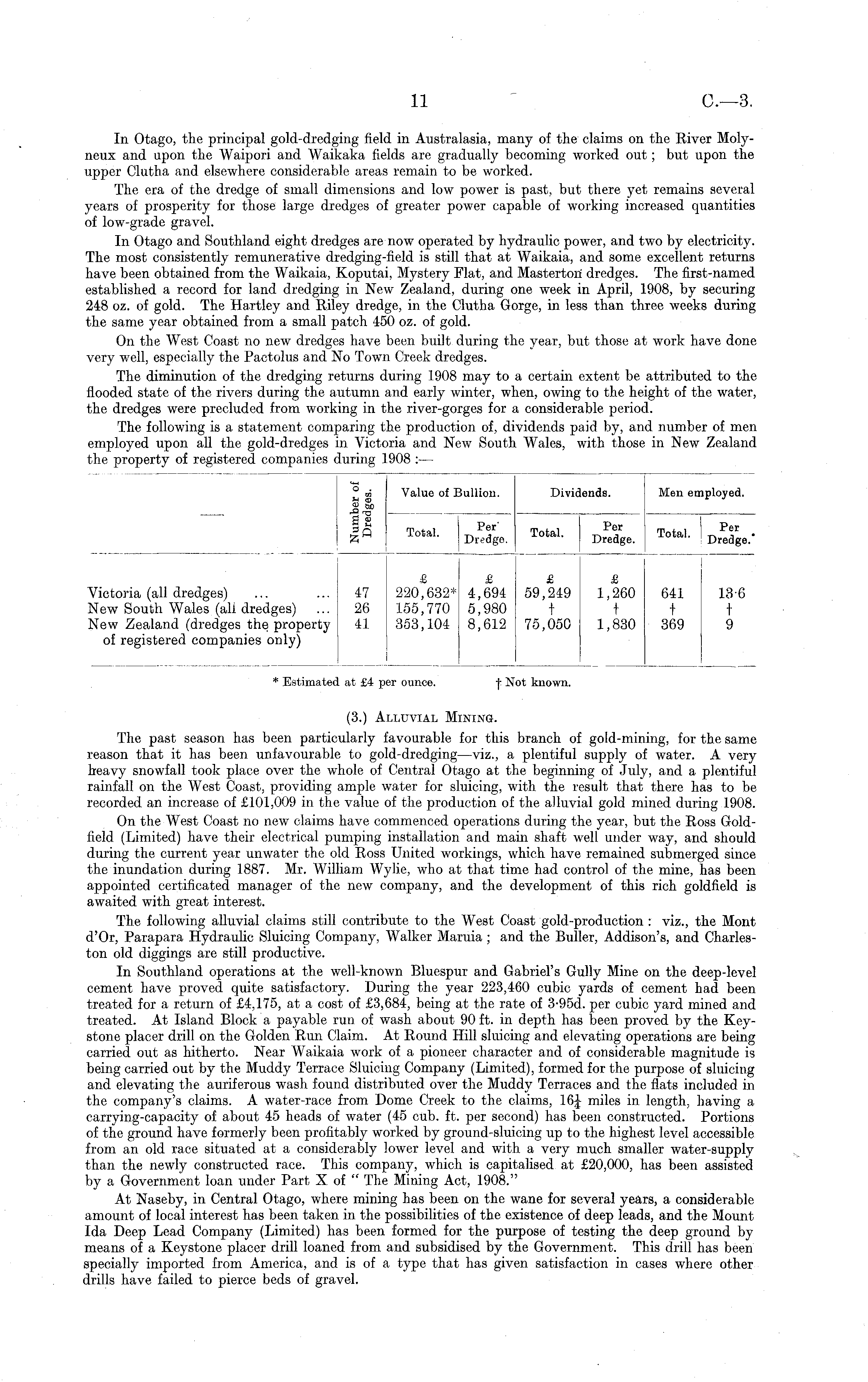 In Otago, the principal gold-dredging field in Australasia, many of the claims on the River Molyneux and upon the Waipori and Waikaka fields are gradually becoming worked out; but upon the upper Clutha and elsewhere considerable areas remain to be worked. The era of the dredge of small dimensions and low power is past, but there yet remains several years of prosperity for those large dredges of greater power capable of working increased quantities of low-grade gravel. In Otago and Southland eight dredges are now operated by hydraulic power, and two by electricity. The most consistently remunerative dredging-field is still that at Waikaia, and some excellent returns have been obtained from the Waikaia, Koputai, Mystery Flat, and Masterton dredges. The first-named established a record for land dredging in New Zealand, during one week in April, 1908, by securing 248 oz. of gold. The Hartley and Riley dredge, in the Clutha Gorge, in less than three weeks during the same year obtained from a small patch 450 oz. of gold. On the West Coast no new dredges have been built during the year, but those at work have done very well, especially the Pactolus and No Town Creek dredges. The diminution of the dredging returns during 1908 may to a certain extent be attributed to the flooded state of the rivers during the autumn and early winter, when, owing to the height of the water, the dredges were precluded from working in the river-gorges for a considerable period. The following is a statement comparing the production of, dividends paid by, and number of men employed upon all the gold-dredges in Victoria and New South Wales, with those in New Zealand the property of registered companies during 1908 : —
