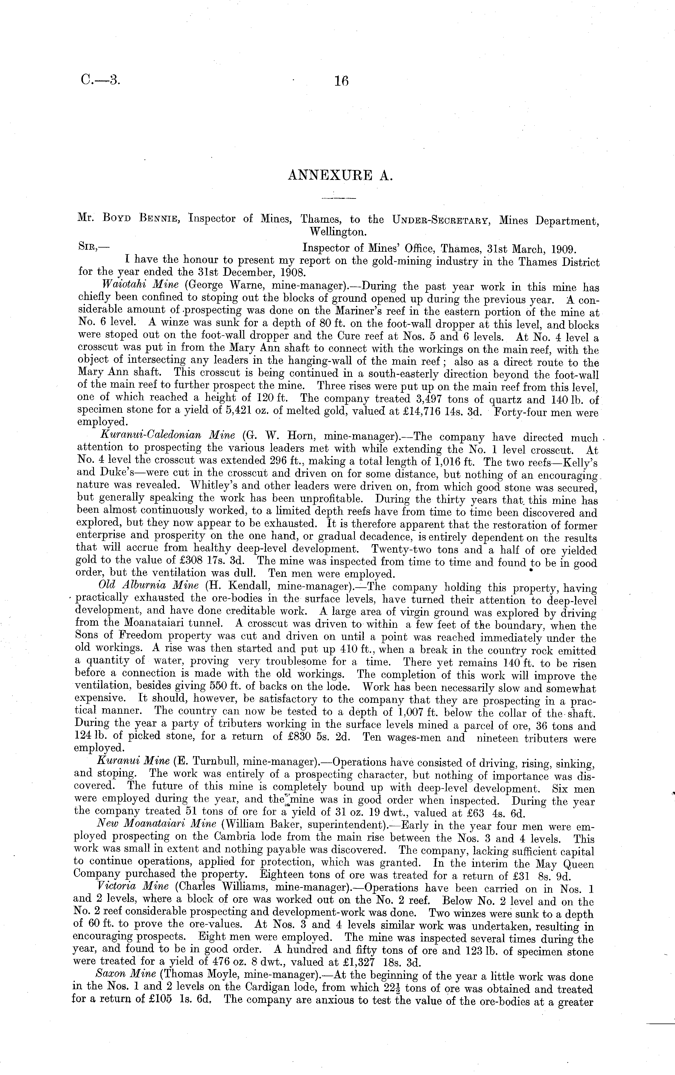 Mr. Boyd Bennte, Inspector of Mines, Thames, to the Under-Secretary, Mines Department, Wellington. Sir — Inspector of Mines' Office, Thames, 31st March, 1909. I have the honour to present my report on the gold-mining industry in the Thames District for the year ended the 31st December, 1908. Waiotahi Mine (George Warne, mine-manager).—During the past year work in this mine has chiefly been confined to stoping out the blocks of ground opened up during the previous year. A considerable amount of .prospecting was done on the Mariner's reef in the eastern portion of the mine at No. 6 level. A winze was sunk for a depth of 80 ft. on the foot-wall dropper at this level, and blocks were stoped out on the foot-wall dropper and the Cure reef at Nos. 5 and 6 levels. At No. 4 level a crosscut was put in from the Mary Ann shaft to connect with the workings on the main reef, with the object of intersecting any leaders in the hanging-wall of the main reef ; also as a direct route to the Mary Ann shaft. This crosscut is being continued in a south-easterly direction beyond the foot-wall of the main reef to further prospect the mine. Three rises were put up on the main reef from this level, one of which reached a height of 120 ft. The company treated 3,497 tons of quartz and 140 lb. of specimen stone for a yield of 5,421 oz. of melted gold, valued at £14,716 14s. 3d. Forty-four men were employed. Kuranui-Caledonian Mine (G. W. Horn, mine-manager).—The company have directed much attention to prospecting the various leaders met with while extending the No. 1 level crosscut. At No. 4 level the crosscut was extended 296 ft., making a total length of 1,016 ft. The two reefs—Kelly's and Duke's—were cut in the crosscut and driven on for some distance, but nothing of an encouraging nature was revealed. Whitley's and other leaders were driven on, from which good stone was secured, but generally speaking the work has been unprofitable. During the thirty years that, this mine has been almost continuously worked, to a limited depth reefs have from time to time been discovered and explored, but they now appear to be exhausted. It is therefore apparent that the restoration of former enterprise and prosperity on the one hand, or gradual decadence, is entirely dependent on the results that will accrue from healthy deep-level development. Twenty-two tons and a half of ore yielded gold to the value of £308 17s. 3d. The mine was inspected from time to time and found to be in good order, but the ventilation was dull. Ten men were employed. Old Alburnia Mine (H. Kendall, mine-manager).—The company holding this property, having ■ practically exhausted the ore-bodies in the surface levels, have turned their attention to deep-level development, and have done creditable work. A large area of virgin ground was explored by driving from the Moanataiari tunnel. A crosscut was driven to within a few feet of the boundary, when the Sons of Freedom property was cut and driven on until a point was reached immediately under the old workings. A rise was then started and. put up 410 ft., when a break in the country rock emitted a quantity of water, proving very troublesome for a time. There yet remains 140 ft. to be risen before a connection is made with the old workings. The completion'of this work will improve the ventilation, besides giving 550 ft. of backs on the lode. Work has been necessarily slow and somewhat expensive. It should, however, be satisfactory to the company that they are prospecting in a practical manner. The country can now be tested to a depth of 1,007 ft. below the collar of the shaft. During the year a party of tributers working in the surface levels mined a parcel of ore, 36 tons and 124 lb. of picked stone, for a return of £830 ss. 2d. Ten wages-men and nineteen tributers were employed. Kuranui Mine (E. Turnbull, mine-manager).—Operations have consisted of driving, rising, sinking, and stoping. The work was entirely of a prospecting character, but nothing of importance was discovered. The future of this mine is completely bound up with deep-level development. Six men were employed during the year, and thejnine was in good order when inspected. During the year the company treated 51 tons of ore for a yield of 3.1 oz. 19 dwt., valued at £63 4s. 6d. New Moanataiari Mine (William Baker, superintendent).—Early in the year four men were employed prospecting on the Cambria lode from the main rise between the Nos. 3 and 4 levels. This work was small in extent and nothing payable was discovered. The company, lacking sufficient capital to continue operations, applied for protection, which was granted. In the interim the May Queen Company purchased the property. Eighteen tons of ore was treated for a return of £31 Bs. 9d. Victoria Mine (Charles Williams, mine-manager).—Operations have been carried on in Nos. 1 and 2 levels, where a block of ore was worked out on the No. 2 reef. Below No. 2 level and on the No. 2 reef considerable prospecting and development-work was done. Two winzes were sunk to a depth of 60 ft. to prove the ore-values. At Nos. 3 and 4 levels similar work was undertaken, resulting in encouraging prospects. Eight men were employed. The mine was inspected several times during the year, and found to be in good order. A hundred and fifty tons of ore and 123 lb. of specimen stone were treated for a yield of 476 oz. 8 dwt., valued at £1,327 18s. 3d. Saxon Mine (Thomas Moyle, mine-manager).—At the beginning of the year a little work was done in the Nos. 1 and 2 levels on the Cardigan lode, from which 22| tons of ore was obtained and treated for a return of £105 ls. 6d. The company are anxious to test the value of the ore-bodies at a greater