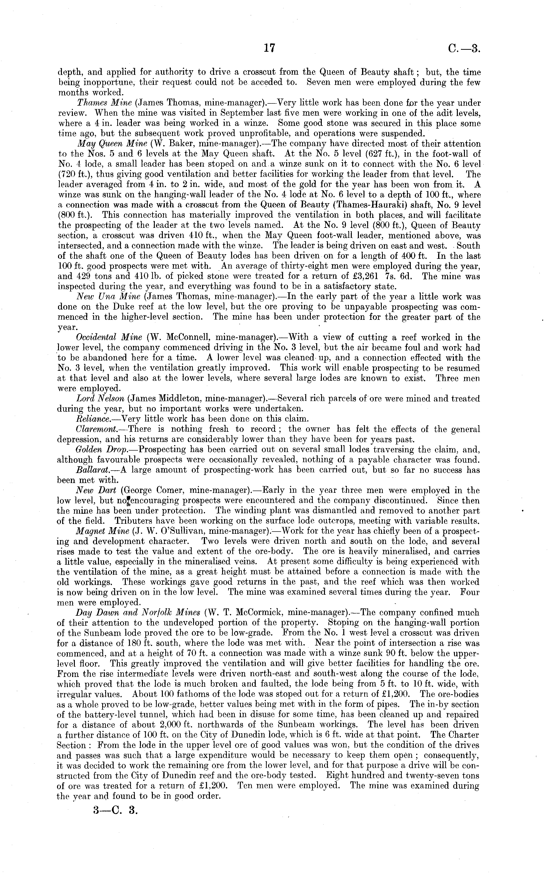 depth, and applied for authority to drive a crosscut from the Queen of Beauty shaft; but, the time being inopportune, their request could not be acceded to. Seven men were employed during the few months worked. Thames Mine (James Thomas, mine-manager).—Very little work has been done for the year under review. When the mine was visited in September last five men were working in one of the adit levels, where a 4 in. leader was being worked in a winze. Some good stone was secured in this place some time ago, but the subsequent work proved unprofitable, and operations were suspended. May Queen Mine (W. Baker, mine-manager).—The company have directed most of their attention to the Nos. 5 and 6 levels at the May Queen shaft. At the No. 5 level (627 ft.), in the foot-wall of No. 1 lode, a small leader has been stoped on and.a winze sunk on it to connect with the No. 6 level (720 ft.), thus giving good ventilation and better facilities for working the leader from that level. The leader averaged from 4 in. to 2 in. wide, and most of the gold for the year has been won from it. A winze was sunk on the hanging-wall leader of the No. 4 lode at No. 6 level to a depth of 100 ft., where a connection was made with a crosscut from the Queen of Beauty (Thames-Hauraki) shaft, No. 9 level (8(X) ft.). This connection has materially improved the ventilation in both places, and will facilitate the prospecting of the leader at the two levels named. At the No. 9 level (800 ft.), Queen of Beauty section, a crosscut was driven 410 ft., when the May Queen foot-wall leader, mentioned above, was intersected, and a connection made with the winze. The leader is being driven on east and west. South of the shaft one of the Queen of Beauty lodes has been driven on for a length of 400 ft. In the last 100 ft. good prospects were met with. An average of thirty-eight men were employed during the year, and 429 tons and 410 lb. of picked stone were treated for a return of £3,261 7s. 6d. The mine was inspected during the year, and everything was found to be in a satisfactory state. New Una Mine (James Thomas, mine-manager). —In the early part of the year a little work was done on the Duke reef at the low level, but the ore proving to be unpayable prospecting was commenced in the higher-level section. The mine has been under protection for the greater part of the year. Occidental Mine (W. McConnell, mine-manager).—With a view of cutting a reef worked in the lower level, the company commenced driving in the No. 3 level, but the air became foul and work had to be abandoned here for a time. A lower level was cleaned up, and a connection effected with the No. 3 level, when the ventilation greatly improved. This work will enable prospecting to be resumed at that level and also at the lower levels, where several large lodes are known to exist. Three men were employed. Lord Nelson (James Middleton, mine-manager).—Several rich parcels of ore were mined and treated during the year, but no important works were undertaken. Reliance. —Very little work has been done on this claim. Claremont. —There is nothing fresh to record ; the owner has felt the effects of the general depression, and his returns are considerably lower than they have been for years past. Golden Drop. —Prospecting has been carried out on several small lodes traversing the claim, and, although favourable prospects were occasionally revealed, nothing of a payable character was found. Ballarat. —A large amount of prospecting-work has been carried out, but so far no success has been met with. New Dart (George Comer, mine-manager).—Early in the year three men were employed in the low level, but no'encouraging prospects were encountered and the company discontinued. Since then the mine has been under protection. The winding plant was dismantled and removed to another part of the field. Tributers have been working on the surface lode outcrops, meeting with variable results. Magnet Mine (J. W. O'Sullivan, mine-manager).—Work for the year has chiefly been of a prospecting and development character. Two levels were driven north and south on the lode, and several rises made to test the value and extent of the ore-body. The ore is heavily mineralised, and carries a little value, especially in the mineralised veins. At present some difficulty is being experienced with the ventilation of the mine, as a great height must be attained before a connection is made with the old workings. These workings gave good returns in the past, and the reef which was then worked is now being driven on in the low level. The mine was examined several times during the year. Four men were employed. Day Dawn and Norfolk Mines (W. T. McCormick, mine-manager).—The company confined much of their attention to the undeveloped portion of the property. Stoping on the hanging-wall portion of the Sunbeam lode proved the ore to be low-grade. From the No. 1 west level a crosscut was driven for a distance of 180 ft. south, where the lode was met with. Near the point of intersection a rise was commenced, and at a height of 70 ft. a connection was made with a winze sunk 90 ft. below the upperlevel floor. This greatly improved the ventilation and will give better facilities for handling the ore. From the rise intermediate levels were driven north-east and south-west along the course of the lode, which proved that the lode is much broken and faulted, the lode being from 5 ft. to 10 ft. wide, with irregular values. About 100 fathoms of the lode was stoped out for a return of £1,200. The ore-bodies as a whole proved to be low-grade, better values being met with in the form of pipes. The in-by section of the battery-level tunnel, which had been in disuse for some time, has been cleaned up and repaired for a distance of about 2,000 ft. northwards of the Sunbeam workings. The level has been driven a further distance of 100 ft. on the City of Dunedin lode, which is 6 ft. wide at that point. The Charter Sect
