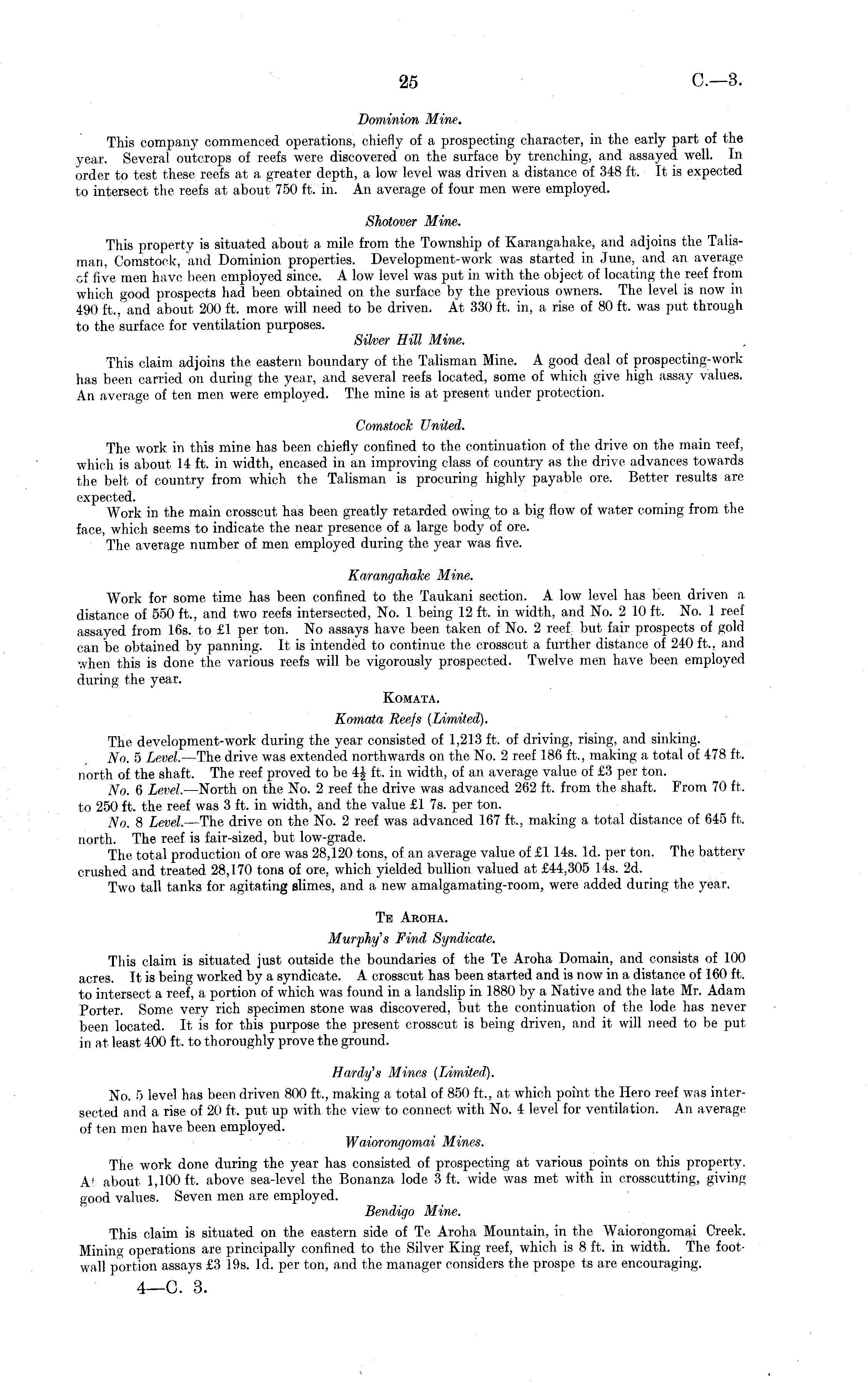 Dominion Mine. This company commenced operations, chiefly of a prospecting character, in the early part of the year. Several outcrops of reefs were discovered on the surface by trenching, and assayed well. In order to test these reefs at a greater depth, a low level was driven a distance of 348 ft. It is expected to intersect the reefs at about 750 ft. in. An average of four men were employed. Shotover Mine. This property is situated about a mile from the Township of Karangahake, and adjoins the Talisman. Comstock, and Dominion properties. Development-work was started in June, and an average of five men have been employed since. A low level was put in with the object of locating the reef from which good prospects had been obtained on the surface by the previous owners. The level is now in 490 ft., and about 200 ft. more will need to be driven. At 330 ft. in, a rise of 80 ft. was put through to the surface for ventilation purposes. Silver Hill Mine. This claim adjoins the eastern boundary of the Talisman Mine. A good deal of prospecting-work has been carried on during the year, and several reefs located, some of which give high assay values. An average of ten men were employed. The mine is at present under protection. Comstock United. The work in this mine has been chiefly confined to the continuation of the drive on the main reef, which is about 14 ft. in width, encased in an improving class of country as the drive advances towards the belt of country from which the Talisman is procuring highly payable ore. Better results are expected. Work in the main crosscut has been greatly retarded owing to a big flow of water coming from the face, which seems to indicate the near presence of a large body of ore. The average number of men employed during the year was five. Karangahake Mine. Work for some time has been confined to the Taukani section. A low level has been driven a distance of 550 ft., and two reefs intersected, No. 1 being 12 ft. in width, and No. 210 ft. No. 1 reef assayed from 16s. to £1 per ton. No assays have been taken of No. 2 reef but fair prospects of gold can be obtained by panning. It is intended to continue the crosscut a further distance of 240 ft., and when this is done the various reefs will be vigorously prospected. Twelve men have been employed during the year. KOMATA. Komata Reefs (Limited). The development-work during the year consisted of 1,213 ft. of driving, rising, and sinking. No. 5 Level. —The drive was extended northwards on the No. 2 reef 186 ft., making a total of 478 ft, north of the shaft. The reef proved to be 4J ft. in width, of an average value of £3 per ton. No. 6 Level. —North on the No. 2 reef the drive was advanced 262 ft. from the shaft. From 70 ft, to 250 ft. the reef was 3 ft. in width, and the value £1 7s. per ton. No. 8 Level. —The drive on the No. 2 reef was advanced 167 ft., making a total distance of 645 ft, north. The reef is fair-sized, but low-grade. The total production of ore was 28,120 tons, of an average value of £1 14s. Id. per ton. The battery crushed and treated 28,170 tons of ore, which yielded bullion valued at £44,305 14s. 2d. Two tall tanks for agitating slimes, and a new amalgamating-room, were added during the year. Te Aroha. Murphy's Find Syndicate. This claim is situated just outside the boundaries of the Te Aroha Domain, and consists of 100 acres. It is being worked by a syndicate. A crosscut has been started and is now in a distance of 160 ft. to intersect a reef, a portion of which was found in a landslip in 1880 by a Native and the late Mr. Adam Porter. Some very rich specimen stone was discovered, but the continuation of the lode has never been located. It is for this purpose the present crosscut is being driven, and it will need to be put in at least 400 ft, to thoroughly prove the ground. Hardy's Mines (Limited). No. 5 level has been driven 800 ft,, making a total of 850 ft., at which point the Hero reef was intersected and a rise of 20 ft, put up with the view to connect with No. 4 level for ventilation. An average of ten men have been employed. Waiorongomad Mines. The work done during the year has consisted of prospecting at various points on this property. A 1 about 1,100 ft. above sea-level the Bonanza lode 3 ft. wide was met with in crosscutting, giving good values. Seven men are employed. Bendigo Mine. This claim is situated on the eastern side of Te Aroha Mountain, in the Waiorongomai Creek. Mining operations are principally confined to the Silver King reef, which is 8 ft. in width. The footwall portion assays £3 19s. Id. per ton, and the manager considers the prospe ts are encouraging.