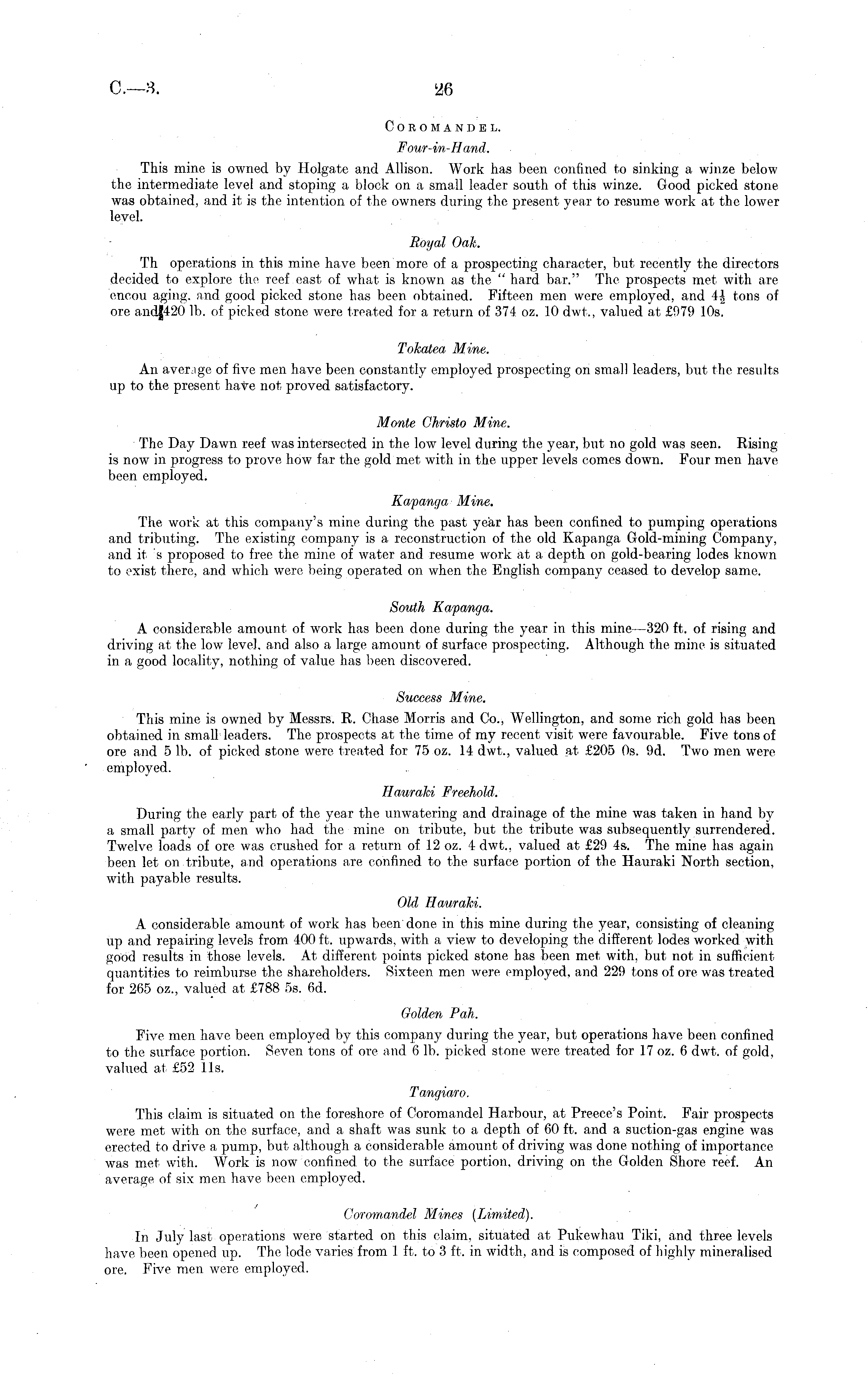 Coromandel. Four-in-Hand. This mine is owned by Holgate and Allison. Work has been confined to sinking a winze below the intermediate level and stoping a block on a small leader south of this winze. Good picked stone was obtained, and it is the intention of the owners during the present year to resume work at the lower level. Royal Oak. Th operations in this mine have been more of a prospecting character, but recently the directors decided to explore the reef east of what is known as the " hard bar." The prospects met with are encou aging, and good picked stone has been obtained. Fifteen men were employed, and 4J tons of ore and|42o lb. of picked stone were treated for a return of 374 oz. 10 dwt., valued at £979 10s. Tokatea Mine. An average of five men have been, constantly employed prospecting on small leaders, but the results up to the present hate not proved satisfactory. Monte Christo Mine. The Day Dawn reef was intersected in the low level during the year, but no gold was seen. Risingis now in progress to prove how far the gold met with in the upper levels comes down. Four men have been employed. Kapanga Mine. The work at this company's mine during the past year has been confined to pumping operations and tributing. The existing company is a reconstruction of the old Kapanga Gold-mining Company, and it s proposed to free the mine of water and resume work at a depth on gold-bearing lodes known to exist there, and which were being operated on when the English company ceased to develop same. South Kapanga. A considerable amount of work has been done during the year in this mine—32o ft, of rising and driving at the low level, and also a large amount of surface prospecting. Although the mine is situated in a good locality, nothing of value has been discovered. Success Mine. This mine is owned by Messrs. R. Chase Morris and Co., Wellington, and some rich gold has been obtained in small leaders. The prospects at the time of my recent visit were favourable. Five tons of ore and 5 lb. of picked stone were treated for 75 oz. 14 dwt., valued at £205 Os. 9d. Two men were employed. Hauraki Freehold. During the early part of the year the unwatering and drainage of the mine was taken in hand by a small party of men who had the mine on tribute, but the tribute was subsequently surrendered. Twelve loads of ore was crushed for a return of 12 oz. 4 dwt., valued at £29 4s. The mine has again been let on tribute, and operations are confined to the surface portion of the Hauraki North section, with payable results. Old Hauraki. A considerable amount of work has been done in this mine during the year, consisting of cleaning up and repairing levels from 400 ft. upwards, with a view to developing the different lodes worked with good results in those levels. At different points picked stone has been met with, but not in sufficient quantities to reimburse the shareholders. Sixteen men were employed, and 229 tons of ore was treated for 265 oz., valued at £788 ss. 6d. Golden Pah. Five men have been employed by this company during the year, but operations have been confined to the surface portion. Seven tons of ore and 6 lb. picked stone were treated for 17 oz. 6 dwt. of gold, valued at £52 lis. Tangia.ro. This claim is situated on the foreshore of Coromandel Harbour, at Preece's Point. Fair prospects were met with on the surface, and a shaft was sunk to a depth of 60 ft. and a suction-gas engine was erected to drive a pump, but although a considerable amount of driving was done nothing of importance was met with. Work is now confined to the surface portion, driving on the Golden Shore reef. An average of six men have been employed. Coromandel Mines (Limited). In July last operations were started on this claim, situated at Pukewhau Tiki, and three levels have been opened up. The lode varies from 1 ft, to 3 ft. in width, and is composed of highly mineralised ore. Five men were employed.