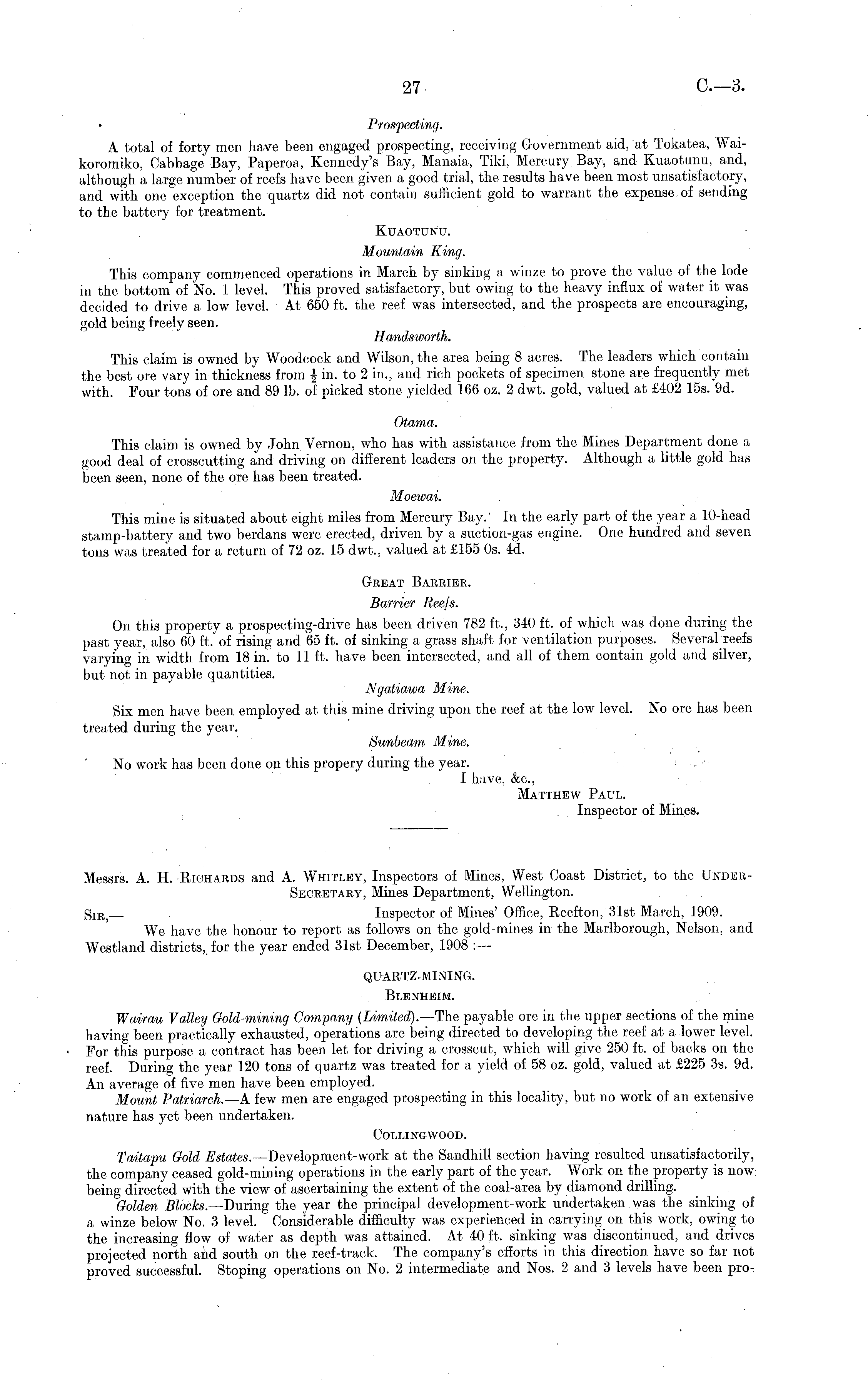 Messrs. A. H. Richards and A. Whitley, Inspectors of Mines, West Coast District, to the UnderSecretary, Mines Department, Wellington. g IB Inspector of Mines' Office, Reefton, 31st March, 1909. We have the honour to report as follows on the gold-mines in the Marlborough, Nelson, and Westland districts, for the year ended 31st December, 1908 :— QDARTZ-MINING. Blenheim. Wairau Valley Gold-mining Company (Limited). —The payable ore in the upper sections of the mine having been practically exhausted, operations are being directed to developing the reef at a lower level. For this purpose a contract has been let for driving a crosscut, which will give 250 ft. of backs on the reef. During the year 120 tons of quartz was treated for a yield of 58 oz. gold, valued at £225 3s. 9d. An average of five men have been employed. Mount Patriarch.—A few men are engaged prospecting in this locality, but no work of an extensive nature has yet been undertaken. Colling wood. Taitapu Gold Estates.— Development-work at the Sandhill section having resulted unsatisfactorily, the company ceased gold-mining operations in the early part of the year. Work on the property is now being directed with the view of ascertaining the extent of the coal-area by diamond drilling. Golden Blocks. —During the year the principal development-work undertaken was the sinking of a winze below No. 3 level. Considerable difficulty was experienced in carrying on this work, owing to the increasing flow of water as depth was attained. At 40 ft. sinking was discontinued, and drives projected north and south on the reef-track. The company's efforts in this direction have so far not proved successful. Stoping operations on No. 2 intermediate and Nos. 2 and 3 levels have been pro-