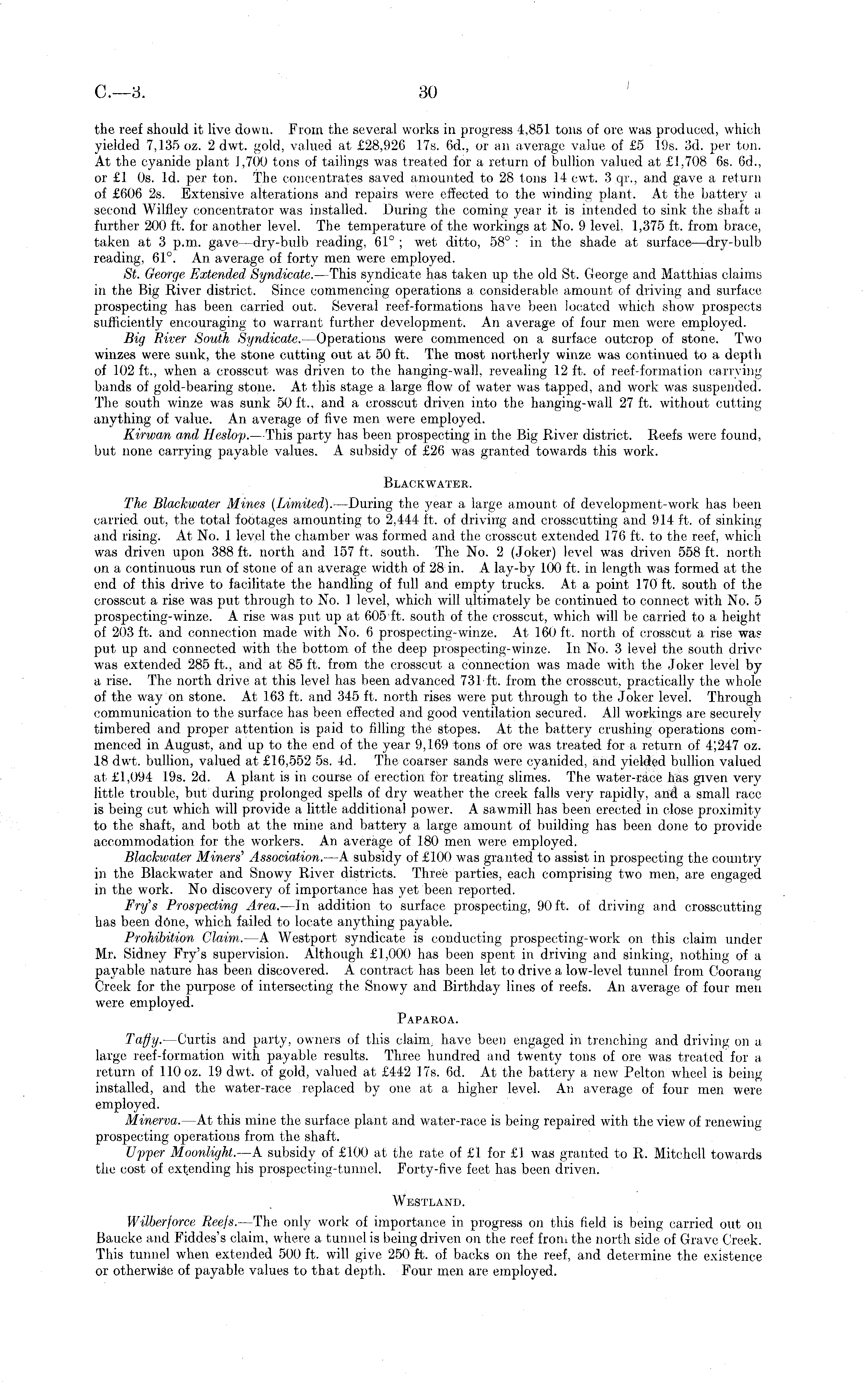 the reef should it live down. From the several works in progress 4,851 tons of ore was produced, which yielded 7,135 oz. 2 dwt. gold, valued at £28,926 17s. 6d., or an average value of £5 19s. 3d. per ton. At the cyanide plant J,700 tons of tailings was treated for a return of bullion valued at £1,708 6s. 6d., or £1 Os. Id. per ton. The concentrates saved amounted to 28 tons 14 cwt. 3 qr., and gave a return of £606 2s. Extensive alterations and repairs were effected to the winding plant. At the battery a second Wilfley concentrator was installed. During the coming year it is intended to sink the shaft a further 200 ft. for another level. The temperature of the workings at No. 9 level. 1,375 ft. from brace, taken at 3 p.m. gaye —dry-bulb reading, 6i° ; wet ditto, 58° : in the shade at surface —dry-bulb reading, 61°. An average of forty men were employed. St. George Extended Syndicate. —This syndicate has taken up the old St. George and Matthias claims in the Big River district. Since commencing operations a considerable amount of driving and surface prospecting has been carried out. Several reef-formations have been located which show prospects sufficiently encouraging to warrant further development. An average of four men were employed. Big River South Syndicate. —Operations were commenced on a surface outcrop of stone. Two winzes were sunk, the stone cutting out at 50 ft. The most northerly winze was continued to a depth of 102 ft., when a crosscut was driven to the hanging-wall, revealing 12 ft. of reef-format ion carrying bands of gold-bearing stone. At this stage a large flow of water was tapped, and work was suspended. The south winze was sunk 50 ft., and a crosscut driven into the hanging-wall 27 ft. without cutting anything of value. An average of five men were employed. Kirwan and Heslop. —This party has been prospecting in the Big River district. Reefs were found, but none carrying payable values. A subsidy of £26 was granted towards this work. Blackwater. The Blackwater Mines (Limited). —During the year a large amount of development-work has been carried out, the total footages amounting to 2,444 ft, of driving and crosscutting and 914 ft. of sinking and rising. At No. 1 level the chamber was formed and the crosscut extended 176 ft. to the reef, which was driven upon 388 ft. north and 157 ft, south. The No. 2 (Joker) level was driven 558 ft. north on a continuous run of stone of an average width of 28 in. A lay-by 100 ft. in length was formed at the end of this drive to facilitate the handling of full and empty trucks. At a point 170 ft. south of the crosscut a rise was put through to No. 1 level, which will ultimately be continued to connect with No. 5 prospecting-winze. A rise was put up at 605 ft. south of the crosscut, which will be carried to a height of 203 ft. and connection made with No. 6 prospecting-winze. At 160 ft. north of crosscut a rise was put up and connected with the bottom of the deep prospecting-winze. In No. 3 level the south drive was extended 285 ft., and at 85 ft, from the crosscut a connection was made with the Joker level by a rise. The north drive at this level has been advanced 731 ft. from the crosscut, practically the whole of the way on stone. At 163 ft. and 345 ft. north rises were put through to the Joker level. Through communication to the surface has been effected and good ventilation secured. All workings are securely timbered and proper attention is paid to filling the stopes. At the battery crushing operations commenced in August, and up to the end of the year 9,169 tons of ore was treated for a return of 4;247 oz. 18 dwt, bullion, valued at £16,552 ss. 4d. The coarser sands were cyanided, and yielded bullion valued at £1,094 19s. 2d. A plant is in course of erection for treating slimes. The water-race has given very little trouble, but during prolonged spells of dry weather the creek falls very rapidly, and a small race is being cut which will provide a little additional power. A sawmill has been erected in close proximity to the shaft, and both at the mine and battery a large amount of building has been done to provide accommodation for the workers. An average of 180 men were employed. Blackwater Miners' Association. —A subsidy of £100 was granted to assist in prospecting the country in the Blackwater and Snowy River districts. Three parties, each comprising two men, are engaged in the work. No discovery of importance has yet been reported. Fry's Prospecting Area. —In addition to surface prospecting, 90ft. of driving and crosscutting has been done, which failed to locate anything payable. Prohibition Claim. —A Westport syndicate is conducting prospecting-work on this claim under Mr. Sidney Fry's supervision. Although £1,000 has been spent in driving and sinking, nothing of a payable nature has been discovered. A contract has been let to drive a low-level tunnel from Coorang Creek for the purpose of intersecting the Snowy and Birthday lines of reefs. An average of four men were employed. Paparoa. Taffy. —Curtis and party, owners of this claim, have been engaged in trenching and driving on a large reef-formation with payable results. Three hundred and twenty tons of ore was treated for a return of 110 oz. 19 dwt, of gold, valued at £442 17s. 6d. At the battery a new Pelton wheel is being installed, and the water-race replaced by one at a higher level. An average of four men were employed. Minerva. —At this mine the surface plant and water-race is being repaired with the view of renewing prospecting operations from the shaft. Upper Moonlight. —A subsidy of £100 at the rate of £1 for £1 was granted to R. Mitchell towards the cost of extending his prospecting-tumiel. Forty-five feet has been driven. Westland. Wilberforce Reefs. —The only work of importance in progress on this field is being carried out on Baucke and Fiddes's claim, where a tunnel is being driven on the reef from the north side of Grav