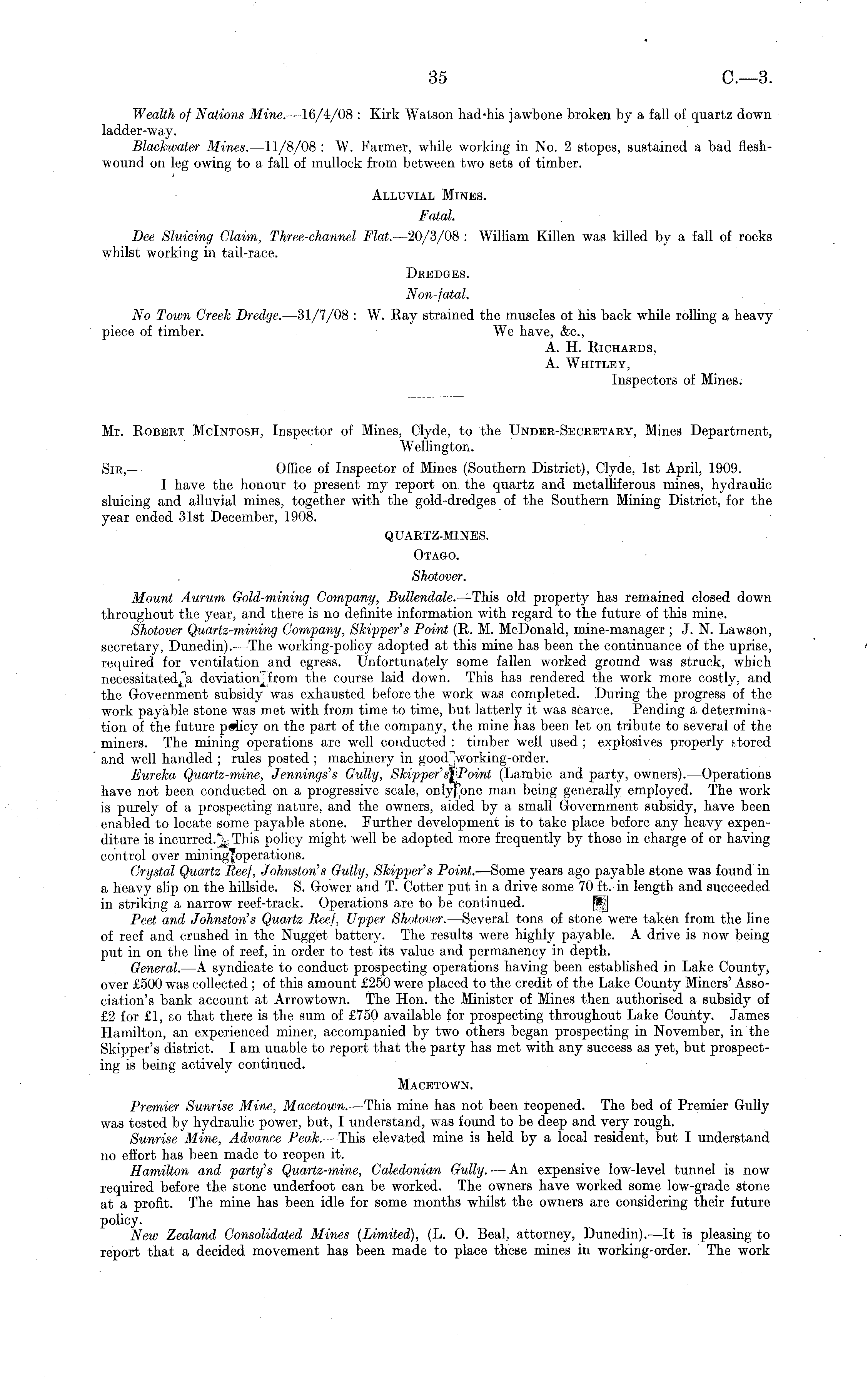 Wealth of Nations Mine. —16/4/08 : Kirk Watson had*his jawbone broken by a fall of quartz down ladder-way. Blackwater Mines. —11/8/08 : W. Farmer, while working in No. 2 stopes, sustained a bad fleshwound on leg owing to a fall of mullock from between two sets of timber. Alluvial Mines. Fatal. Dee Sluicing Claim, Three-channel Flat. —2o/3/08 : William Killen was killed by a fall of rocks whilst working in tail-race. Dredges. Non-fatal. No Town Creek Dredge. —3l/7/08 : W. Ray strained the muscles ot his back while rolling a heavy piece of timber. We have, &c, A. H. Richards, A. Whitley, Inspectors of Mines.