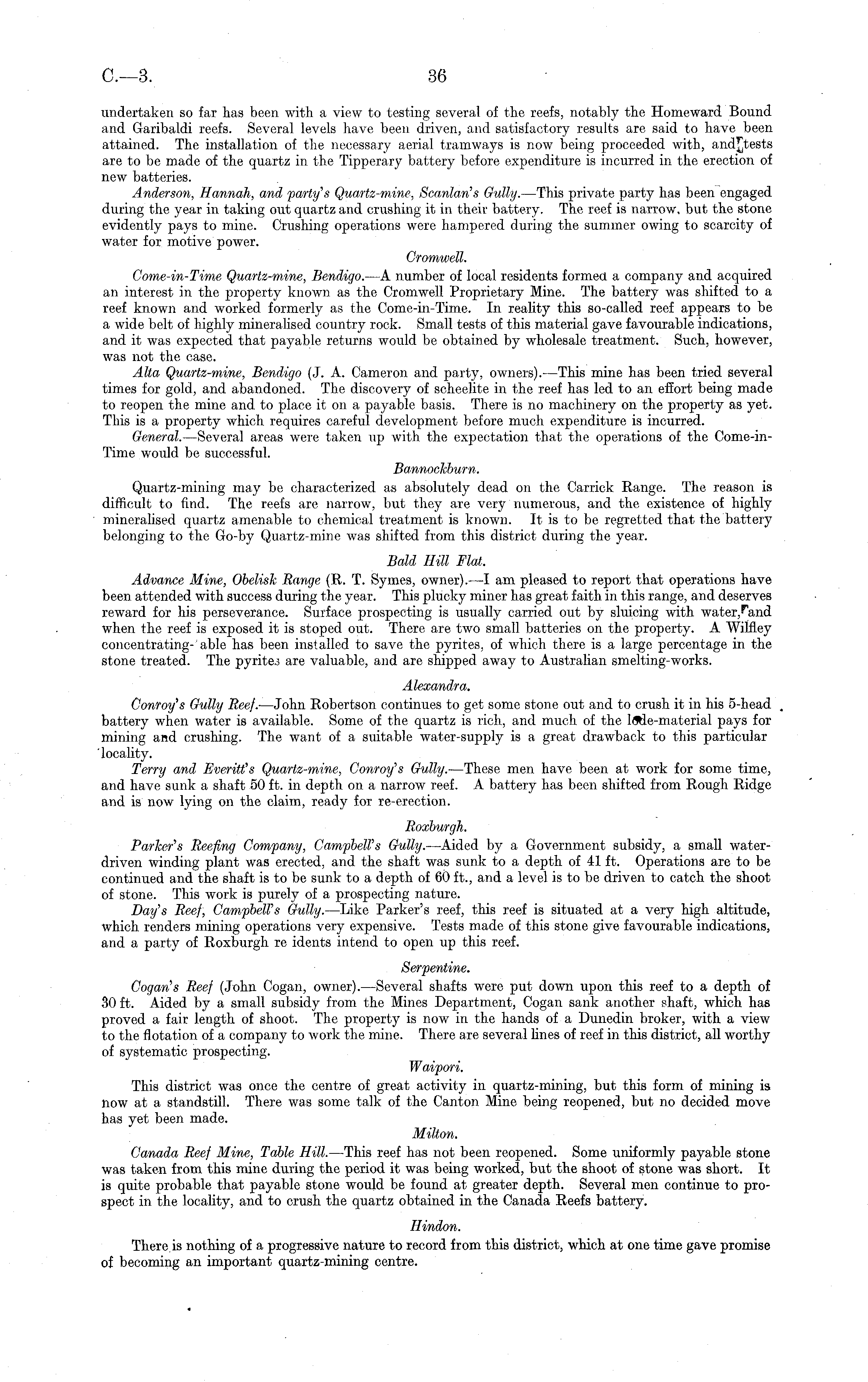 undertaken so far has been with a view to testing several of the reefs, notably the Homeward Bound and Garibaldi reefs. Several levels have been driven, and satisfactory results are said to have been attained. The installation of the necessary aerial tramways is now being proceeded with, are to be made of the quartz in the Tipperary battery before expenditure is incurred in the erection of new batteries. Anderson, Hannah, and party's Quartz-mine, Scanlan's Gully. —This private party has been engaged during the year in taking out quartz and crushing it in their battery. The reef is narrow, but the stone evidently pays to mine. Crushing operations were hampered during the summer owing to scarcity of water for motive power. Cromwell. Come-in-Time Quartz-mine, Bendigo. —A number of local residents formed a company and acquired an interest in the property known as the Cromwell Proprietary Mine. The battery was shifted to a reef known and worked formerly as the Come-in-Time. In reality this so-called reef appears to be a wide belt of highly mineralised country rock. Small tests of this material gave favourable indications, and it was expected that payable returns would be obtained by wholesale treatment. Such, however, was not the case. Alia Quartz-mine, Bendigo (J. A. Cameron and party, owners). —This mine has been tried several times for gold, and abandoned. The discovery of scheelite in the reef has led to an effort being made to reopen the mine and to place it on a payable basis. There is no machinery on the property as yet. This is a property which requires careful development before much expenditure is incurred. General. —Several areas were taken up with the expectation that the operations of the Come-in-Time would be successful. Bannockburn. Quartz-mining may be characterized as absolutely dead on the Carrick Range. The reason is difficult to find. The reefs are narrow, but they are very numerous, and the existence of highly mineralised quartz amenable to chemical treatment is known. It is to be regretted that the battery belonging to the Go-by Quartz-mine was shifted from this district during the year. Bald Hill Flat. Advance Mine, Obelisk Range (R. T. Symes, owner). —I am pleased to report that operations have been attended with success during the year. This plucky miner has great faith in this range, and deserves reward for his perseverance. Surface prospecting is usually carried out by sluicing with, water, F and when the reef is exposed it is stoped out. There are two small batteries on the property. A Wilfley concentrating- able has been installed to save the pyrites, of which there is a large percentage in the stone treated. The pyrites are valuable, and are shipped away to Australian smelting-works. Alexandra. Conroy's Gully Reef. —John Robertson continues to get some stone out and to crush it in his 5-head battery when water is available. Some of the quartz is rich, and much of the lade-material pays for mining and crushing. The want of a suitable water-supply is a great drawback to this particular locality. Terry and Everitfs Quartz-mine, Conroy's Gully. —These men have been at work for some time, and have sunk a shaft 50 ft. in depth on a narrow reef. A battery has been shifted from Rough Ridge and is now lying on the claim, ready for re-erection. Roxburgh. Parker's Reefing Company, Campbell's Gully. —Aided by a Government subsidy, a small waterdriven winding plant was erected, and the shaft was sunk to a depth of 41 ft. Operations are to be continued and the shaft is to be sunk to a depth of 60 ft., and a level is to be driven to catch the shoot of stone. This work is purely of a prospecting nature. Day's Reef, Campbell's Gully. —Like Parker's reef, this reef is situated at a very high altitude, which renders mining operations very expensive. Tests made of this stone give favourable indications, and a party of Roxburgh re idents intend to open up this reef. Serpentine. Cogan's Reef (John Cogan, owner). —Several shafts were put down upon this reef to a depth of 30 ft. Aided by a small subsidy from the Mines Department, Cogan sank another shaft, which has proved a fair length of shoot. The property is now in the hands of a Dunedin broker, with a view to the flotation of a company to work the mine. There are several lines of reef in this district, all worthy of systematic prospecting. Waipori. This district was once the centre of great activity in quartz-mining, but this form of mining is now at a standstill. There was some talk of the Canton Mine being reopened, but no decided move has yet been made. Milton. Canada Reef Mine, Table Hill. —This reef has not been reopened. Some uniformly payable stone was taken from this mine during the period it was being worked, but the shoot of stone was short. It is quite probable that payable stone would be found at greater depth. Several men continue to prospect in the locality, and to crush the quartz obtained in the Canada Reefs battery. Hindon. There.is nothing of a progressive nature to record from this district, which at one time gave promise of becoming an important quartz-mining centre.