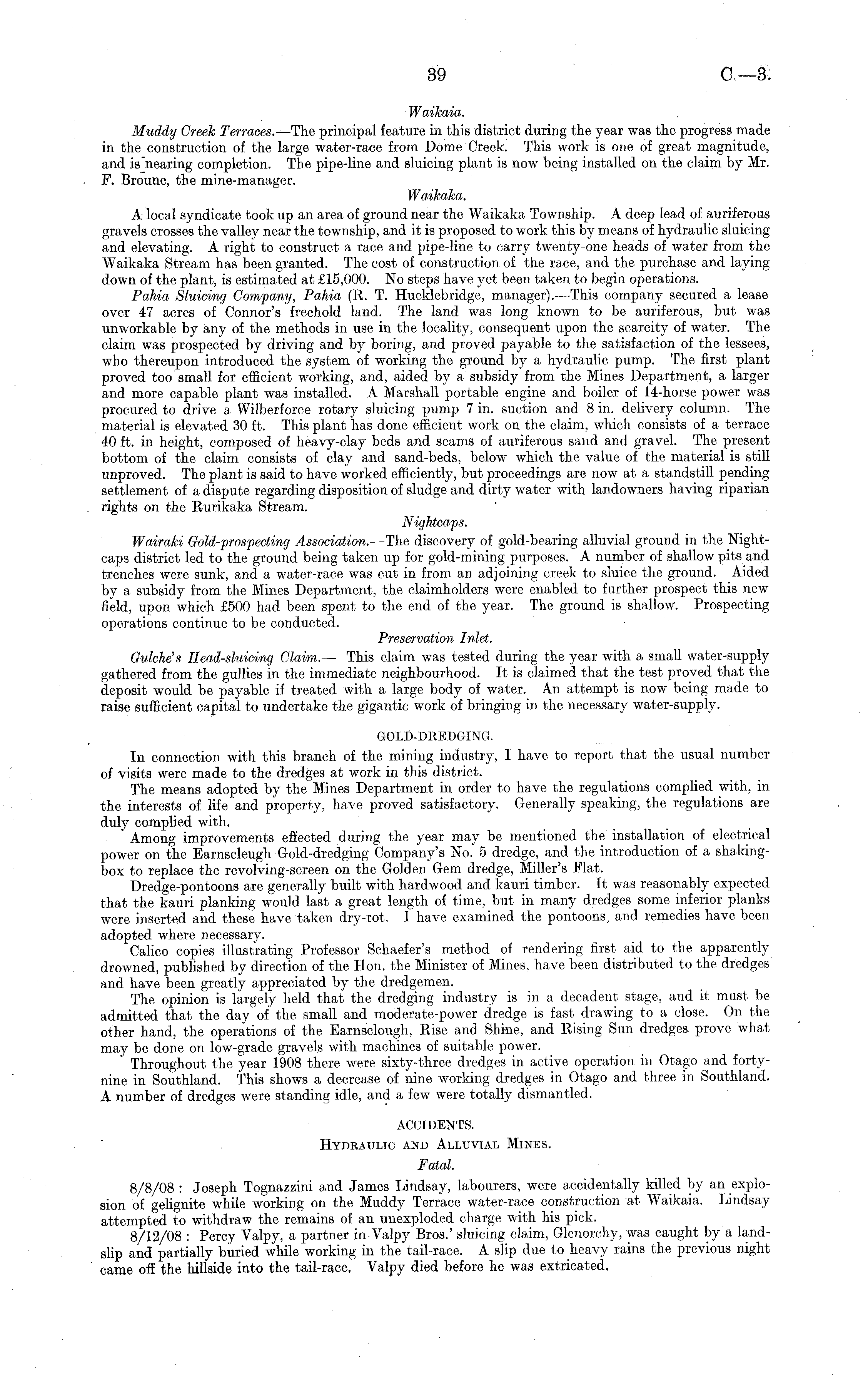 Waikaia. Muddy Creek Terraces. —The principal feature in this district during the year was the progress made in the construction of the large water-race from Dome Creek. This work is one of great magnitude, and isnearing completion. The pipe-line and sluicing plant is now being installed on the claim by Mr. F. Broune, the mine-manager. Waikaka. A local syndicate took up an area of ground near the Waikaka Township. A deep lead of auriferous gravels crosses the valley near the township, and it is proposed to work this by means of hydraulic sluicing and elevating. A right to construct a race and pipe-line to carry twenty-one heads of water from the Waikaka Stream has been granted. The cost of construction of the race, and the purchase and laying down of the plant, is estimated at £15,000. No steps have yet been taken to begin operations. Pahia Sluicing Company, Pahia (R. T. Hucklebridge, manager). —This company secured a lease over 47 acres of Connor's freehold land. The land was long known to be auriferous, but was unworkable by any of the methods in use in the locality, consequent upon the scarcity of water. The claim was prospected by driving and by boring, and proved payable to the satisfaction of the lessees, who thereupon introduced the system of working the ground by a hydraulic pump. The first plant proved too small for efficient working, and, aided by a subsidy from the Mines Department, a larger and more capable plant was installed. A Marshall portable engine and boiler of 14-horse power was procured to drive a Wilberforce rotary sluicing pump 7 in. suction and 8 in. delivery column. The material is elevated 30 ft. This plant has done efficient work on the claim, which consists of a terrace 40 ft. in height, composed of heavy-clay beds and seams of auriferous sand and gravel. The present bottom of the claim consists of clay and sand-beds, below which the value of the material is still unproved. The plant is said to have worked efficiently, but proceedings are now at a standstill pending settlement of a dispute regarding disposition of sludge and dirty water with landowners having riparian rights on the Rurikaka Stream. Nightcaps. Wairaki Gold-prospecting Association. —The discovery of gold-bearing alluvial ground in the Nightcaps district led to the ground being taken up for gold-mining purposes. A number of shallow pits and trenches were sunk, and a water-race was cut in from an adjoining creek to sluice the ground. Aided by a subsidy from the Mines Department, the claimholders were enabled to further prospect this new field, upon which £500 had been spent to the end of the year. The ground is shallow. Prospecting operations continue to be conducted. Preservation Inlet. Gulches Head-sluicing Claim. — This claim was tested during the year with a small water-supply gathered from the gullies in the immediate neighbourhood. It is claimed that the test proved that the deposit would be payable if treated with a large body of water. An attempt is now being made to raise sufficient capital to undertake the gigantic work of bringing in the necessary water-supply. GOLD-DREDGING. In connection with this branch of the mining industry, I have to report that the usual number of visits were made to the dredges at work in this district. The means adopted by the Mines Department in order to have the regulations complied with, in the interests of life and property, have proved satisfactory. Generally speaking, the regulations are duly complied with. Among improvements effected during the year may be mentioned the installation of electrical power on the Earnscleugh Gold-dredging Company's No. 5 dredge, and the introduction of a shakingbox to replace the revolving-screen on the Golden Gem dredge, Miller's Flat. Dredge-pontoons are generally built with hardwood and kauri timber. It was reasonably expected that the kauri planking would last a great length of time, but in many dredges some inferior planks were inserted and these have taken dry-rot. I have examined the pontoons, and remedies have been adopted where necessary. Calico copies illustrating Professor Schaefer's method of rendering first aid to the apparently drowned, published by direction of the Hon. the Minister of Mines, have been distributed to the dredges and have been greatly appreciated by the dredgemen. The opinion is largely held that the dredging industry is in a decadent stage, and it must be admitted that the day of the small and moderate-power dredge is fast drawing to a close. On the other hand, the operations of the Earnsclough, Rise and Shine, and Rising Sun dredges prove what may be done on low-grade gravels with machines of suitable power. Throughout the year 1908 there were sixty-three dredges in active operation in Otago and fortynine in Southland. This shows a decrease of nine working dredges in Otago and three in Southland. A number of dredges were standing idle, and a few were totally dismantled. ACCIDENTS. Hydraulic and Alluvial Mines. Fatal. 8/8/08 : Joseph Tognazzini and James Lindsay, labourers, were accidentally killed by an explosion of gelignite while working on the Muddy Terrace water-race construction at Waikaia. Lindsay attempted to withdraw the remains of an unexploded charge with his pick. 8/12/08 : Percy Valpy, a partner in Valpy Bros.' sluicing claim, Glenorchy, was caught by a landslip and partially buried while working in the tail-race. A slip due to heavy rains the previous night came off the hillside into the tail-race, Valpy died before he was extricated,