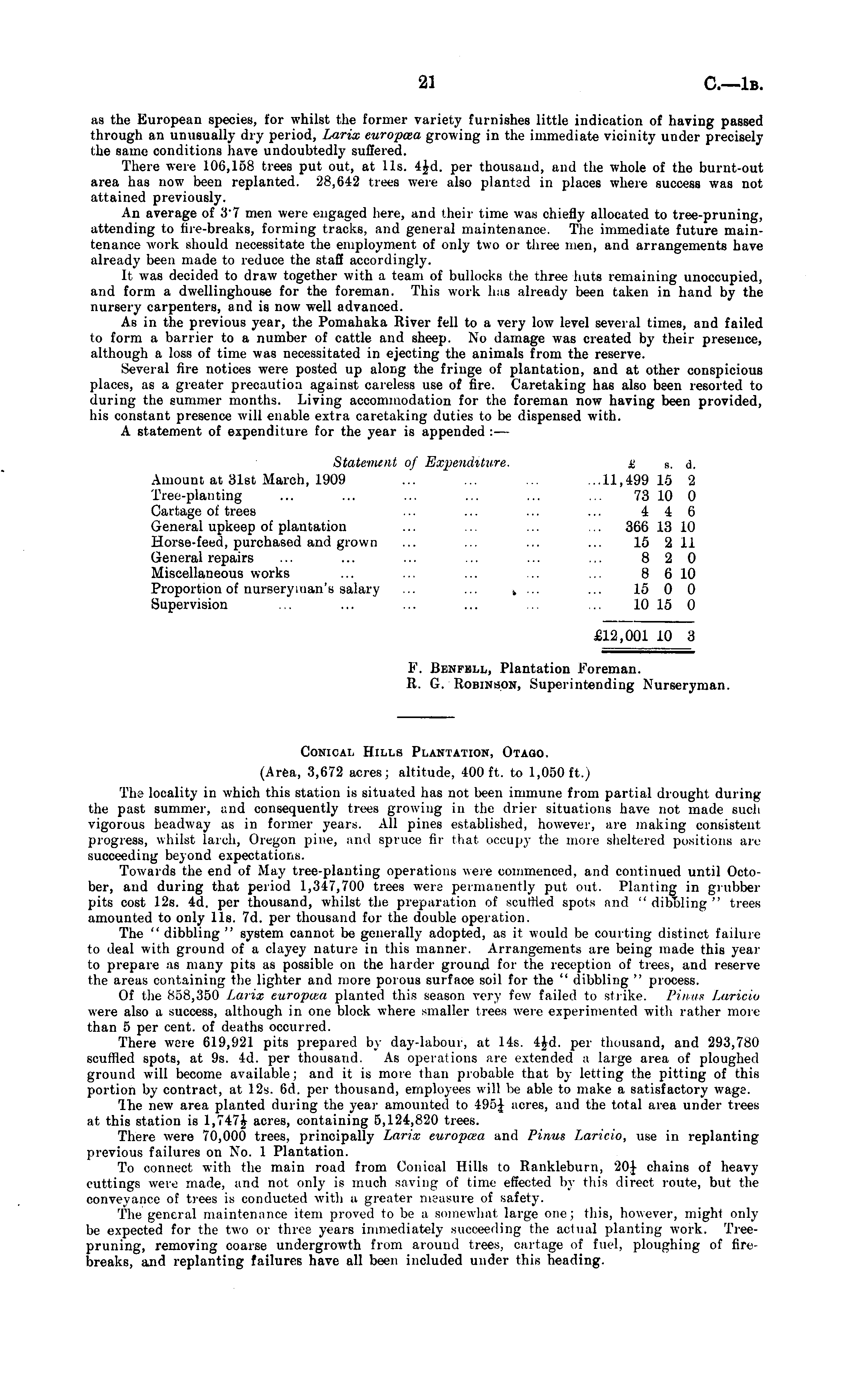 Statement of Expenditure. £ s. d. Amount at 31st March, 1909 ... ... ... ...11,499 15 2 Tree-planting ... ... ... ... ... ... 73 10 0 Cartage of trees ... ... ... ... 446 General upkeep of plantation ... ... ... ... 366 13 10 Horse-feed, purchased and grown ... ... ... ... 15 211 General repairs ... ... ... ... ... ... 820 Miscellaneous works ... ... ... ... ... 8 6 10 Proportion of nurseryman's salary ... ... v ... ••• 15 0 0 Supervision ... ... ... ... ... ... 10 15 0 £12,001 10 3 F. Benfbll, Plantation Foreman. R. G. Robinson, Superintending Nurseryman.