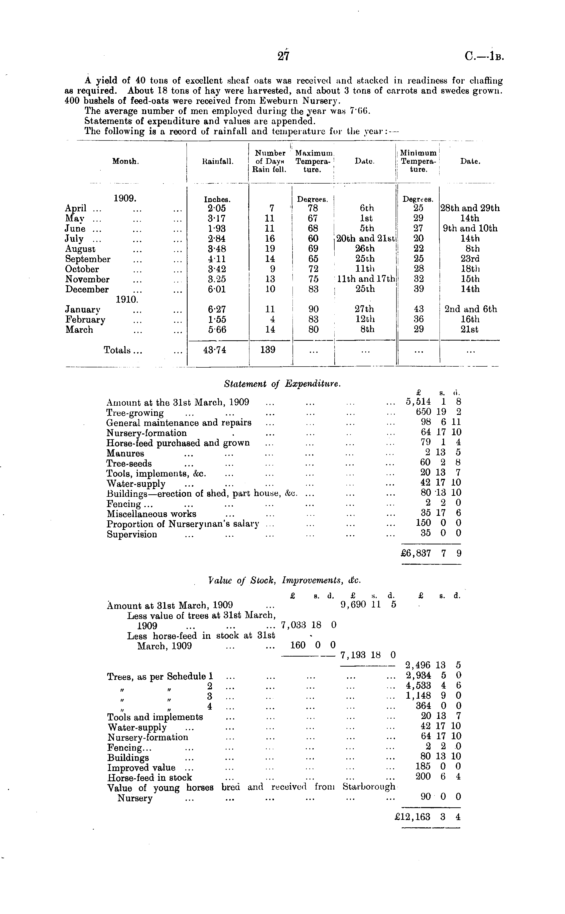 Statement of Expenditure. £ s. d. Amount at the 31st March, 1909 ... ... ... ... 5,514 1 8 Tree-growing ... ... ... ... ... ... 650 19 2 General maintenance and repairs ... ... ... ■•• 98 611 Nursery-formation . ... ... ... 64 17 10 Horse-feed purchased and grown ... ... ... ... 79 1 4 Manures ... ... ... ... ... ■■■ 2 13 5 Tree-seeds ... ... ... ... ... ... 60 2 8 Tools, implements, &c. ... ... ... ■■ ••• 20 13 7 Water-supply ... ... ... ... ... ••• 42 17 10 Buildings—erection of shod, part house, Ac. ... ... ... 80 13 10 Fencing... ... ... ... ... ••• ■•• 2 2 0 Miscellaneous works ... ... • ■ • • • • 35 17 6 Proportion of Nurseryman's salary ... ... ... 150 0 0 Supervision ... ... ... ... ■•■ ... 35 0 0 £6,837 7 9 Value of Stock, Improvements, do. £ b. d. £ s. d. £ s. d. Amount at 31st March, 1909 ... 9,690 11 5 Less value of trues at 31st March, 1909 7,033 18 0 Less horse-feed in stock at 31st March, 1909 ... ... 160 0 0 7,193 18 0 2,496 13 5 Trees, as per Schedule 1 ... ... ... ... ... 2,934 5 0 2 4,533 4 6 3 ... ... ... ... .. 1,148 9 0 " „ 4 ... ... ... ... ... 364 0 0 Tools and implements ... ... • ■• ■•• ■•• 20 13 7 Water-supply ... ... ••■ ■•• •■■ ••• 42 17 10 Nursery-formation ... ... ... ... ... 64 17 10 Fencing... ... ••• • •■ ••■ ••• ••• 2 2 0 Buildings ... ... ... ■•• ••• ■•• 80 13 10 Improved value ... ... • • • • • ■ • • ■ • • 185 0 0 Horse-feed in stock ... ... ... ... ... 200 6 4 Value of young horses bred and received from Starborough Nursery ... ... ... ••• ••• ••• 90 0 0 £12,163 3 4