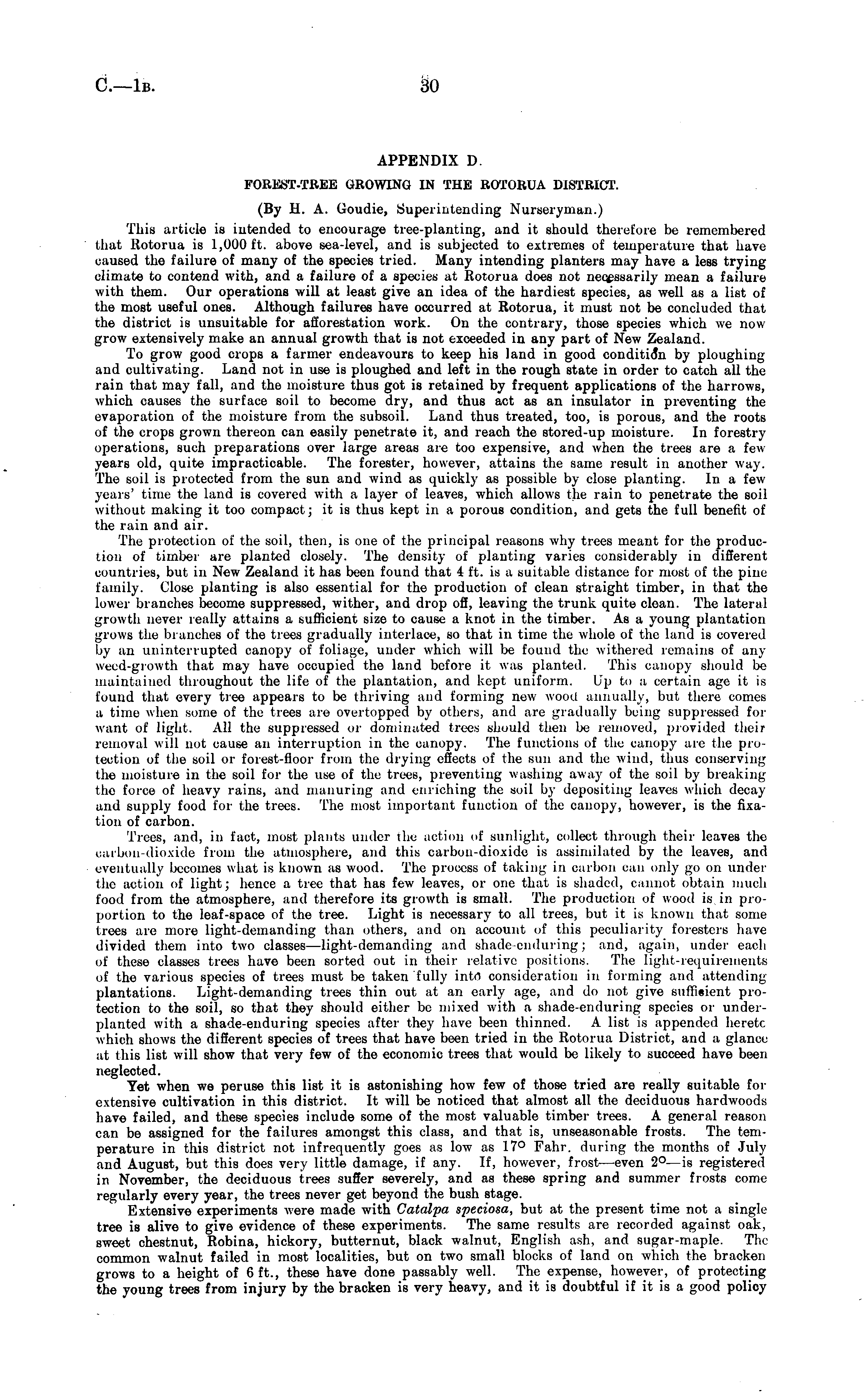 APPENDIX D. FOREST-TREE GROWING IN THE ROTORUA DISTRICT. (By H. A. Goudie, Superintending Nurseryman.) This article is intended to encourage tree-planting, and it should therefore be remembered that ilotorua is 1,000 ft. above sea-level, and is subjected to extremes of temperature that have caused the failure of many of the species tried. Many intending planters may have a less trying climate to contend with, and a failure of a species at Rotorua does not necessarily mean a failure with them. Our operations will at least give an idea of the hardiest species, as well as a list of the most useful ones. Although failures have occurred at Rotorua, it must not be concluded that the district is unsuitable for afforestation work. On the contrary, those species which we now grow extensively make an annual growth that is not exceeded in any part of New Zealand. To grow good crops a farmer endeavours to keep his land in good condition by ploughing and cultivating. Land not in use is ploughed and left in the rough state in order to catch all the rain that may fall, and the moisture thus got is retained by frequent applications of the harrows, which causes the surface soil to become dry, and thus act as an insulator in preventing the evaporation of the moisture from the subsoil. Land thus treated, too, is porous, and the roots of the crops grown thereon can easily penetrate it, and reach the stored-up moisture. In forestry operations, such preparations over large areas are too expensive, and when the trees are a few years old, quite impracticable. The forester, however, attains the same result in another way. The soil is protected from the sun and wind as quickly as possible by close planting. In a few years' time the land is covered with a layer of leaves, which allows the rain to penetrate the soil without making it too compact; it is thus kept in a porous condition, and gets the full benefit of the rain and air. The protection of the soil, then, is one of the principal reasons why trees meant for the production of timber are planted closely. The density of planting varies considerably in different countries, but in New Zealand it has been found that 4 ft. is a suitable distance for most of the pine family. Close planting is also essential for the production of clean straight timber, in that tho lower branches become suppressed, wither, and drop off, leaving the trunk quite clean. The lateral grow th never really attains a sufficient size to cause a knot in the timber. As a young plantation grows the branches of the trees gradually interlace, so that in time the whole of the land is covered by an uninterrupted canopy of foliage, under which will be found the withered remains of any weed-growth that may have occupied the land before it was planted. This canopy should be maintained throughout the life of the plantation, and kept uniform. Up to a certain age it is found that every tree appears to be thriving and forming new wood annually, but there comes a time when some of the trees are overtopped by others, and are gradually being suppressed for want of light. All the suppressed or dominated trees should then Ix; removed, provided their removal will not cause an interruption in the canopy. The functions of the canopy arc Ihe protection of the soil or forest-floor from the drying effects of the sun and the wind, thus conserving the moisture in the soil for the use of the trees, preventing washing away of the soil by breaking the force of heavy rains, and manuring and enriching the soil by depositing leaves which decay and supply food for the trees. The most important function of the canopy, however, is the fixation of carbon. Trees, and, in fact, most plants under the action of sunlight, collect through their leaves the carbon-dioxide from the atmosphere, and this carbon-dioxide is assimilated by the leaves, and eventually becomes what is known as wood. The process of taking in carbon can only go on under the action of light; hence a tree that has few leaves, or one that is shaded, cannot obtain much food from the atmosphere, and therefore its growth is small. The production of wood is in proportion to the leaf-space of the tree. Light is necessary to all trees, but it is known that some trees arc more light-demanding than others, and on account of this peculiarity foresters have divided them into two classes —light-demanding and shade enduring; and, again, under each of these classes trees have been sorted out in their relative positions. The light-requirements of the various species of trees must be taken fully into consideration in forming and attending plantations. Light-demanding trees thin out at an early age, and do not give suffisient protection to the soil, so that they should either be mixed with a shade-enduring species or underplanted with a shade-enduring species after they have been thinned. A list is appended hcretc which shows the different species of trees that have been tried in the Rotorua District, and a glance at this list will show that very few of the economic trees that would be likely to succeed have been neglected. Yet when we peruse this list it is astonishing how few of those tried are really suitable for extensive cultivation in this district. It will be noticed that almost all the deciduous hardwoods have failed, and these species include some of the most valuable timber trees. A general reason can be assigned for the failures amongst this class, and that is, unseasonable frosts. The temperature in this district not infrequently goes as low as 17° Fahr. during the months of July and August, but this does very little damage, if any. If, however, frost —even 2°—is registered in November, the deciduous trees suffer severely, and as these spring and summer frosts come regularly every year, the trees never get beyond the bush stage. Extensive experiments were made with Catalpa speciosa, but at the present time not a single tree is alive to give evidence of these expe