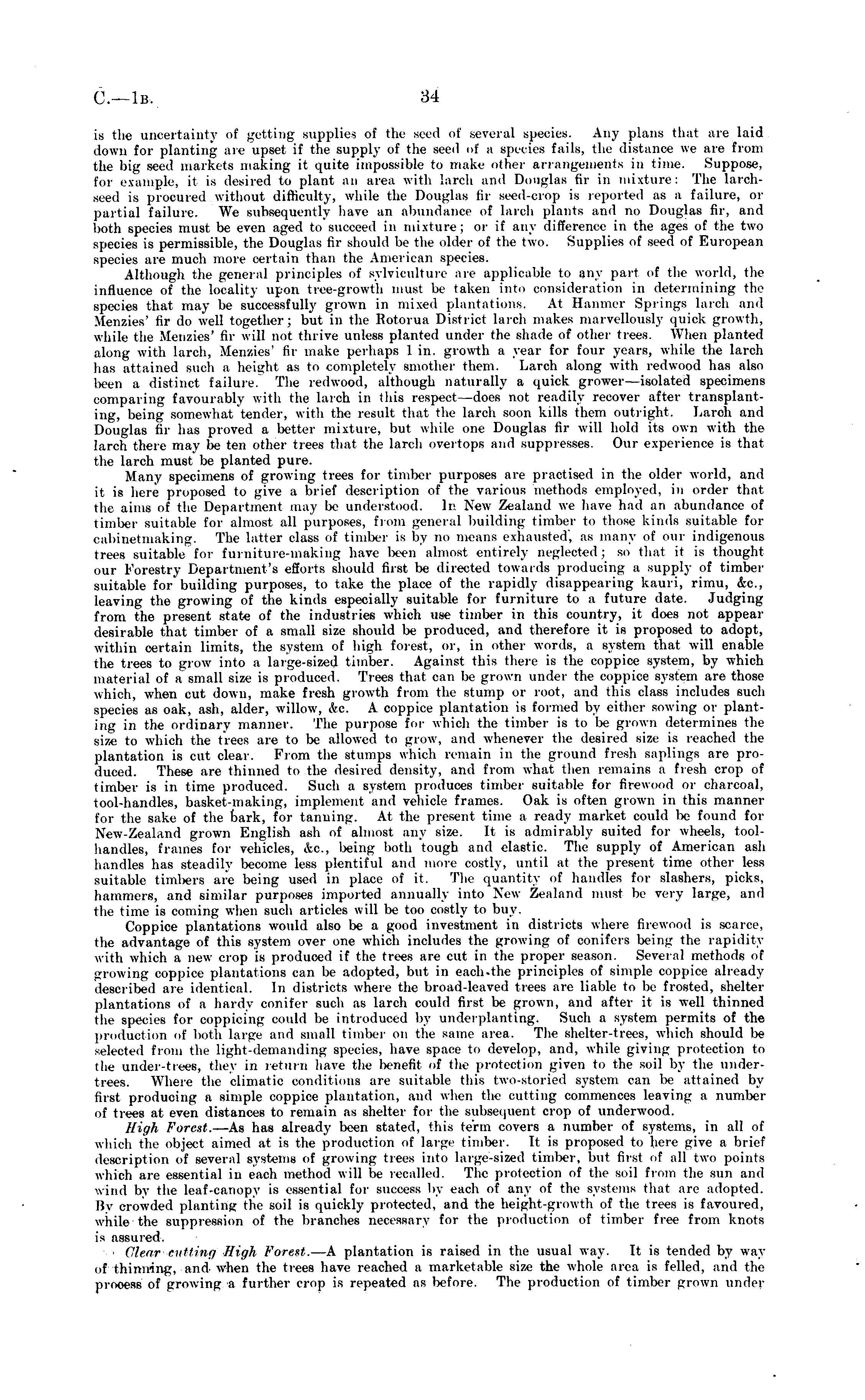 is the uncertainty of getting supplies of the seed of several species. Any plans that are laid down for planting are upset if the supply of the seed of a species fails, the distance we are from the big seed markets making it quite impossible to make other arrangements in time. Suppose, for example, it is desired to plant an area with larch and Douglas fir in mixture: The larchseed is procured without difficulty, while the Douglas fir seed-crop is reported as a failure, or partial failure. We subsequently have an abundance of larch plants and no Douglas fir, and both species must be even aged to succeed in mixture; or if any difference in the ages of the two species is permissible, the Douglas fir should be the older of the two. Supplies of seed of European species are much more certain than the American species. Although the general principles of sylviculture are applicable to any part of the world, the influence of the locality upon tree-growth must be taken into consideration in determining the species that may be successfully grown in mixed plantations. At Hanmer Springs larch and Menzies' fir do well together; but in the Rotorua District larch makes marvellously quick growth, while the Menzies' fir will not thrive unless planted under the shade of other trees. When planted along with larch, Menzies' fir make perhaps I in. growth a year for four years, while the larch has attained such a height as to completely smother them. Larch along with redwood has also been a distinct failure. The redwood, although naturally a quick grower —isolated specimens comparing favourably with the latch in this respect docs not readily recover after transplanting, being somewhat tender, with the result that the larch soon kills them outright. Larch and Di.ue.las fir has proved a better mixture, but while one Douglas fir will hold its own with the larch there may be ten other trees that the larch overtops and suppresses. Our experience is that the larch must be planted pure. Many specimens of growing trees for timber purposes are practised in the older world, and it is here proposed to give a brief description of the various methods employed, in order that the aims of the Department may be understood. In New Zealand we have bad an abundance of timber suitable for almost all purposes, from general building timber to those kinds suitable for cabinetmaking. The latter class of timber is by no means exhausted', as many of our indigenous trees suitable for furniture-making have been almost entirely neglected; so that it is thought our Forestry Department's efforts should first be directed towards producing a supply of timber suitable for'building purposes, to take the place of the rapidly disappearing kauri, rimu, &c, leaving the growing of the kinds especially suitable for furniture to a future date. Judging from the present state of the industries which use timber in this country, it does not appear desirable that timber of a small size should be produced, and therefore it is proposed to adopt, within certain limits, the system of high forest, or, in other words, a system that will enable the trees to grow into a large-sized timber. Against this there is the coppice system, by which material of a small size is produced. Trees that can be grown tinder the coppice system are those which, when cut down, make fresh growth from the stump or root, and this class includes such species as oak, ash, alder, willow, &c, A coppice plantation is formed by either sowing or planting in the ordinary manner. The purpose for which the timber is to be grown determines the size to which the trees are to be allowed to grow, and whenever the desired size is reached the plantation is cut clear. From the stumps which remain in the ground fresh saplings are produced. These are thinned to the desired density, and from what then remains a fresh crop of timber is in time produced. Such a system produces timber suitable for firewood or charcoal, tool-handles, basket-making, implement and vehicle frames. Oak is often grown in this manner for the sake of the bark, for tanning. At the present time a ready market could lie found for New-Zealand grown English ash of almost any size. It is admirably suited for wheels, toolhandles, frames for vehicles, &c, lieing both tough and elastic. The supply of American ash handles has steadily become less plentiful and more costly, until at the present time other less suitable timl>ers are being used in place of it. The quantity of handles for slashers, picks, hammers, and similar purposes imported annually into New Zealand must be very large, and the time is coming when such articles will be too costly to buy. Coppice plantations would also lie a good investment in districts where firewood is scarce, the advantage of this system over one which includes the growing of conifers being the rapidity with which a new crop is produced if the trees are cut in the proper season. Several methods of growing coppice plantations can In- adopted, but in each.the principles of simple coppice already described are identical. In districts where the broad-leaved trees are liable to be frosted, shelter plantations of a hardy conifer such as larch could first be grown, and after it is well thinned the species for coppicing could be introduced by underplanting. Such a system permits of the production of both large and small timber on the same area. The shelter-trees, which should be selected from the light-demanding species, have space to develop, and, while giving protection to the under-trees. they in return have the lienefit of the protection given to the soil by the undertrees. Where the climatic conditions tire suitable this two-storied system can lie attained by lirst producing a simple coppice plantation, and when the cutting commences leaving a number of trees at even distances to remain as shelter for the subsequent crop of underwood. High Forest. —As has already been stated, this term covers a number of syste