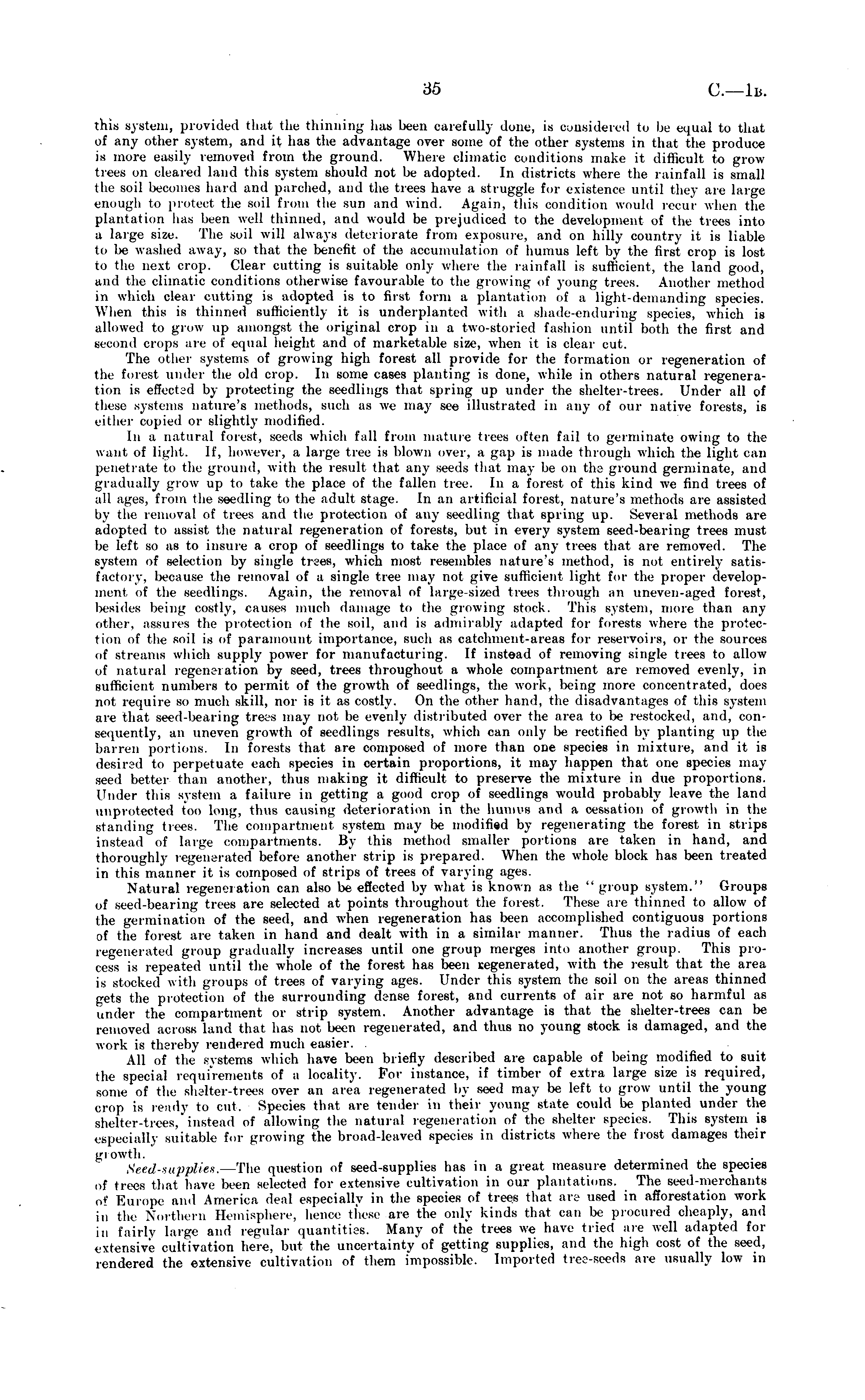 this system, provided that the thinning has l>een carefully done, is considered to be equal to that of any other system, and it has the advantage over some of the other systems in that the produce is mure easily removed from the ground. Where climatic conditions make it difficult to grow trees on cleared land this system should not be adopted. In districts where the rainfall is .small the soil becomes hard and parched, and the trees have a struggle for existence until they are large enough to protect the soil from the sun and wind. -Again, this condition would recur when the plantation has been well thinned, and would be prejudiced to the development of the trees into a large size. The soil will always deteriorate from exposure, and on hilly country it is liable lo l>o washed away, so that the benefit of the accumulation of humus left by the first crop is lost to the next crop. Clear cutting is suitable only where the rainfall is sufficient, the land good, and the climatic conditions otherwise favourable to the growing of young trees. Another method in which clear cutting is adopted is to first form a plantation of a light-demanding species. When this is thinned sufficiently it is underplanted with a shade-enduring species, which is allowed to grow up a ngst the original crop in a two-storied fashion until both the first and second crops arc of equal height and of marketable size, when it is clear cut. The other systems of growing high forest all provide for the formation or regeneration of the forest under the old crop. In some cases planting is done, while in others natural regeneration is effected by protecting the seedlings that spring up under the shelter-trees. Under all of these systems nature's methods, such as we may see illustrated in any of our native forests, is cither copied or slightly modified. In a natural forest, seeds which fall from mature trees often fail to germinate owing to the want of light. If, however, a large tree is blown over, a gap is made through which the light can penetrate to the ground, with the result that any seeds that may be on the ground germinate, and gradually grow up to take the place of the fallen tree. In a forest of this kind we find trees of all ages, from the seedling to the adult stage. In an artificial forest, nature's methods are assisted by the removal of trees and the protection of any seedling that spring up. Several methods are adopted to assist the natural regeneration of forests, but in every system seed-bearing trees must be left so as to insure a crop of seedlings to take the place of any trees that are removed. The system of selection by single trees, which most resembles nature's method, is not entirely satisfactory, because the removal of a single tree may not give sufficient light for the proper development of the seedlings. Again, the removal of large-sized trees through an uneven-aged forest, besides being costly, causes much damage to the growing stock. This system, more than any other, assures the protection of the soil, and is admirably adapted for forests where the protection iif the snil is of paramount importance, such us catchment-areas for reservoirs, or the sources of streams which supply power for manufacturing. If instead of removing single trees to allow of natural regeneration by seed, trees throughout a whole compartment are removed evenly, in Bttfficient numbers to permit of the growth of seedlings, the work, being more concentrated, does not require so much skill, nor is it as costly. On the Other hand, the disadvantages of this system are that seed-bearing tiees may not be evenly distributed over the area to l>e restocked, and, consequently, an uneven growth of seedlings results, which can only be rectified by planting up the barren portions. In forests that are composed of more than one species in mixture, and it is desired to perpetuate each species in certain proportions, it may happen that one species may seed better than another, thus making it difficult to preserve the mixture in due proportions. Under this ttystem a failure in getting a good crop of seedlings would probably leave the land unprotected too long, thus causing deterioration in the humus and a cessation of growth in the standing trees. The compartment system may be mollified by regenerating the forest in strips instead of large compartments. By this method smaller portions are taken in hand, and thoroughly regenerated before another strip is prepared. When the whole block has been treated in this manner it is composed of strips of trees of varying ages. Natural regeneration can also be effected by what is known as the "group system." Groups of seed-bearing trees are selected at points throughout the forest. These are thinned to allow of the germination of the seed, and when regeneration has been accomplished contiguous portions of the forest are taken in hand and dealt with in a similar manner. Thus the radius of each regenerated group gradually increases until one group merges into another group. This process is repeated until the whole of the forest has been regenerated, with the result that the area is stocked with groups of trees of varying ages. Under this system the soil on the areas thinned gets the protection of the surrounding dense forest, and currents of air are not so harmful as under the compartment or strip system. Another advantage is that the shelter-trees can be removed across land that has not been regenerated, and thus no young stock is damaged, and the work is thereby rendered much easier. All of the systems which have been briefly described are capable of being modified to suit the special requirements of a locality. For instance, if timber of extra large size is required, some of the shelter-trees over an area regenerated by seed may be left to grow until the young orbp is ready to cut. Species that are tender in their young state could be planted under the shelter-trees, instead of allowing the natural regeneration 