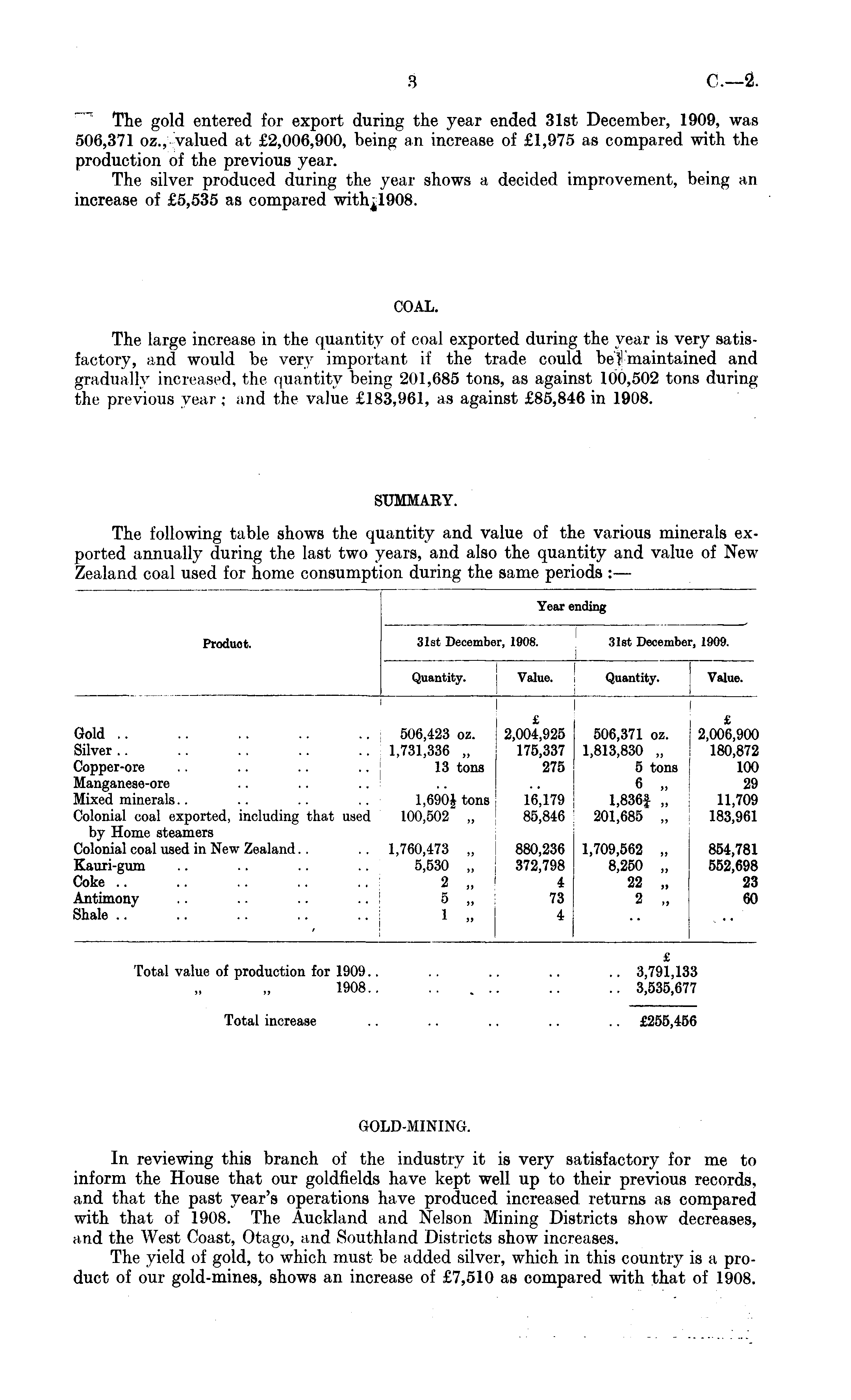 £ Total value of production for 1909.. .. .. .. .. 3,791,133 1908.. .. ... .. 3,535,677 Total increase .. .. .. .. .. £255,456 GOLD-MINING. In reviewing this branch of the industry it is very satisfactory for me to inform the House that our goldfields have kept well up to their previous records, and that the past year's operations have produced increased returns as compared with that of 1908. The Auckland and Nelson Mining Districts show decreases, and the West Coast, Otago, and Southland Districts show increases. The yield of gold, to which must be added silver, which in this country is a product of our gold-mines, shows an increase of £7,510 as compared with that of 1908.
