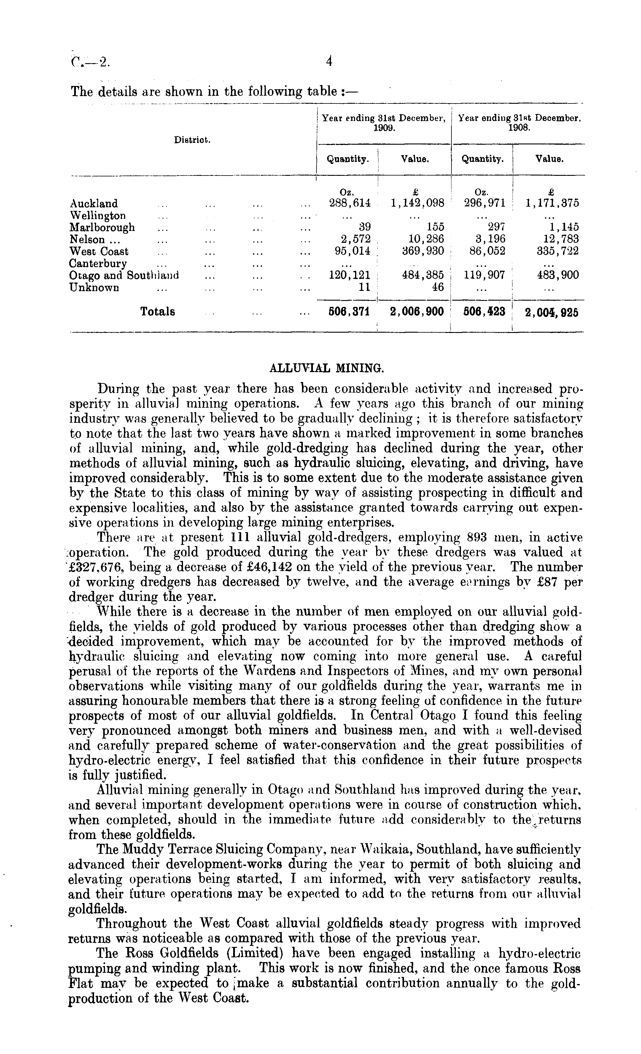 ALLUVIAL MINING. During the past year there has been considerable activity and increased prosperity in alluvial mining operations. A few years ago this branch of our mining industry was generally believed to be gradually declining ; it is therefore satisfactory to note that the last two years have shown a marked improvement in some branches of alluvial mining, and, while gold-dredging has declined during the year, other methods of alluvial mining, such as hydraulic sluicing, elevating, and driving, have improved considerably. This is to some extent due to the moderate assistance given by the State to this class of mining by way of assisting prospecting in difficult and expensive localities, and also by the assistance granted towards carrying out expensive operations in developing large mining enterprises. There are at present 111 alluvial gold-dredgers, employing 893 men, in active :operation. The gold produced during the year by these dredgers was valued at £327.676, being a decrease of £46,142 on the yield of the previous year. The number of working dredgers has decreased by twelve, and the average earnings by £87 per dredger during the year. \\"hile there is a decrease in the number of men employed on our alluvial goldfields, the yields of gold produced by various processes other than dredging show a decided improvement, which may be accounted for by the improved methods of hydraulic sluicing and elevating now coming into more general use. A careful perusal of the reports of the Wardens and Inspectors of Mines, and my own personal observations while visiting many of our goldfields during the year, warrants me in assuring honourable members that there is a strong feeling of confidence in the future prospects of most of our alluvial goldfields. In Central Otago I found this feeling very pronounced amongst both miners and business men, and with a well-devised and carefully prepared scheme of water-conservation and the great possibilities of hydro-electric energy, I feel satisfied that this confidence in their future prospects is fully justified. Alluvial mining generally in Otago and Southland has improved during the year. and several important development operations were in course of construction which, when completed, should in the immediate future add considerably to the.returns from these goldfields. The Muddy Terrace Sluicing Company, near Waikaia, Southland, have sufficiently advanced their development-works during the year to permit of both sluicing and elevating operations being started, I am informed, with very satisfactory results, and their future operations may be expected to add to the returns from our alluvial goldfields. Throughout the West Coast alluvial goldfields steady progress with improved returns was noticeable as compared with those of the previous year. The Ross Goldfields (Limited) have been engaged installing a hydro-electric pumping and winding plant. This work is now finished, and the once famous Ross Flat may be expected to ;make a substantial contribution annually to the goldproduction of the West Coast.