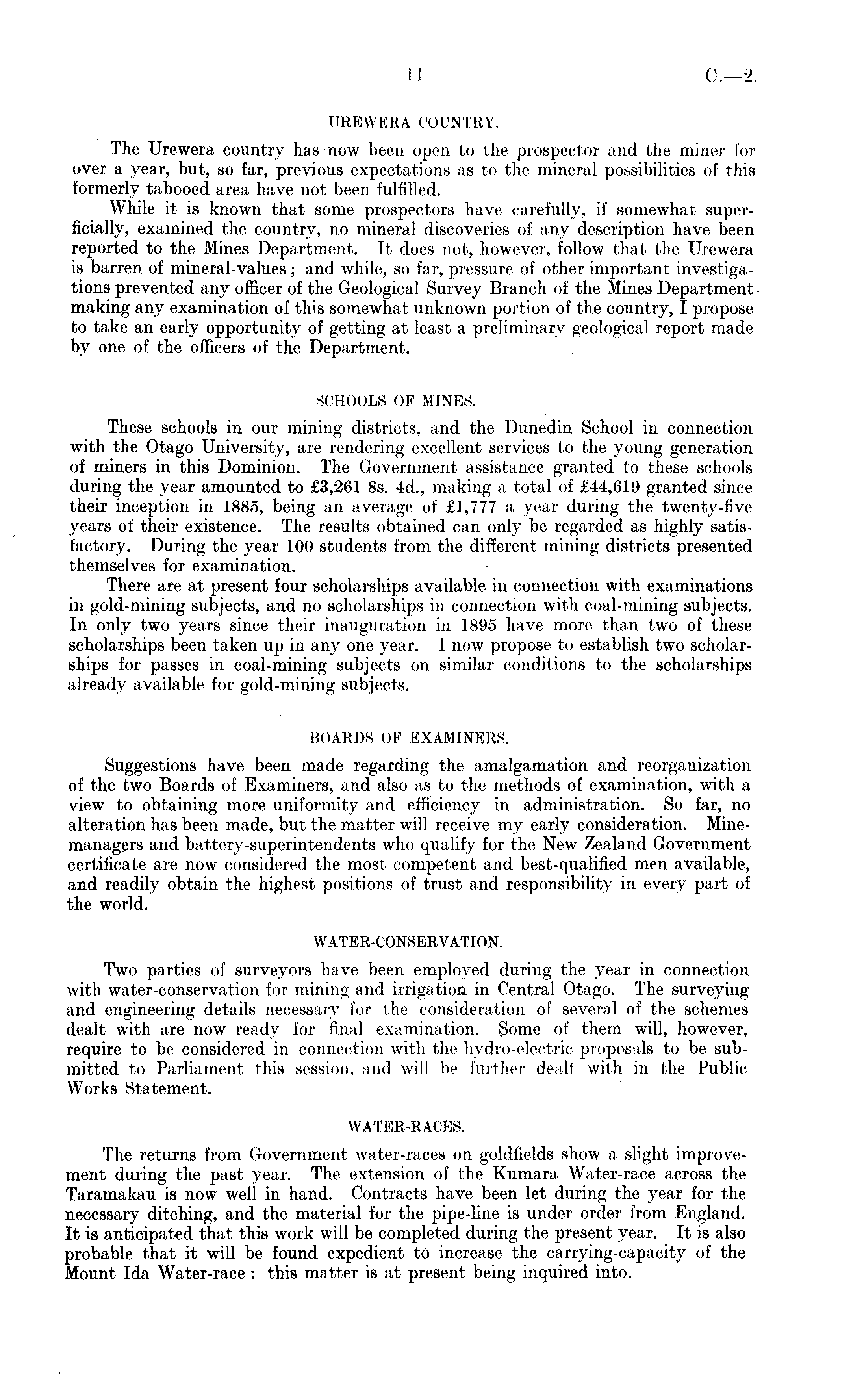 UREWERA COUNTRY. The Urewera country has now been open to the prospector and the miner for over a year, but, so far, previous expectations as to the mineral possibilities of this formerly tabooed area have not been fulfilled. While it is known that some prospectors have carefully, if somewhat superficially, examined the country, no mineral discoveries of any description have been reported to the Mines Department. It does not, however, follow that the Urewera is barren of mineral-values; and while, so far, pressure of other important investigations prevented any officer of the Geological Survey Branch of the Mines Department making any examination of this somewhat unknown portion of the country, I propose to take an early opportunity of getting at least a preliminary geological report made by one of the officers of the Department. SCHOOLS OF MINES. These schools in our mining districts, and the Dunedin School in connection with the Otago University, are rendering excellent services to the young generation of miners in this Dominion. The Government assistance granted to these schools during the year amounted to £3,261 Bs. 4d., making a total of £44,619 granted since their inception in 1885, being an average of £1,777 during the twenty-five years of their existence. The results obtained can only be regarded as highly satisfactory. During the year 100 students from the different mining districts presented themselves for examination. There are at present four scholarships available in connection with examinations in gold-mining subjects, and no scholarships in connection with coal-mining subjects. In only two years since their inauguration in 1895 have more than two of these scholarships been taken up in any one year. I now propose to establish two scholarships for passes in coal-mining subjects on similar conditions to the scholarships already available for gold-mining subjects. HOARDS OK EXAMINERS. Suggestions have been made regarding the amalgamation and reorganization of the two Boards of Examiners, and also as to the methods of examination, with a view to obtaining more uniformity and efficiency in administration. So far, no alteration has been made, but the matter will receive my early consideration. Minemanagers and battery-superintendents who qualify for the New Zealand Government certificate are now considered the most competent and best-qualified men available, and readily obtain the highest positions of trust and responsibility in every part of the world. \Y A TER-CONSER VATION. Two parties of surveyors have been employed during the year in connection with water-conservation for mining and irrigation in Central Otago. The surveying and engineering deta.ils necessary for the consideration of several of the schemes dealt with are now ready for final examination. Some of them will, however, require to be considered in connection with the hydro-electric proposals to be submitted to Parliament this session, and will be further dealt with in the Public Works Statement. WATER-RACES. The returns from Government water-races on goldfields show a slight improvement during the past year. The extension of the Kumara Water-race across the Taramakau is now well in hand. Contracts have been let during the year for the necessary ditching, and the material for the pipe-line is under order from England. It is anticipated that this work will be completed during the present year. It is also probable that it will be found expedient to increase the carrying-capacity of the Mount Ida Water-race : this matter is at present being inquired into.