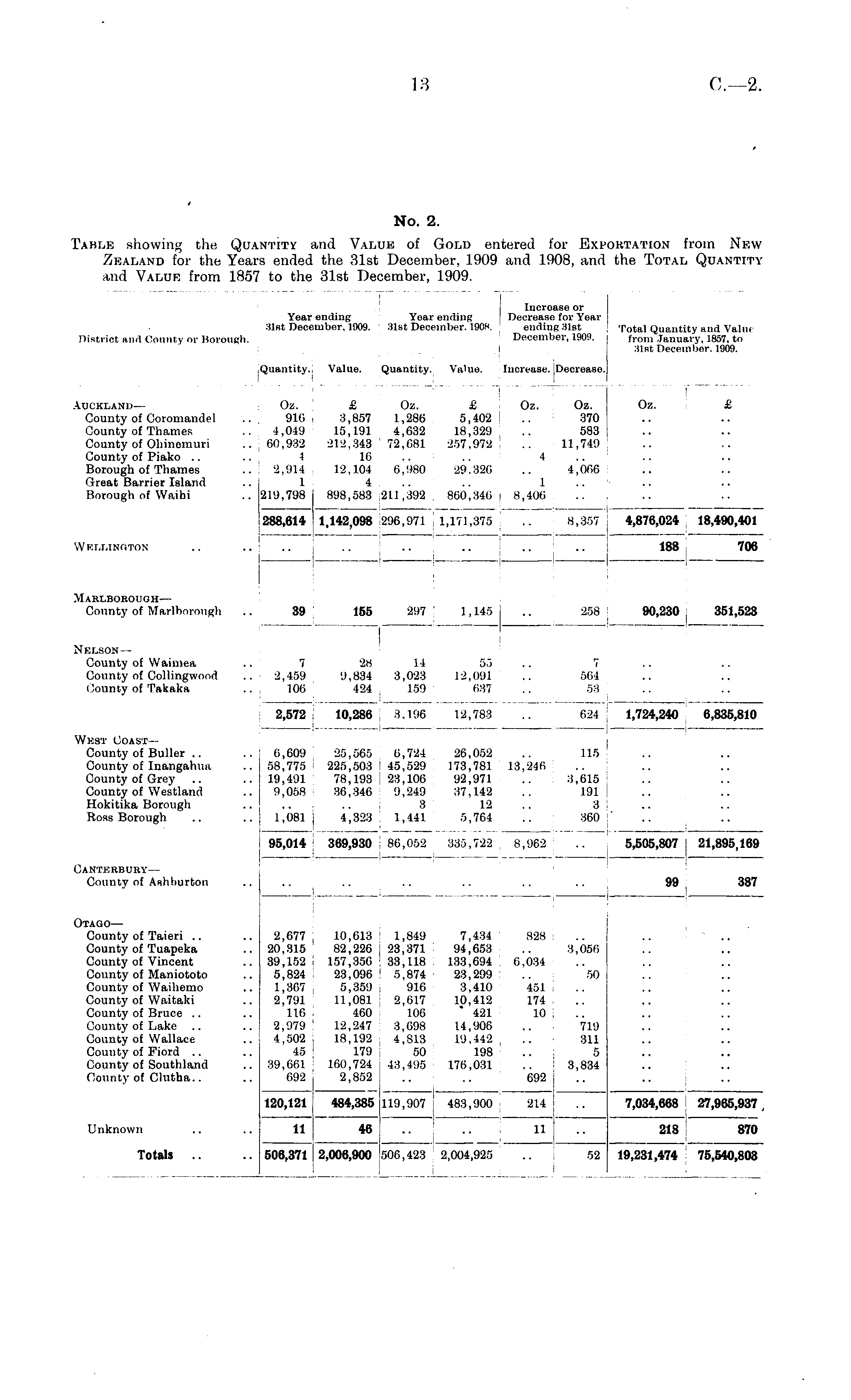No. 2. Table showing the Quantity and Value of Gold entered for Exportation from New Zealand for the Years ended the 31st December, 1909 and 1908, and the Total Quantity and Value from 1857 to the 31st December, 1909.