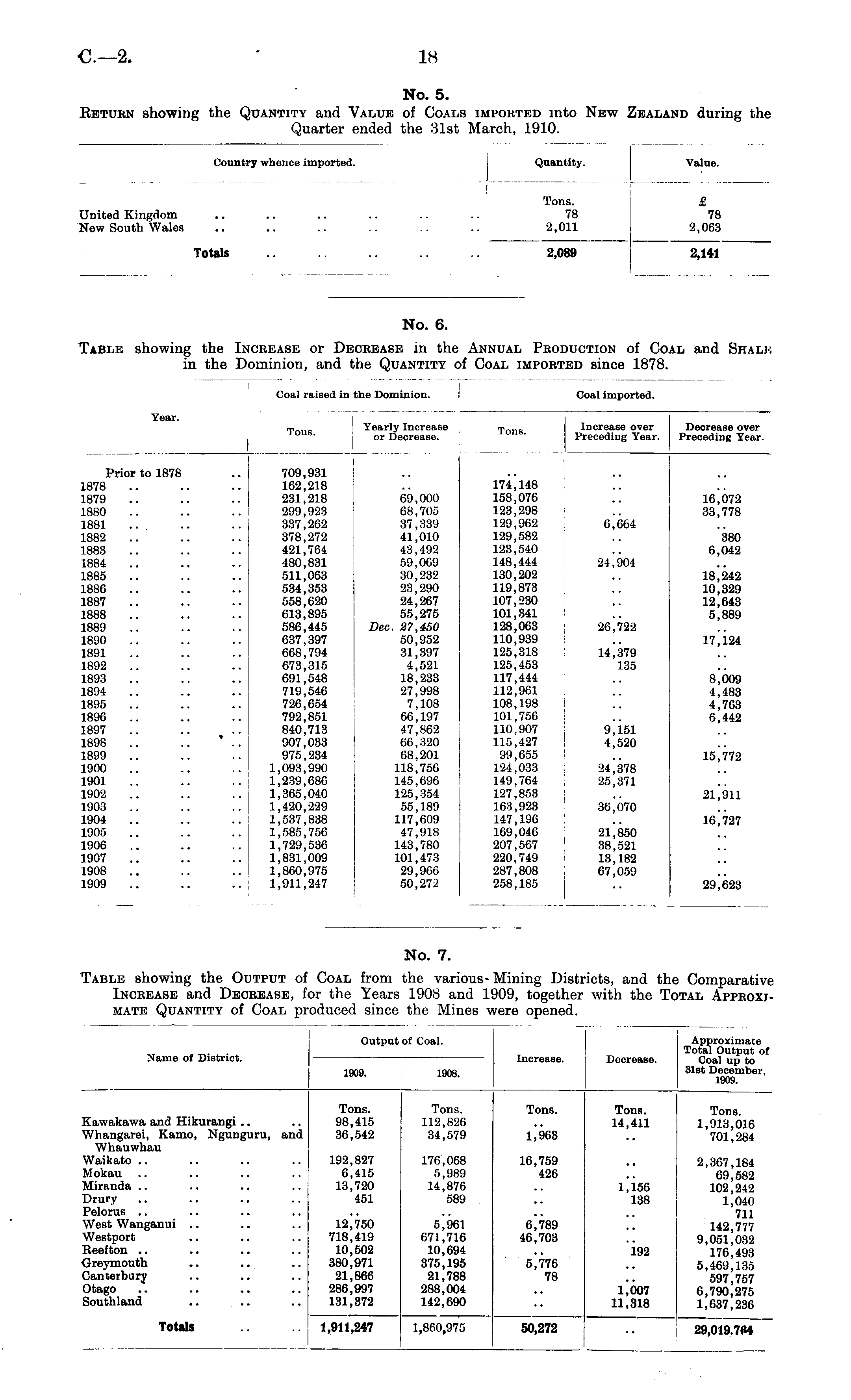 Name of District. Output of Coal. Increase. Decrease. i Approximate I Total Output of Coal up to ! 31st December. 1909. 1909. 1908. Kawakawa and Hikurangi Whangarei, Kamo, Ngunguru, and Whauwhau Waikato Mokau Miranda Drury Pelorus West Wanganui Westport Beelton Greymouth Canterbury Otago Southland Tons. 98,415 36,542 Tons. 112,826 34,579 Tons. 1,963 Tons. 14,411 Tons. 1,913,016 701,284 192,827 6,415 13,720 451 176,068 5,989 14,876 589 16,759 426 2,367,184 69,582 102,242 1,040 711 142,777 9,051,032 176,493 5,469,135 597,757 6,790,275 1,637,236 1,156 138 12,750 718,419 10,502 380,971 21,866 286,997 131,372 5,961 671,716 10,694 375,195 21,788 288,004 142,690 6,789 46,703 5,776 78 192 1,007 11,318 Totals 1,911,247 1,860,975 50,272 29,019.764